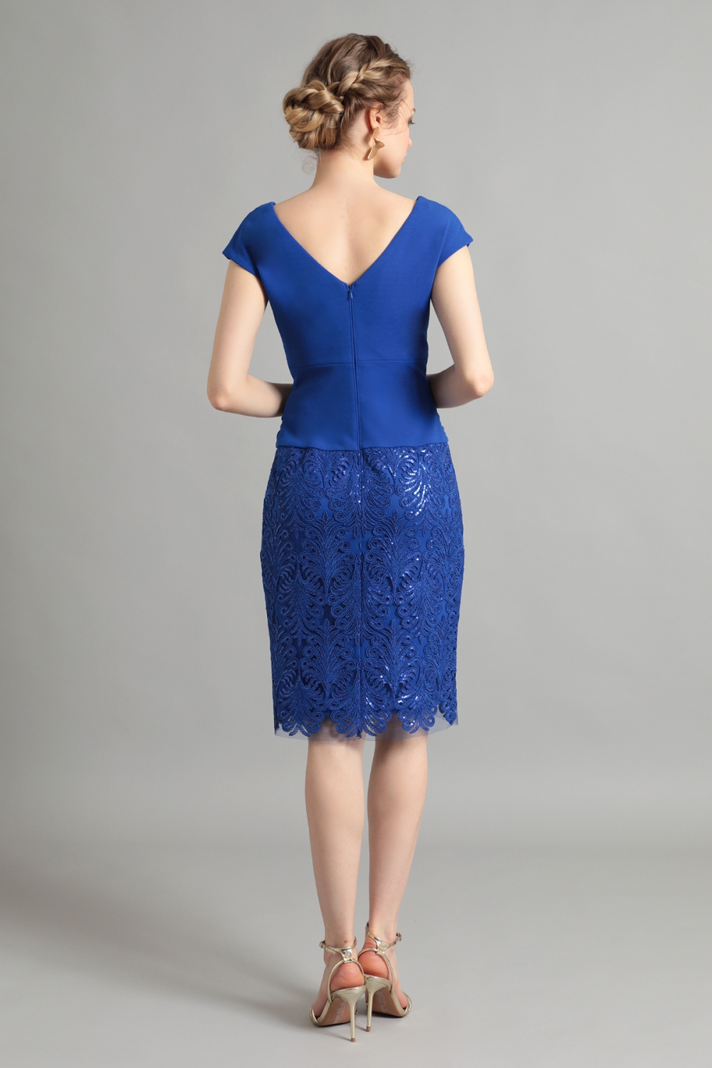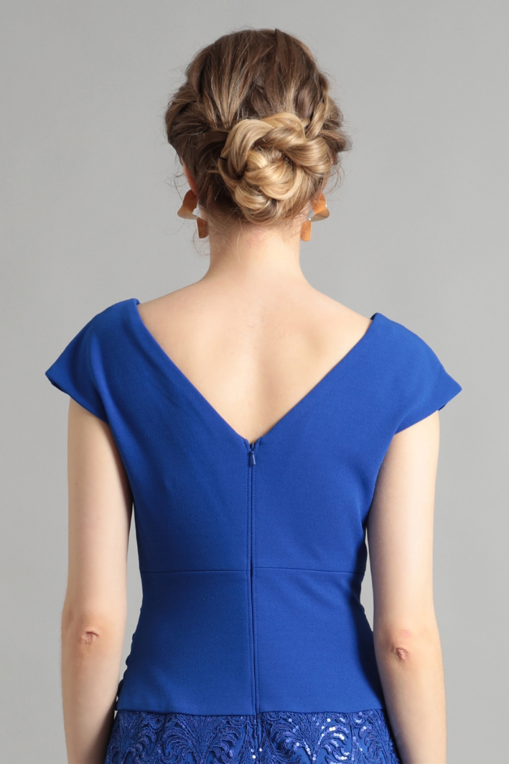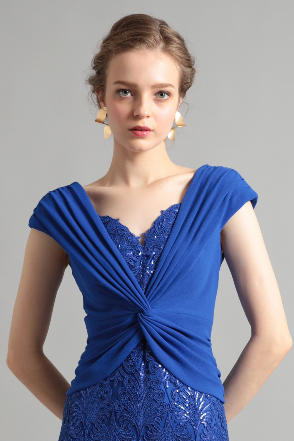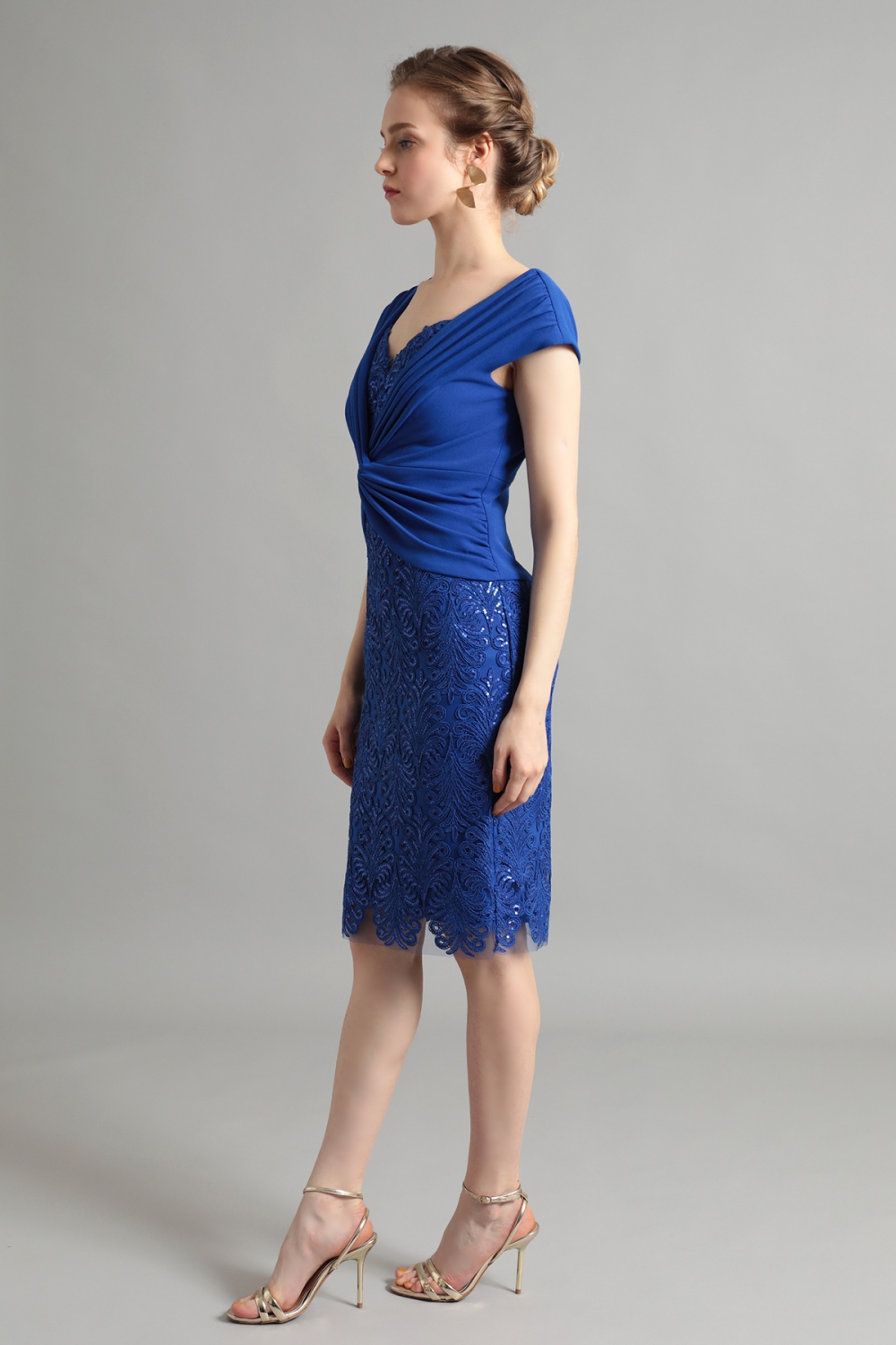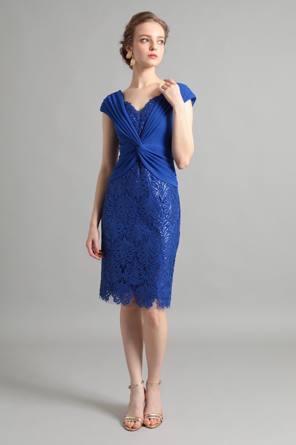 美しい刺繍レースとドレーピングのオーバーレイデザイン。鮮やかなブルーが目を引きます。レースに刺繍されたスパンコールは、ギラギラしすぎず、上品な華やかさを演出します。トップには、クロスデザインのドレープを施したクレープジャージー生地を配置し、ウエストラインをほっそりと見せつつ女性らしいシルエットを引き立てます。華やかながら、落ち着いた雰囲気です。
