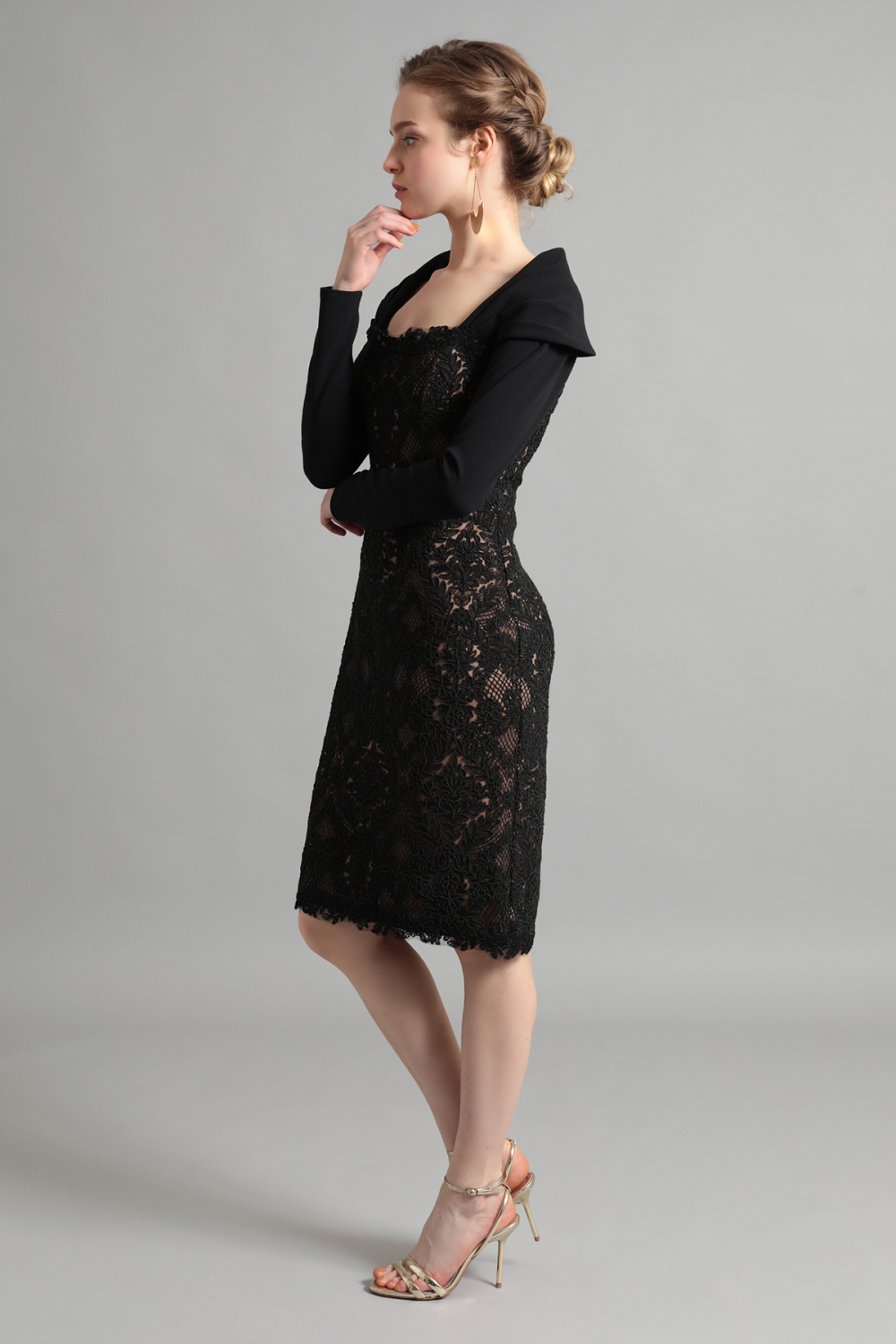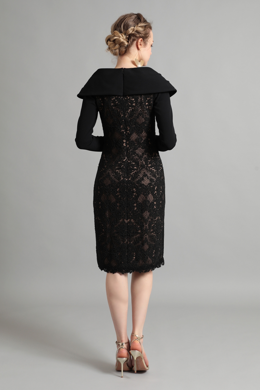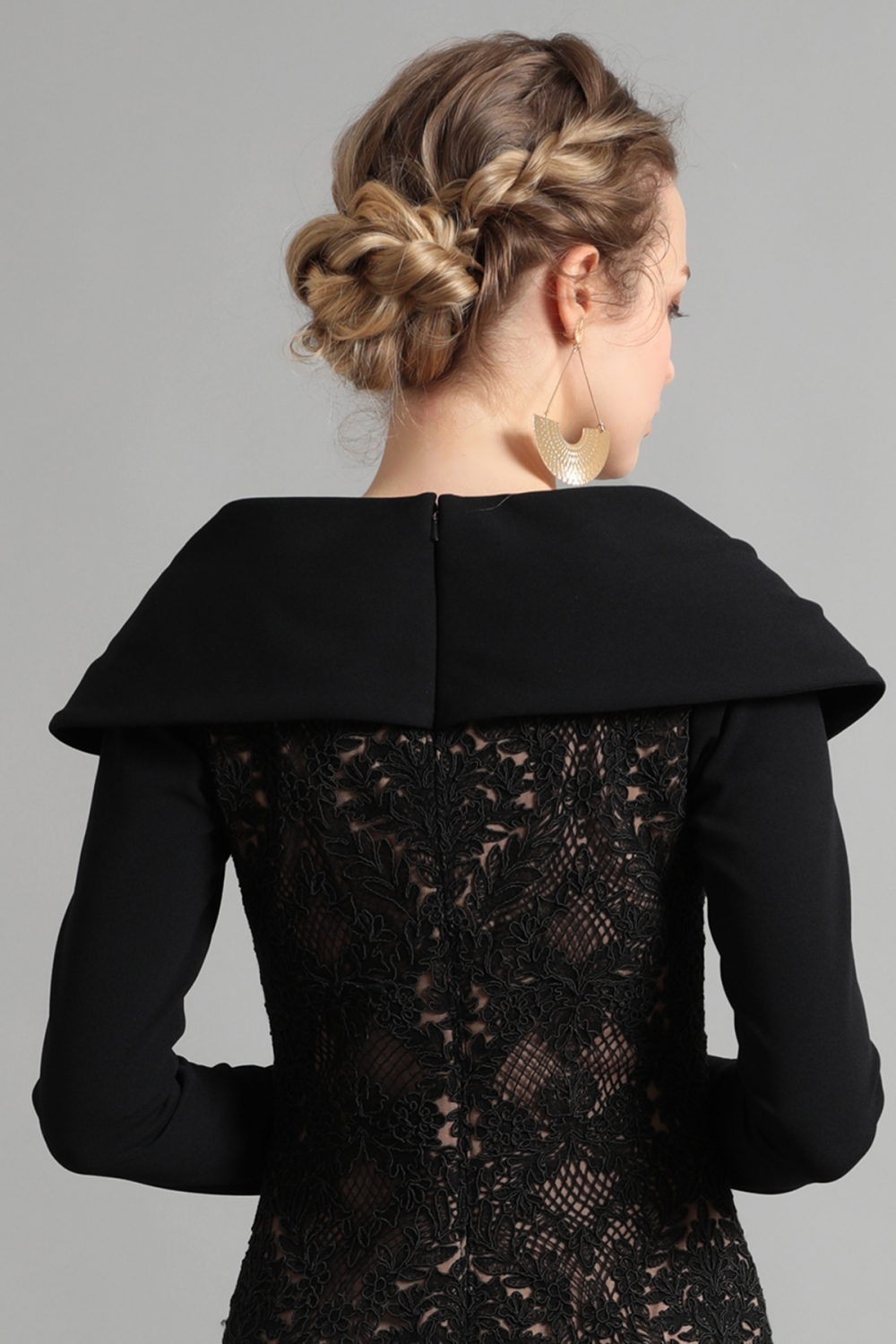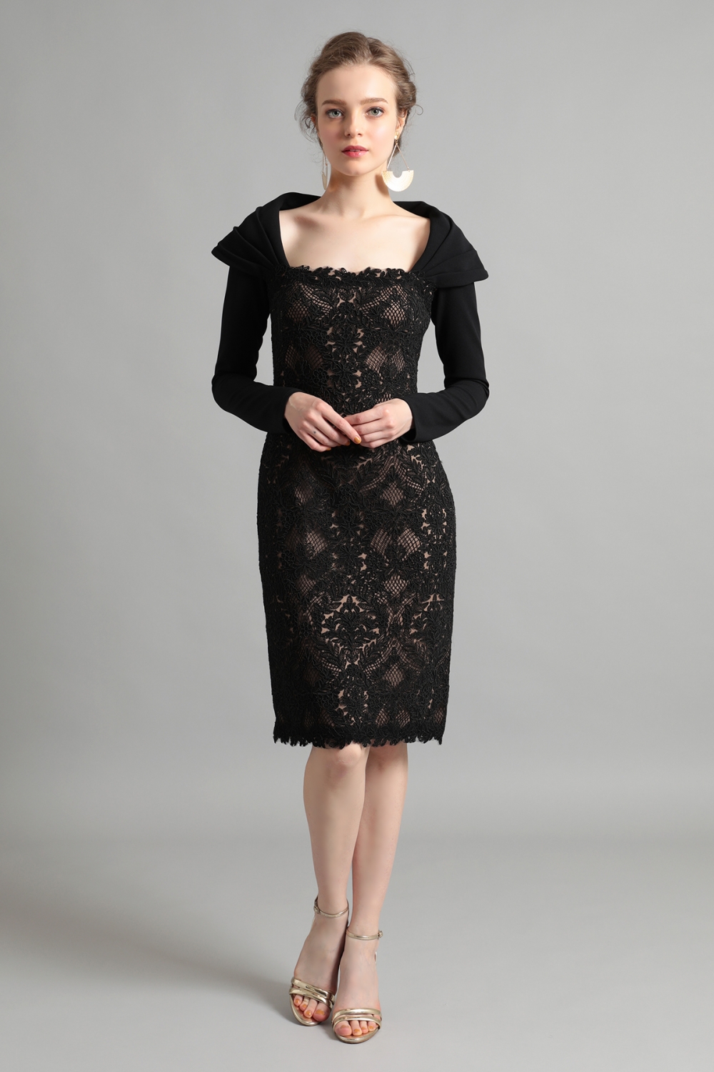 立体感のあるボタニカルレースは優雅で、リュクスな雰囲気。襟元には、特徴的なドレープが肩に優しくかかり、オフショルダー風のデザインが、デコルテを美しく見せます。袖部分はシンプルながらも、全体の刺繍とのコントラストでエレガントさをさらに引き立てています。刺繍のディテールや素材の高級感から、細部にまでこだわったクラフトマンシップを感じさせるデザインです。 モデルサイズ 身長170cm B:81cm W:58cm H:87cm /サイズ0着用 ■新作商品一覧はこちら■ □ミディアムドレス一覧はこちら□ ■ブラックの商品一覧はこちら■