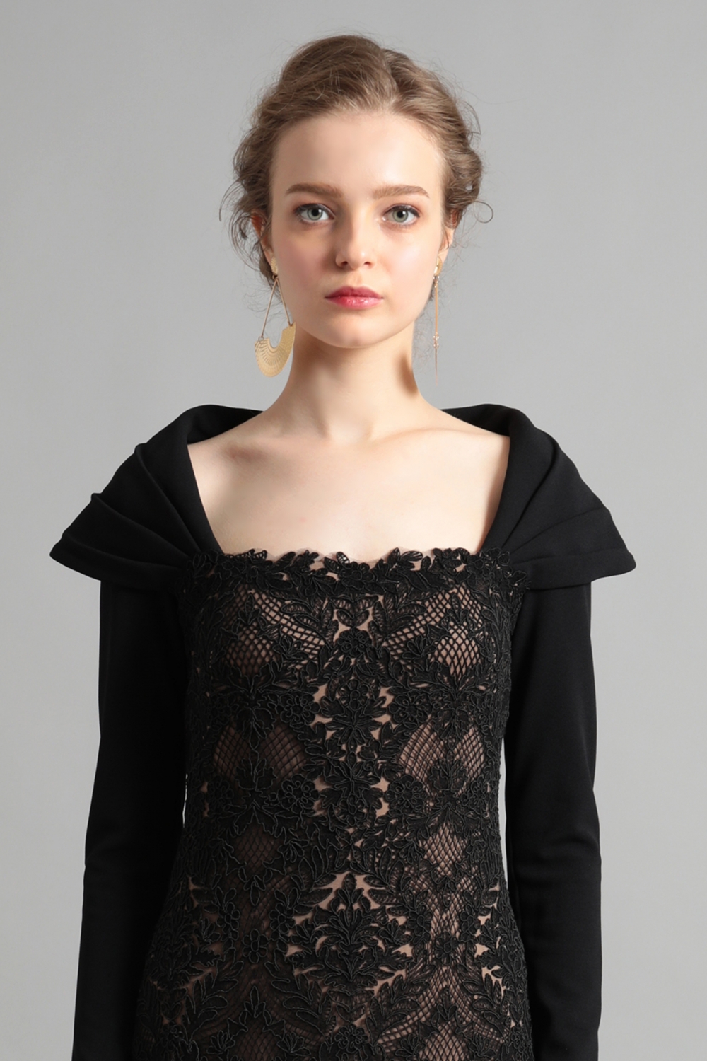 立体感のあるボタニカルレースは優雅で、リュクスな雰囲気。襟元には、特徴的なドレープが肩に優しくかかり、オフショルダー風のデザインが、デコルテを美しく見せます。袖部分はシンプルながらも、全体の刺繍とのコントラストでエレガントさをさらに引き立てています。刺繍のディテールや素材の高級感から、細部にまでこだわったクラフトマンシップを感じさせるデザインです。