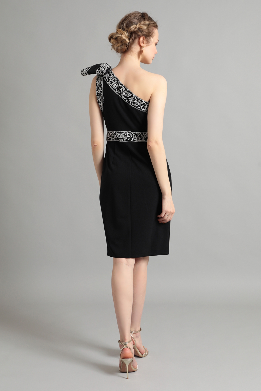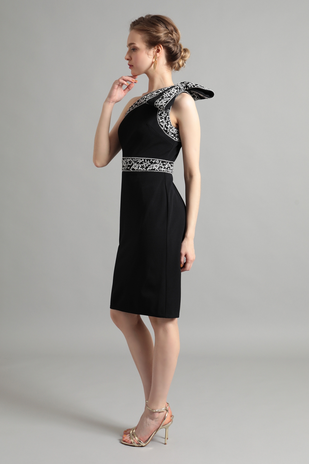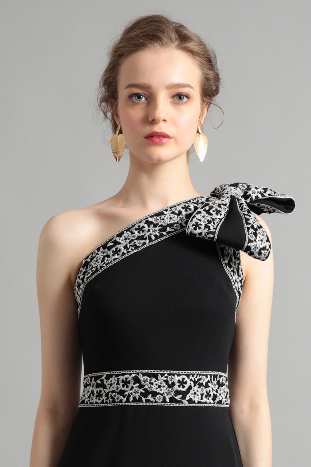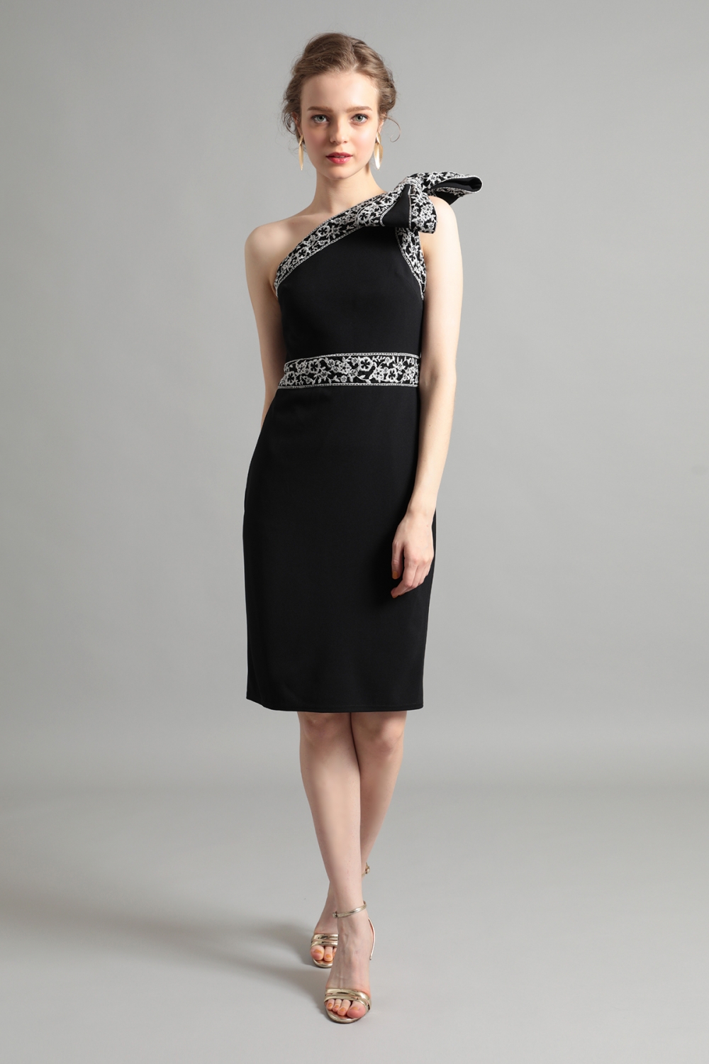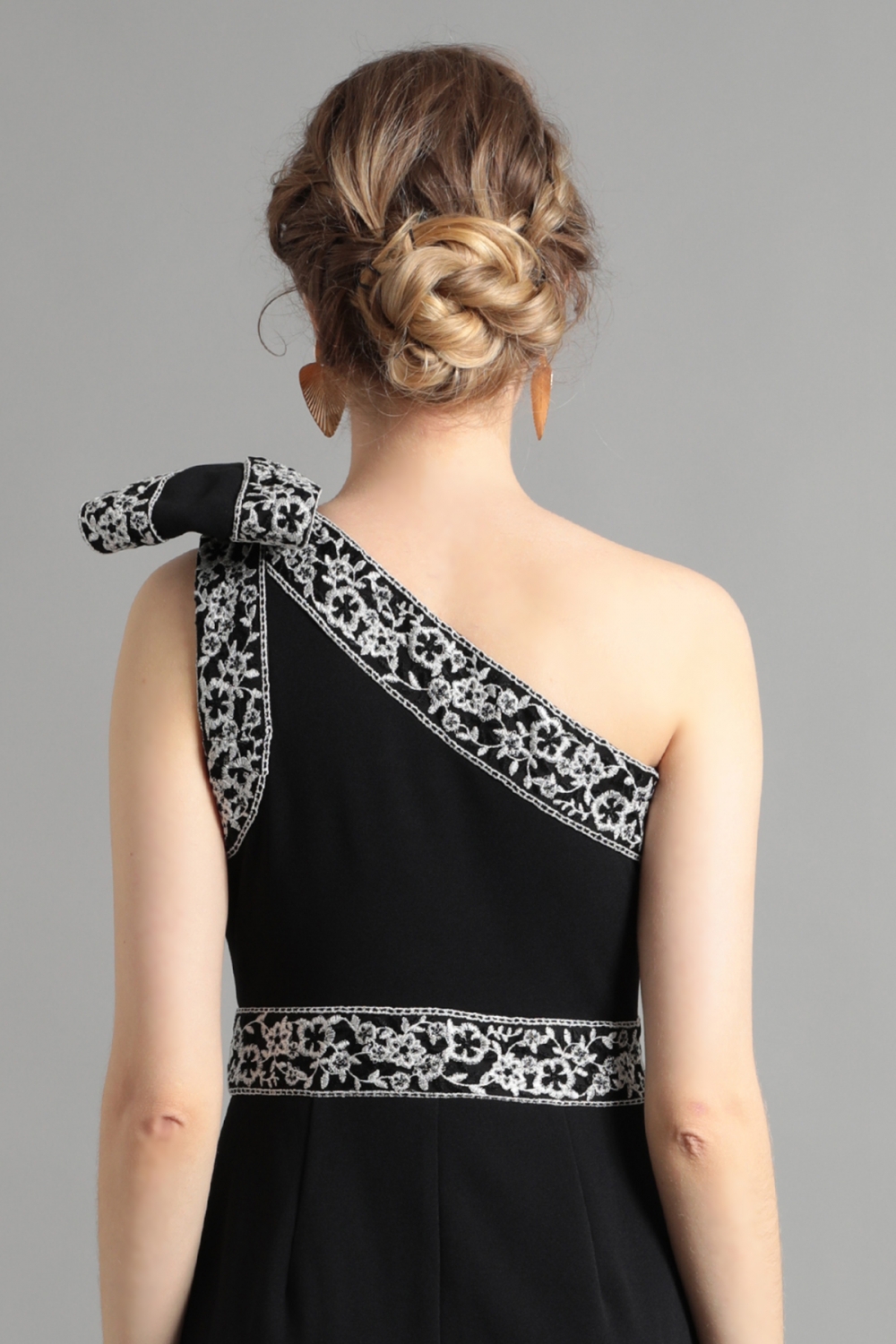 シックなブラックを基調としたエレガントなワンショルダードレス。上品さと洗練されたデザインが魅力的です。肩にあしらわれた大きなリボンがフェミニンなアクセントとなって、華やかさを一層引き立てます。リボンとウエスト部分には、繊細なホワイトの刺繍が施され、ブラックとのコントラストが際立ち、クラシックでありながらもモダンな雰囲気を演出しています。カクテルパーティーや、特別なイベントにピッタリな一着です。