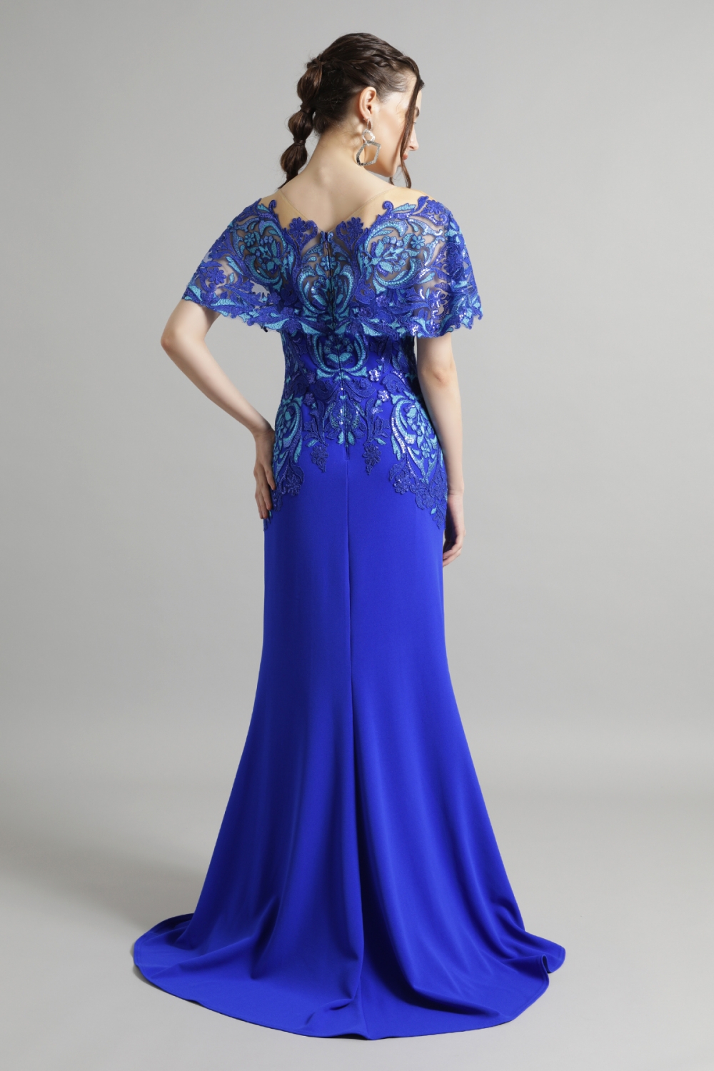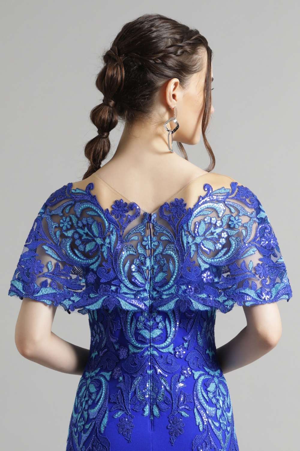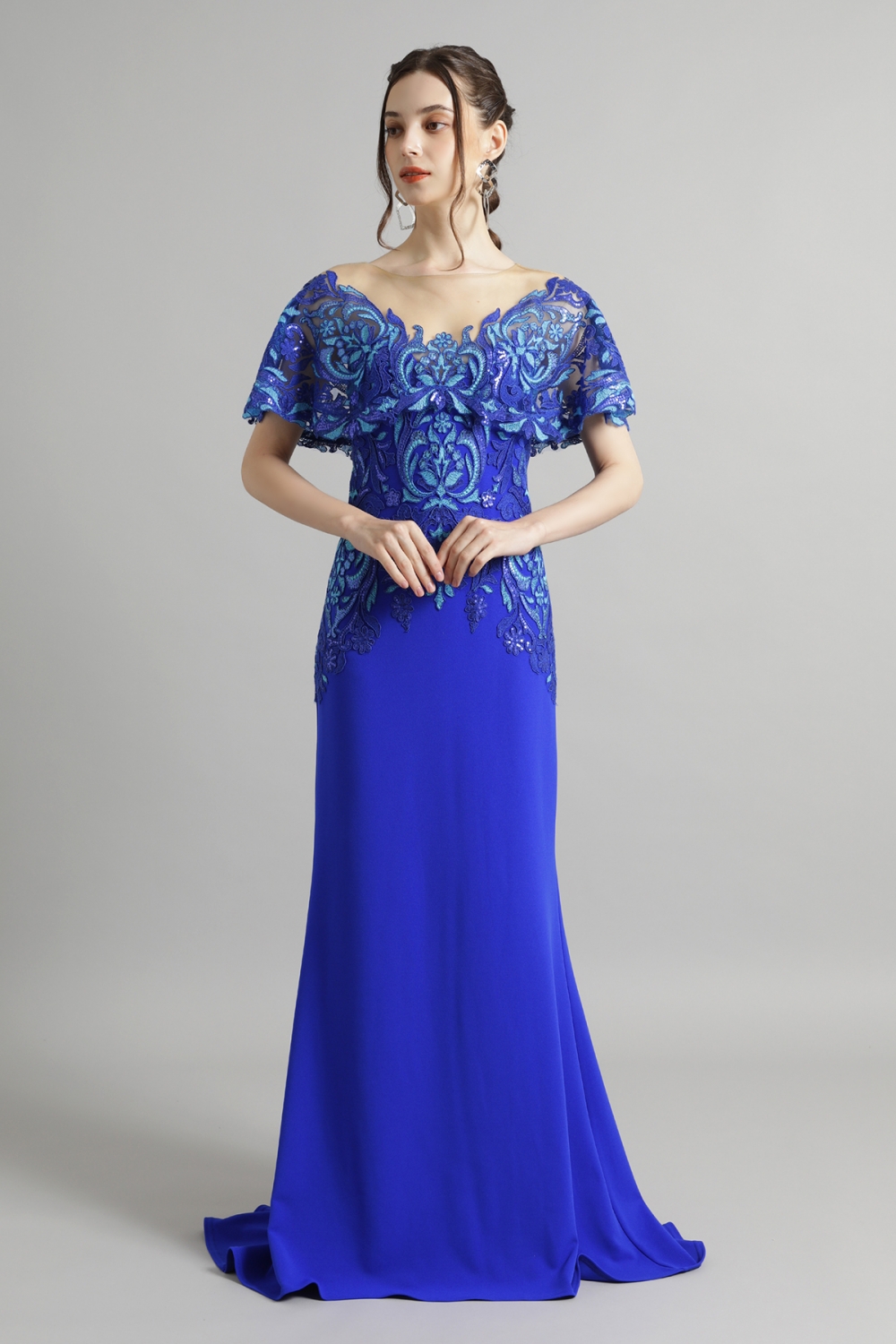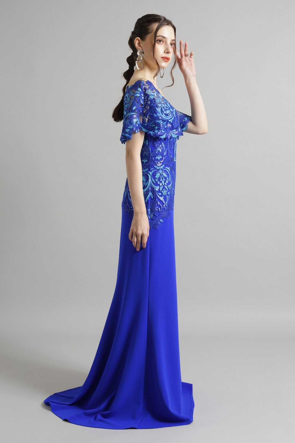 チュール付きのオフショルダーとラッフルスリーブが特徴的で、エレガントなデザイン。トップにはインド建築に見られる複雑なパターンやモチーフからインスパイアされたスパンコール刺繍が施されており、華やかな廊下や繊細な彫刻を思わせるデザインが光を美しく反射して輝きを放ちます。ボディにフィットしたスカートはクレープ素材で作られており、流れるように床まで優雅に広がります。