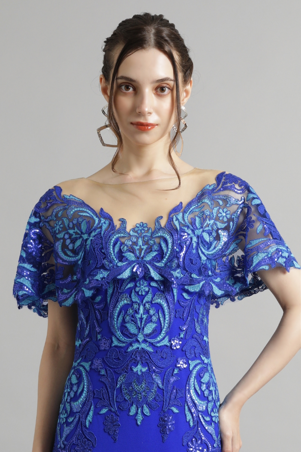 チュール付きのオフショルダーとラッフルスリーブが特徴的で、エレガントなデザイン。トップにはインド建築に見られる複雑なパターンやモチーフからインスパイアされたスパンコール刺繍が施されており、華やかな廊下や繊細な彫刻を思わせるデザインが光を美しく反射して輝きを放ちます。ボディにフィットしたスカートはクレープ素材で作られており、流れるように床まで優雅に広がります。 モデルサイズ 身長170cm B:82cm W:58cm H:87cm /サイズ0着用 ■新作商品一覧はこちら■ □ロングドレス一覧はこちら□ ■ブルーの商品一覧はこちら■