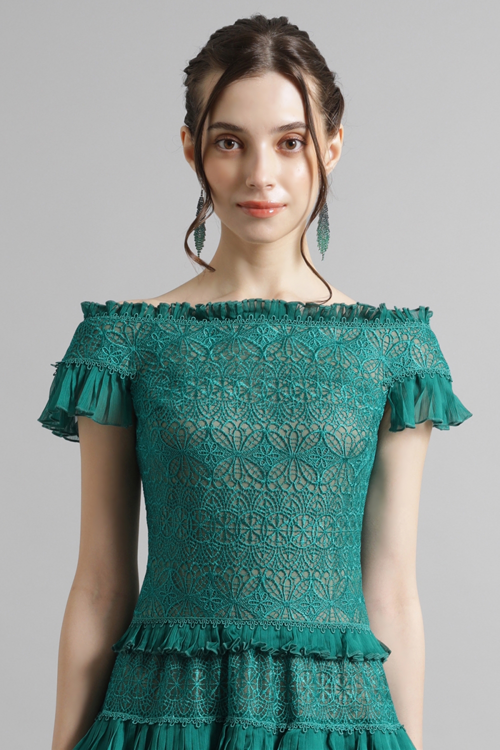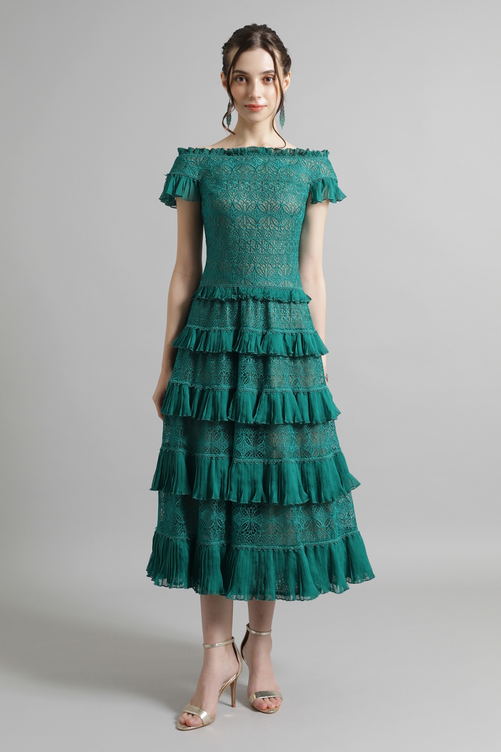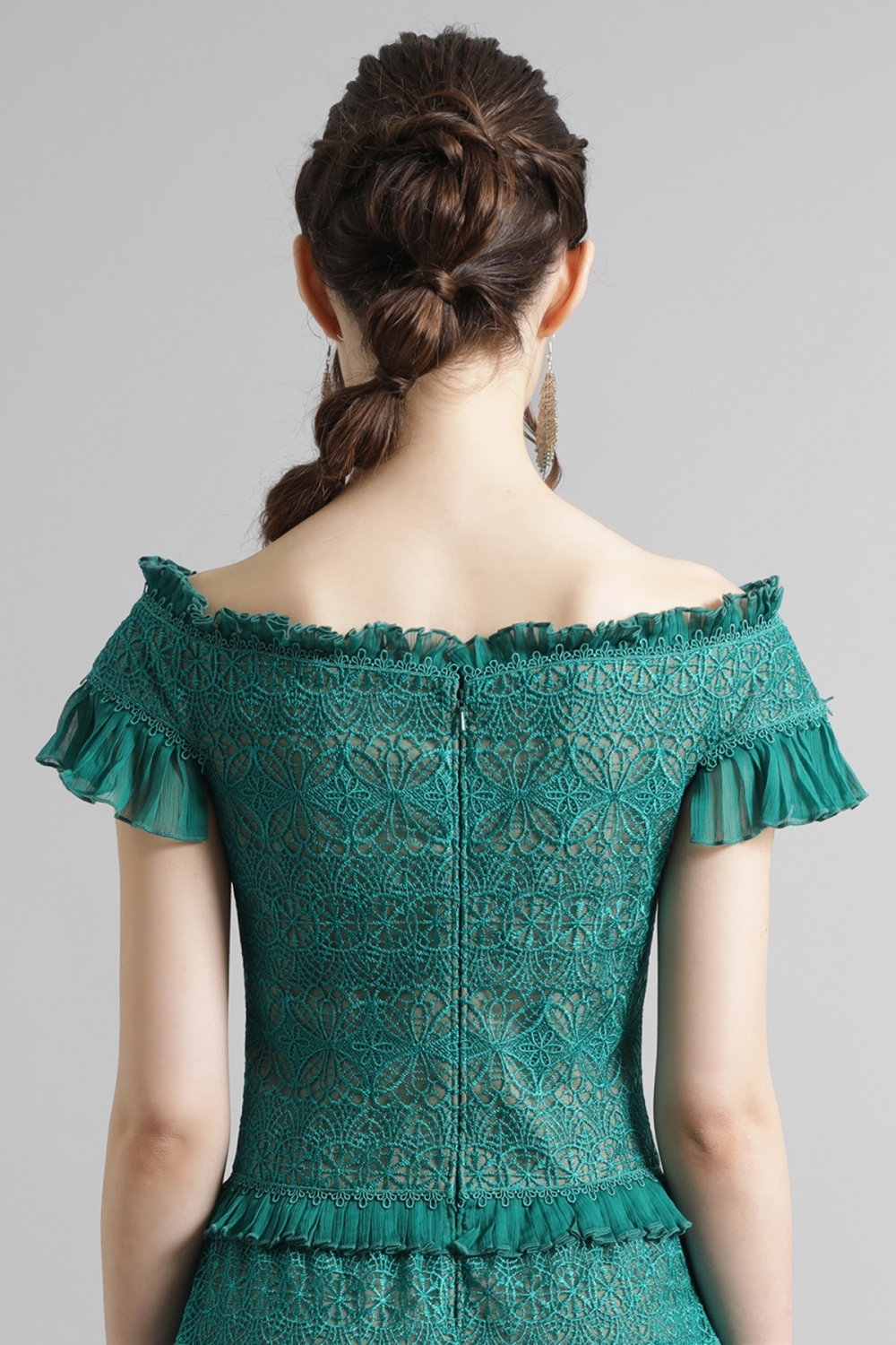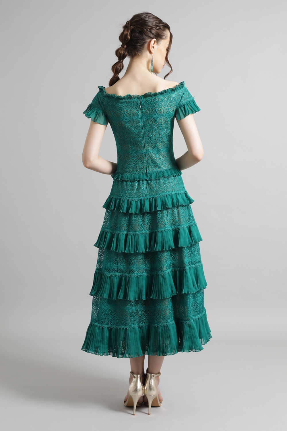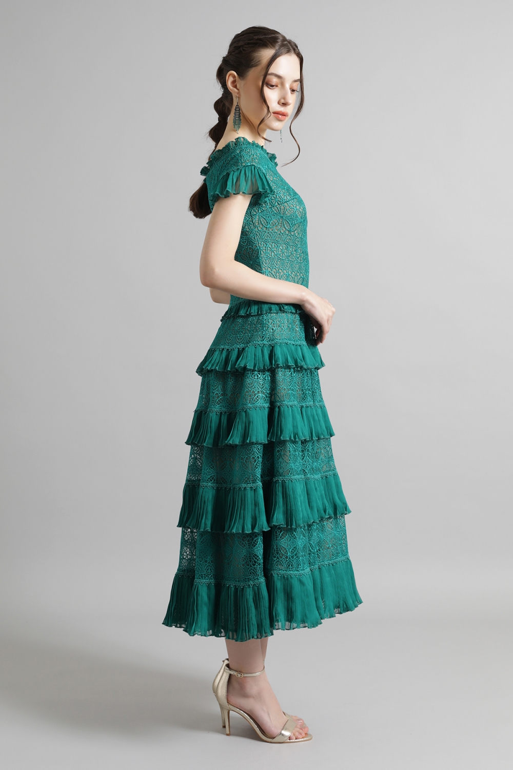 フリルでトリミングしたオフショルダーがロマンチックな印象のミモレ丈ドレス。ヌードカラーの裏地に重ねた繊細な刺繍のエメラルドグリーンのチュールが、美しく幻想的です。フィットしたウエストから、流れるように続くティアードスカート部分は、交互に配置されたフリルが柔らかな動きをプラスし、上品でありながら可憐な雰囲気を演出します。