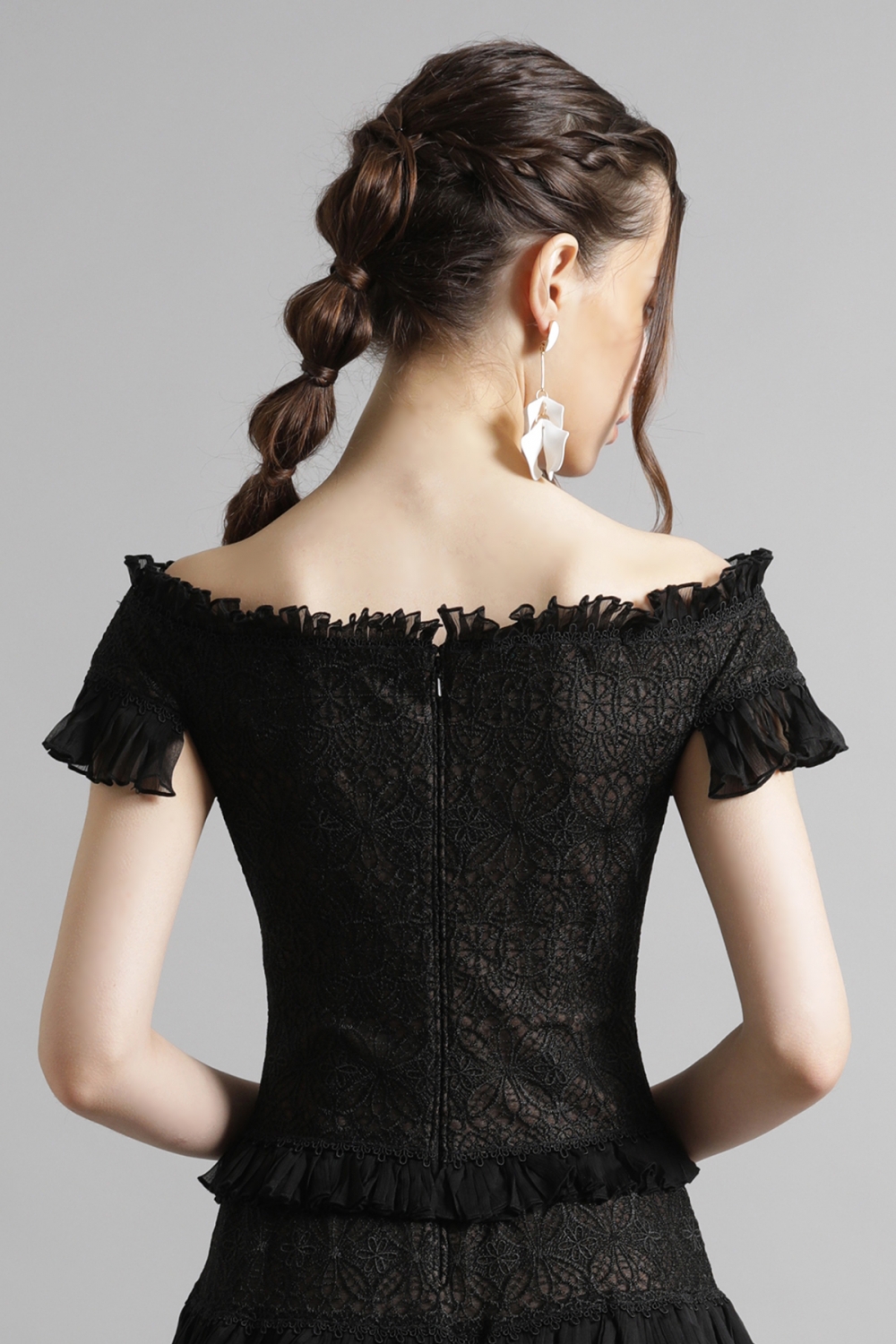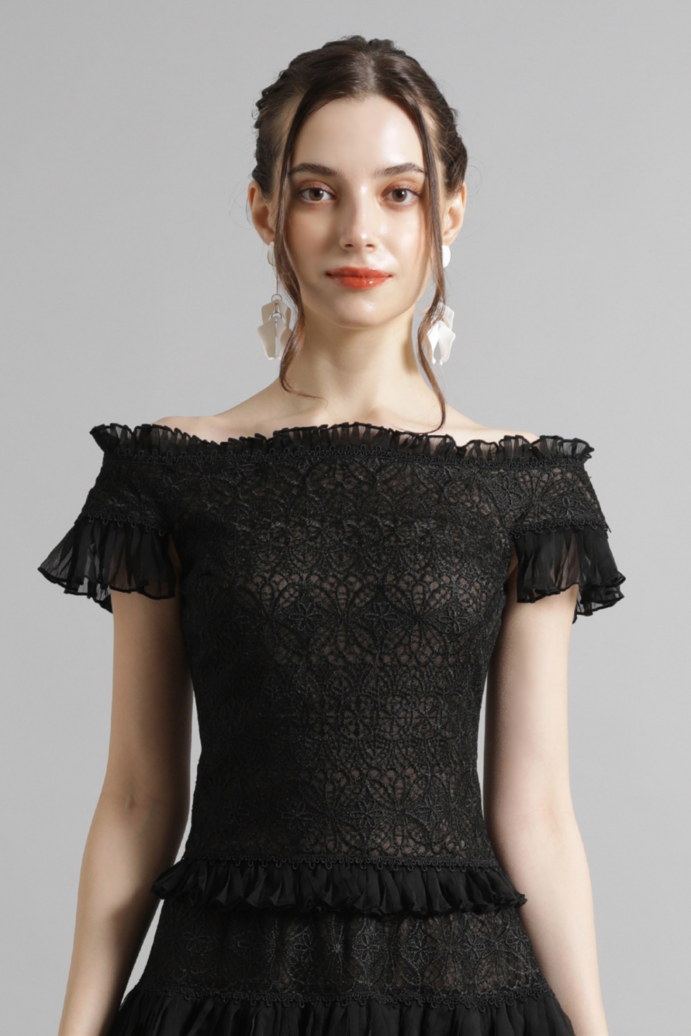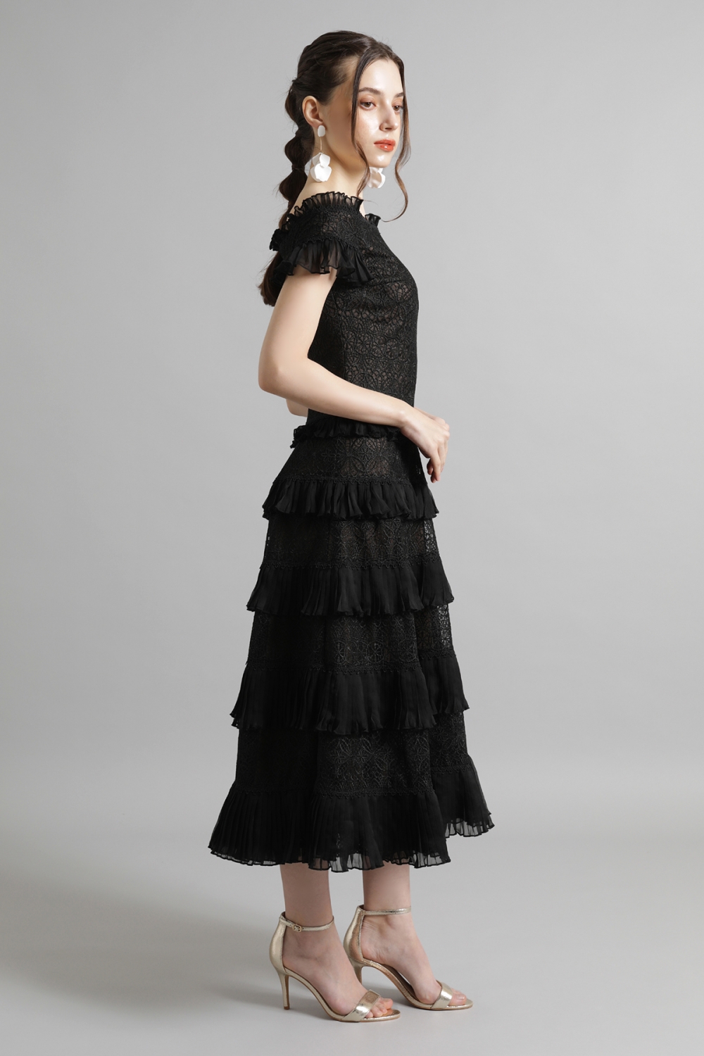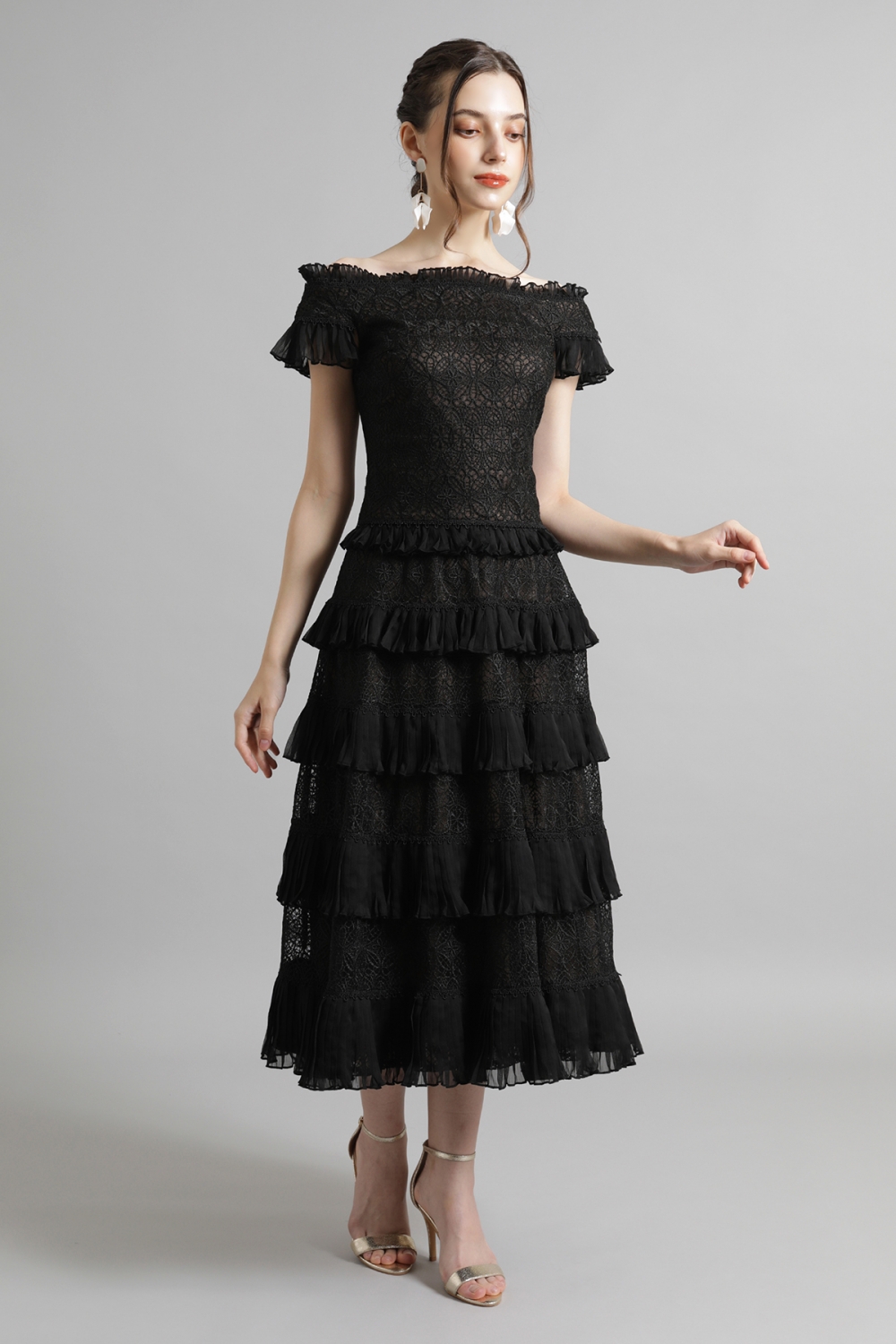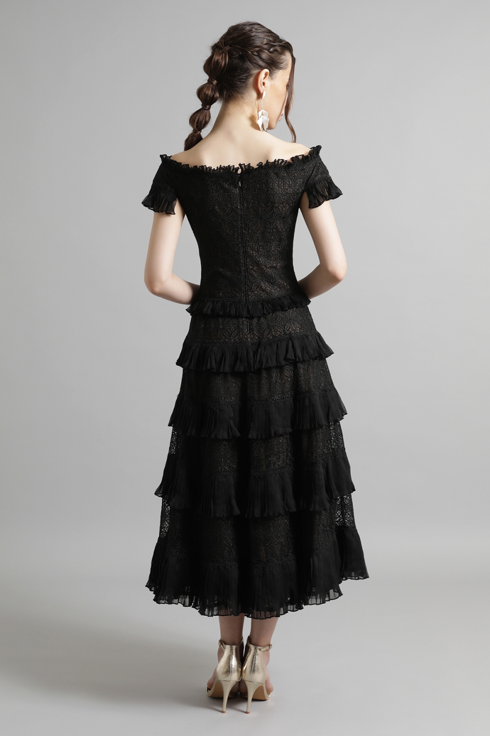 フリルでトリミングしたオフショルダーがロマンチックな印象のミモレ丈ドレス。ヌードカラーの裏地に重ねた繊細な刺繍のブラックチュールが、優美で幻想的です。フィットしたウエストから、流れるように続くティアードスカート部分は、交互に配置されたフリルが柔らかな動きをプラスし、上品なでありながら可憐な雰囲気を演出します。