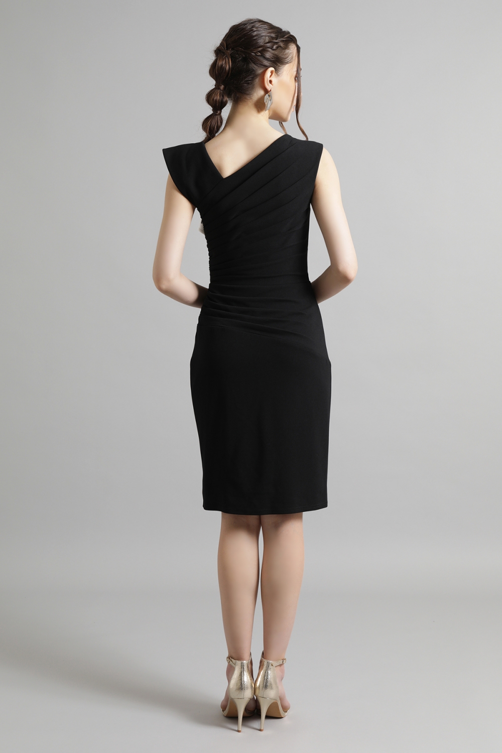 アシンメトリーなデザインにフリルが目を引くブラックドレス。ブラックとアイボリーのダブルフェイスのフリルは、ネックラインから裾まで流れるように配置され、縦のラインを強調してスタイルアップを叶えます。アイボリーが程よいアクセントとなり、シャープな雰囲気を演出します。スリムフィットのシルエットが美しい、洗練された一着です。 モデルサイズ 身長170cm B:82cm W:58cm H:87cm /サイズ0着用 ■新作商品一覧はこちら■ □ミディアムドレス一覧はこちら□ ■ブラックの商品一覧はこちら■