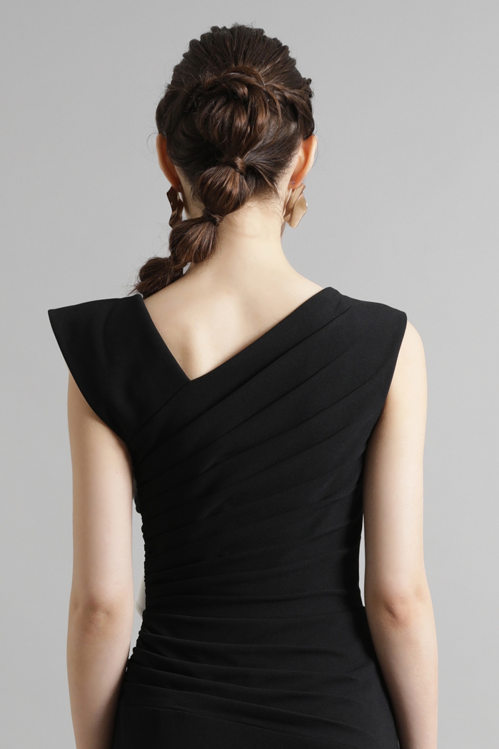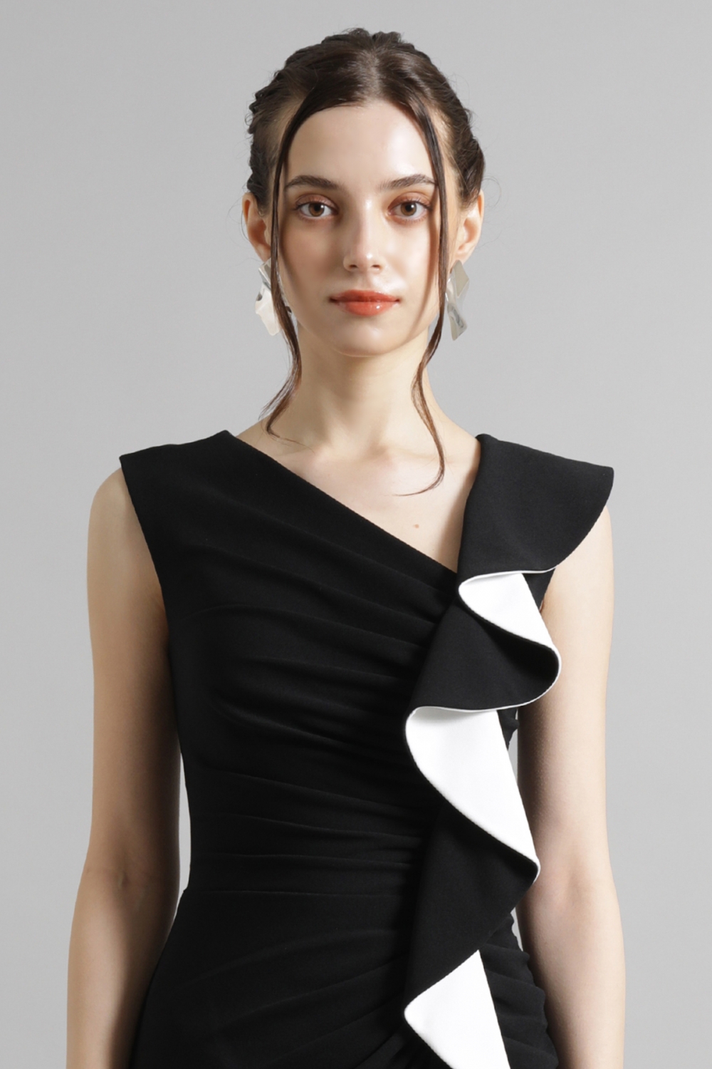 アシンメトリーなデザインにフリルが目を引くブラックドレス。ブラックとアイボリーのダブルフェイスのフリルは、ネックラインから裾まで流れるように配置され、縦のラインを強調してスタイルアップを叶えます。アイボリーが程よいアクセントとなり、シャープな雰囲気を演出します。スリムフィットのシルエットが美しい、洗練された一着です。