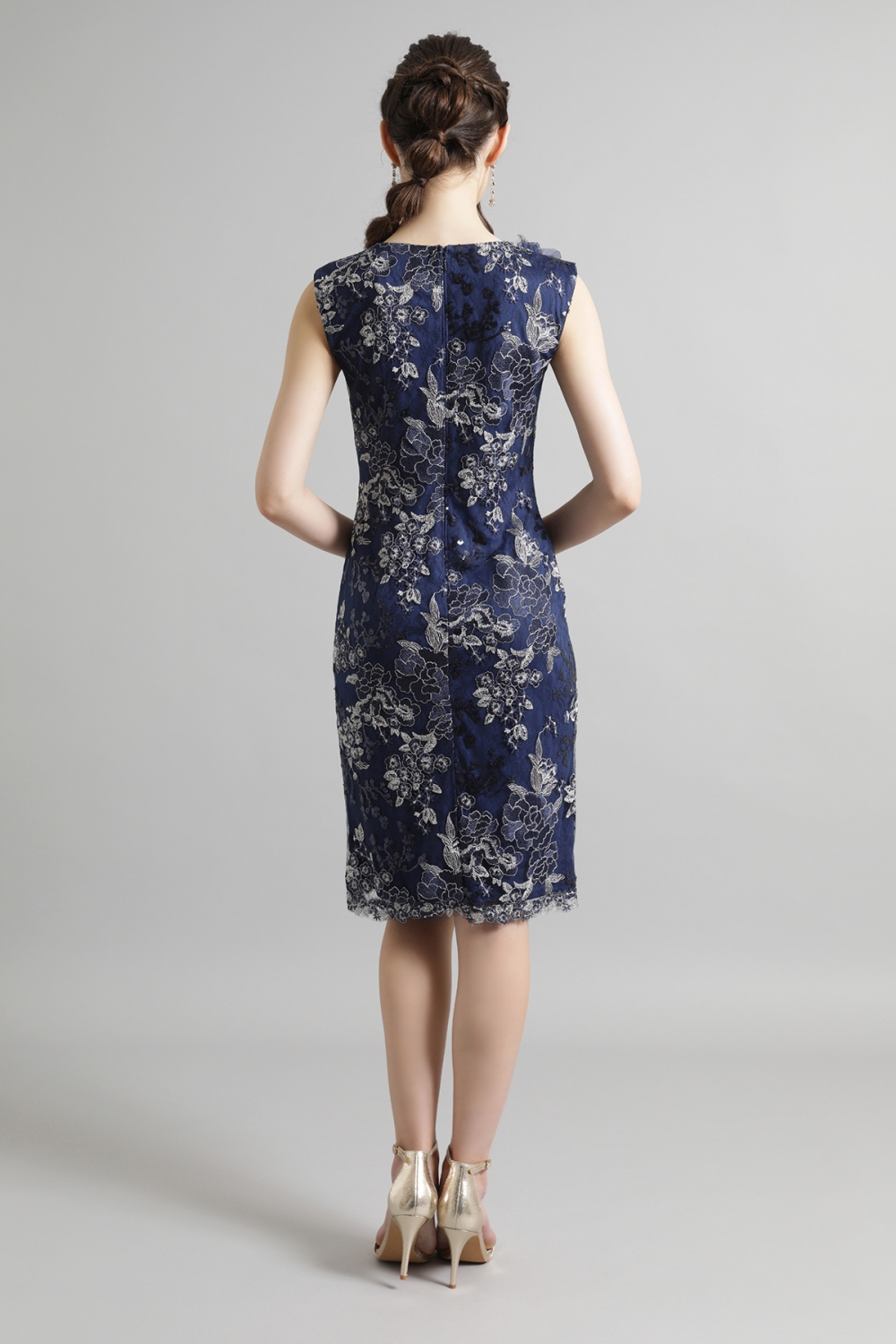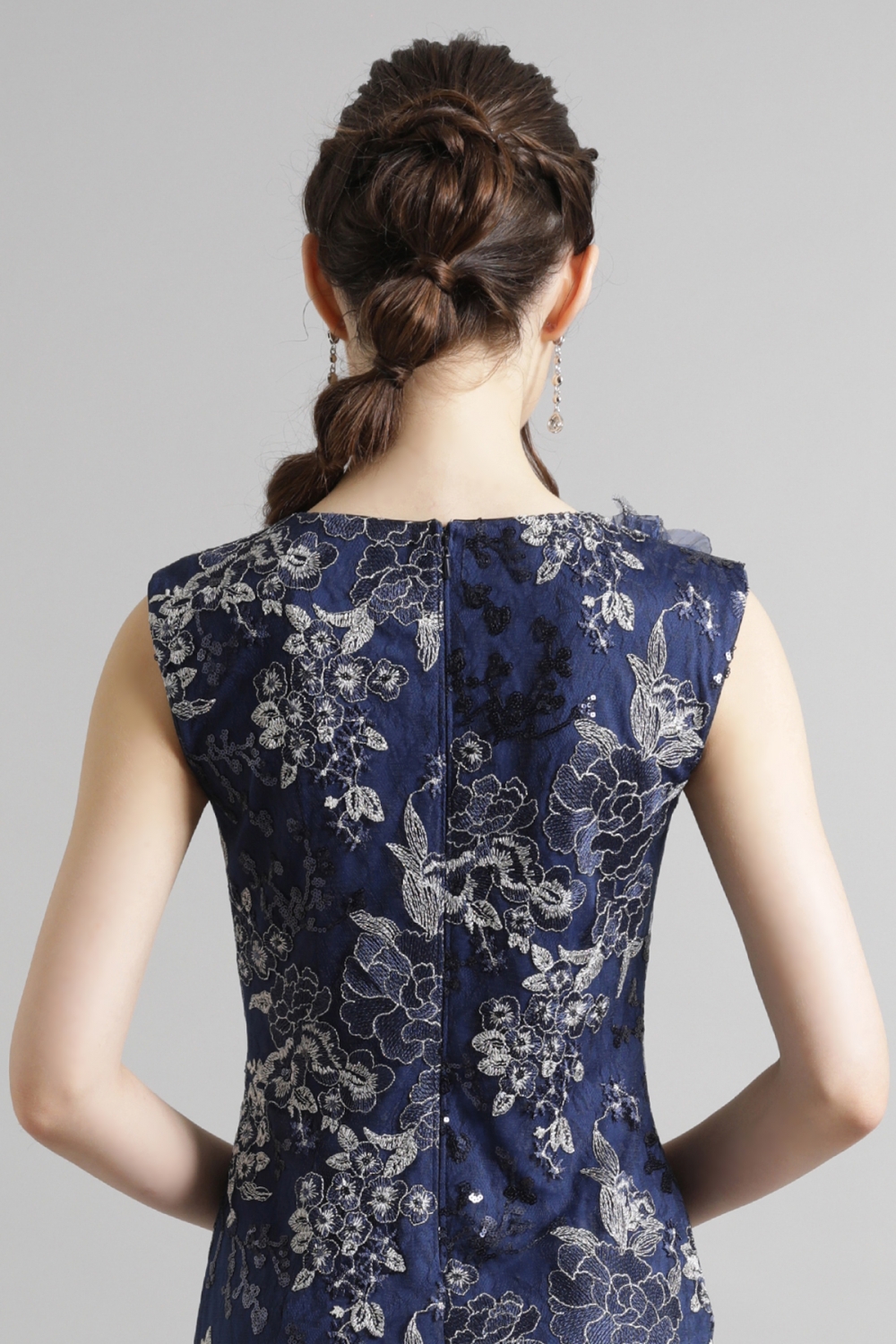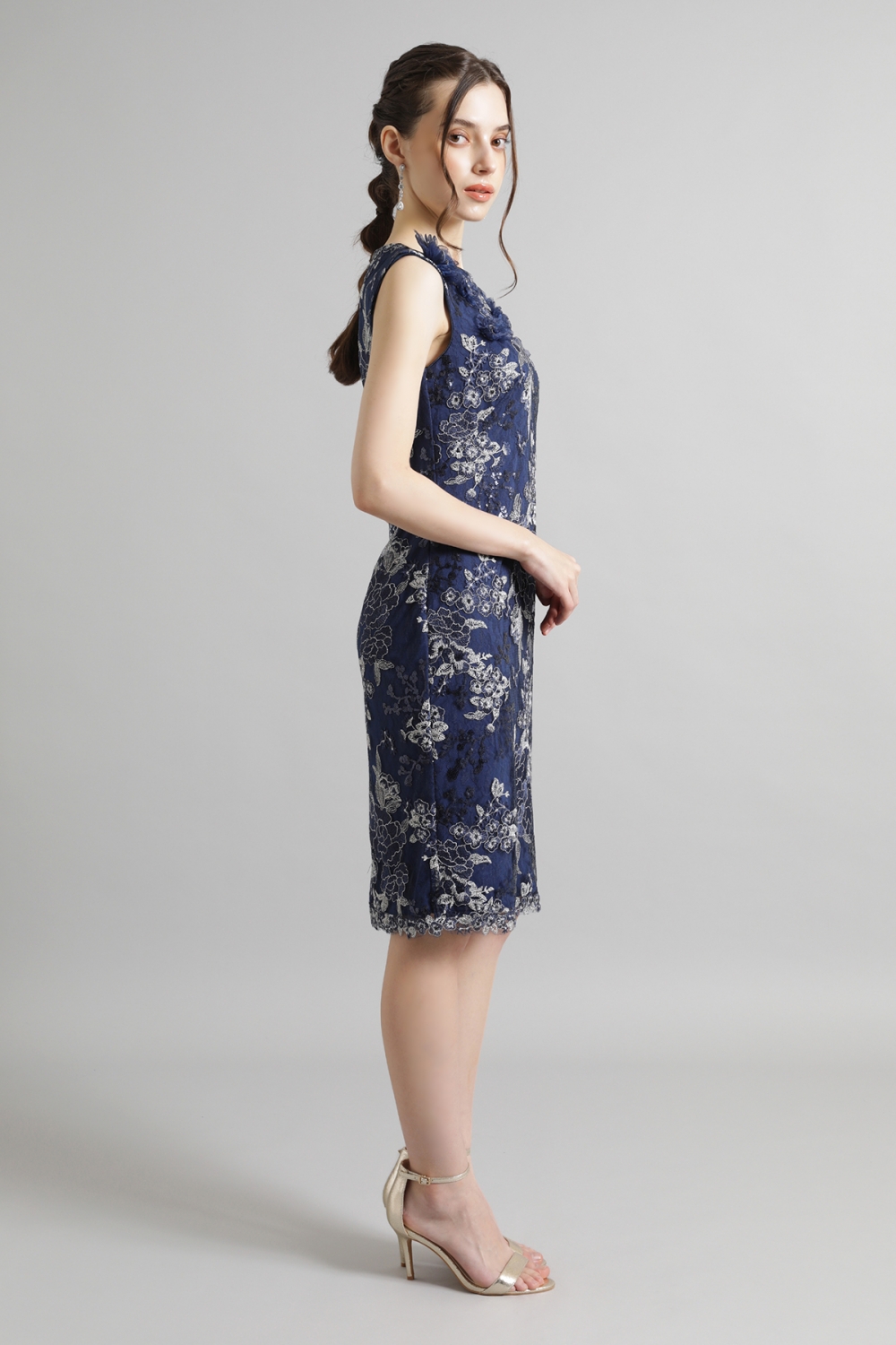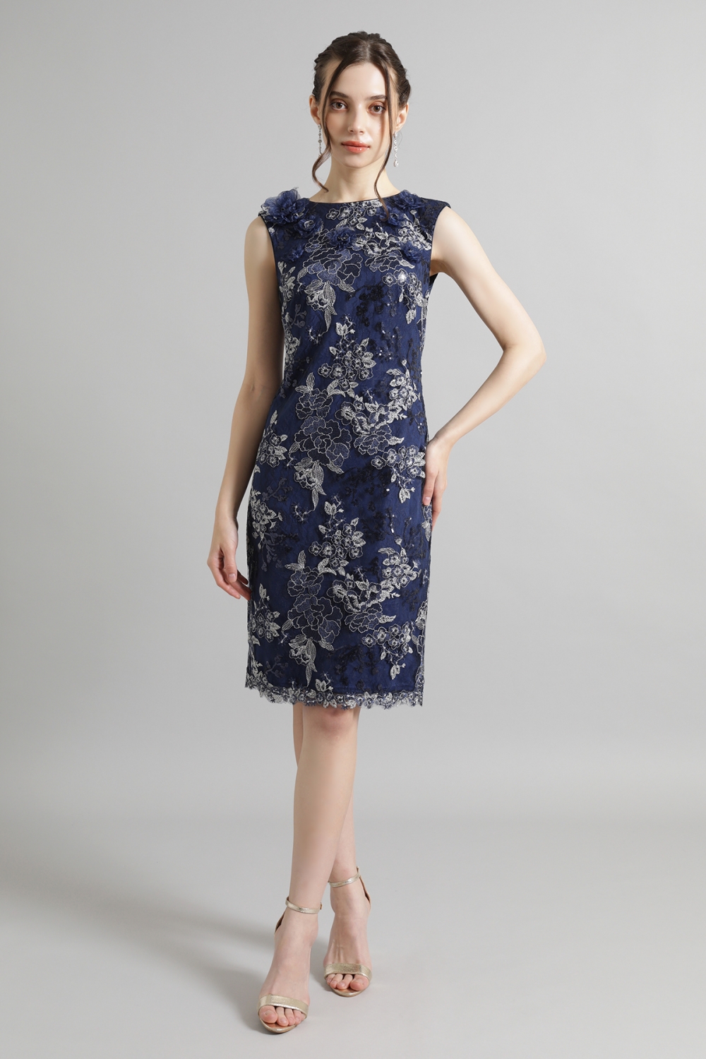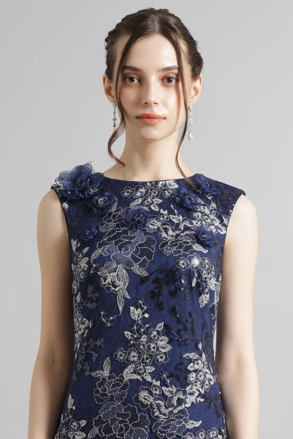 美しい花の刺繍が施された深みのあるミッドナイトカラーのドレスは、気品がありながら、華やかな雰囲気を纏います。シンプルながらも上品なノースリーブのシルエットが、ボディラインを美しく引き立て、凛とした表情。ハンドクラフトで丁寧にあしらわれた立体的な花飾りが、さらにフェミニンなアクセントを加えます。タイムレスにご着用いただけるドレスです。
