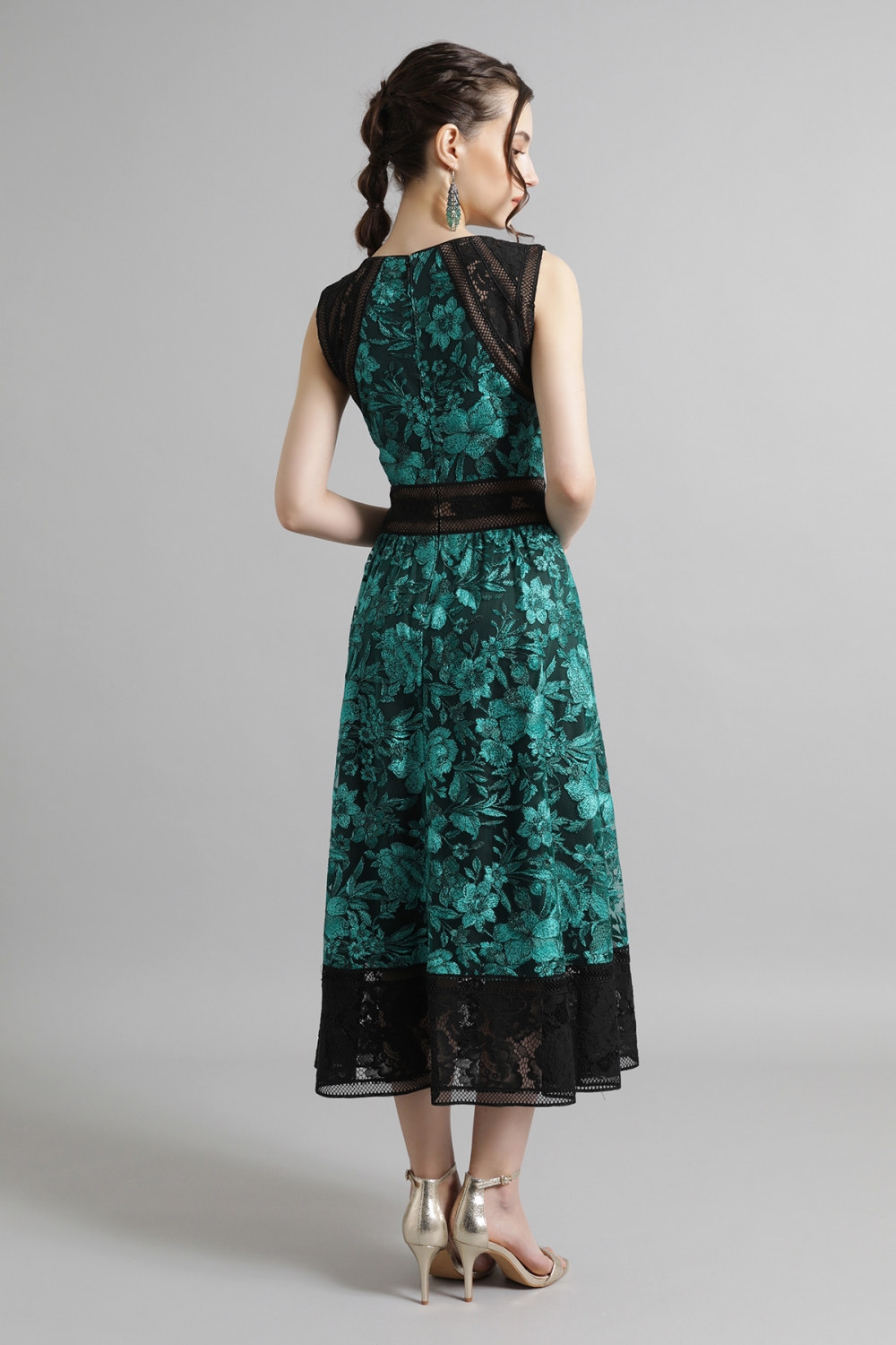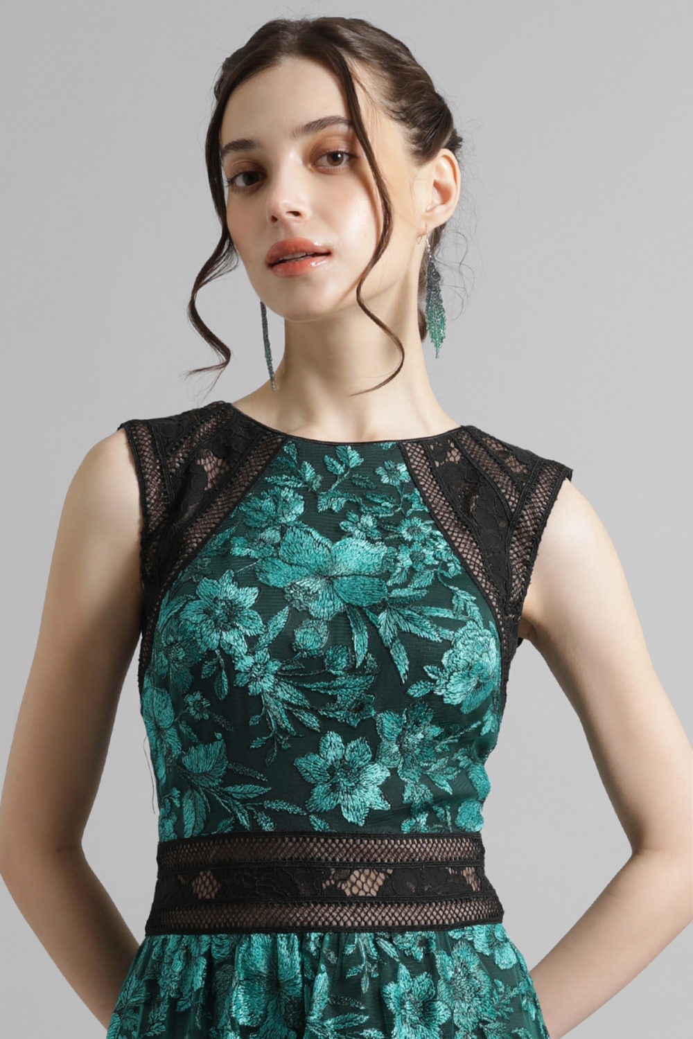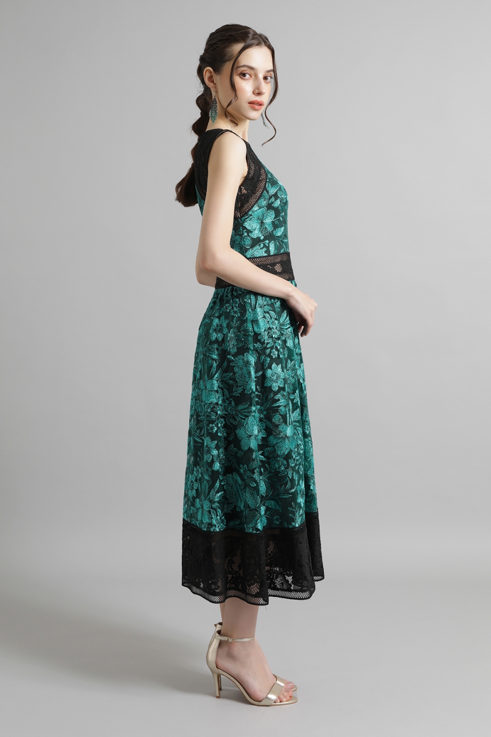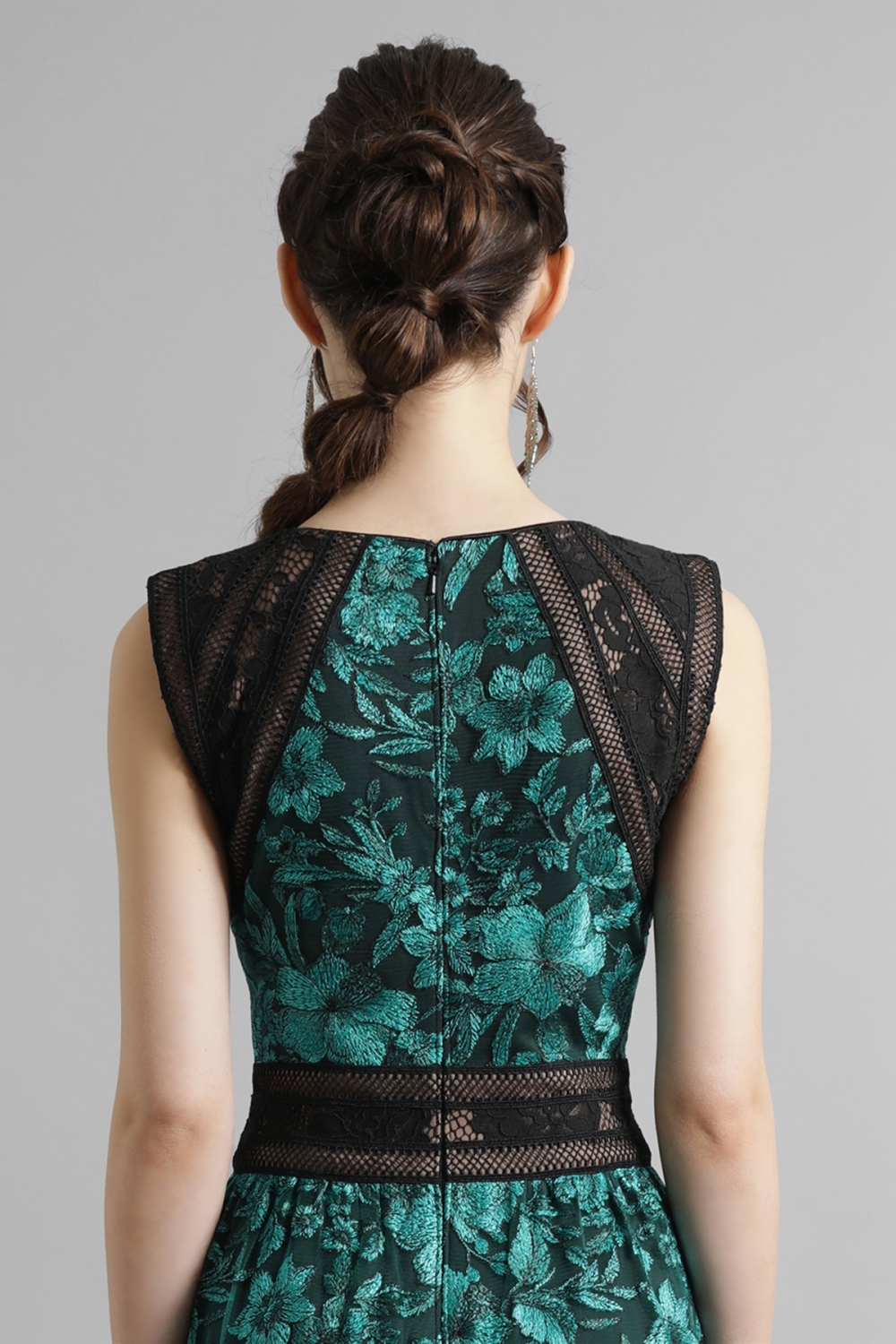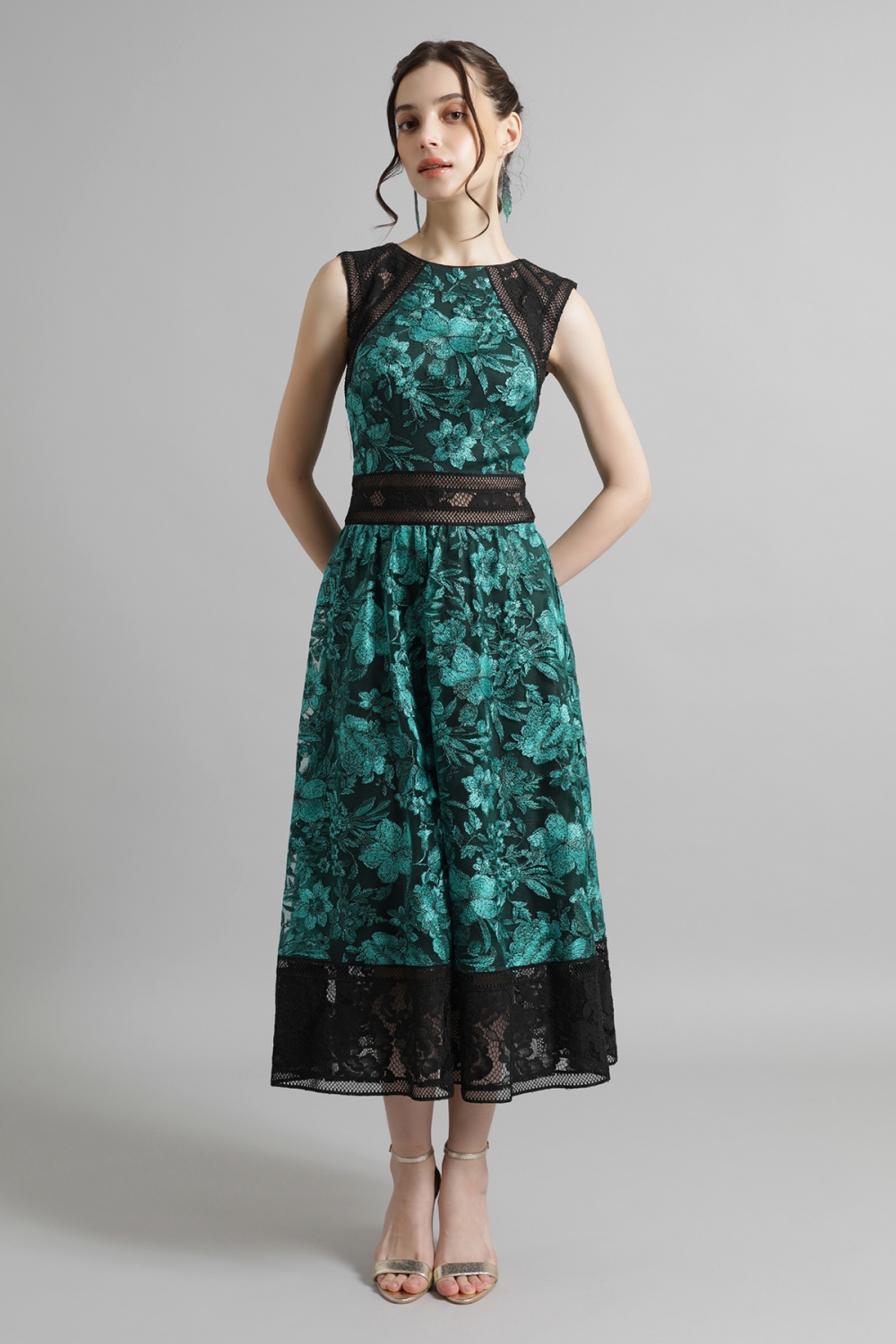 フラワー刺繍の総レースが美しいミモレ丈のドレス。艶やかなグリーンがロマンティックな雰囲気です。肩、ウェスト、裾に配置した繊細なトリムレースが程よい抜け感を加え、大人のエレガンスを引き立てます。ウェストラインからふわりと広がるスカートが優雅なシルエットを生み出します。カジュアルからフォーマルまで幅広く活躍する、華やかでフェミニンな一着です。