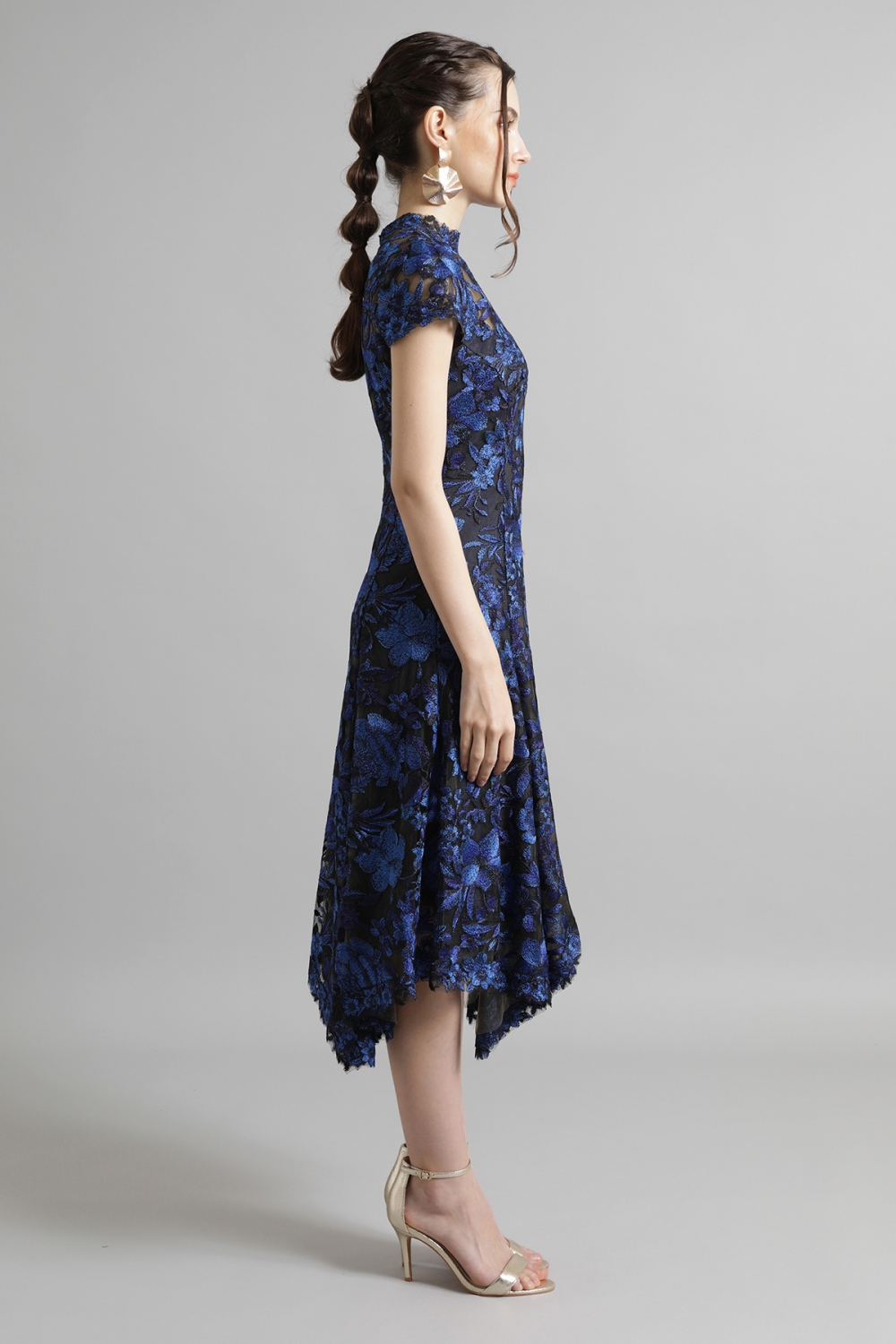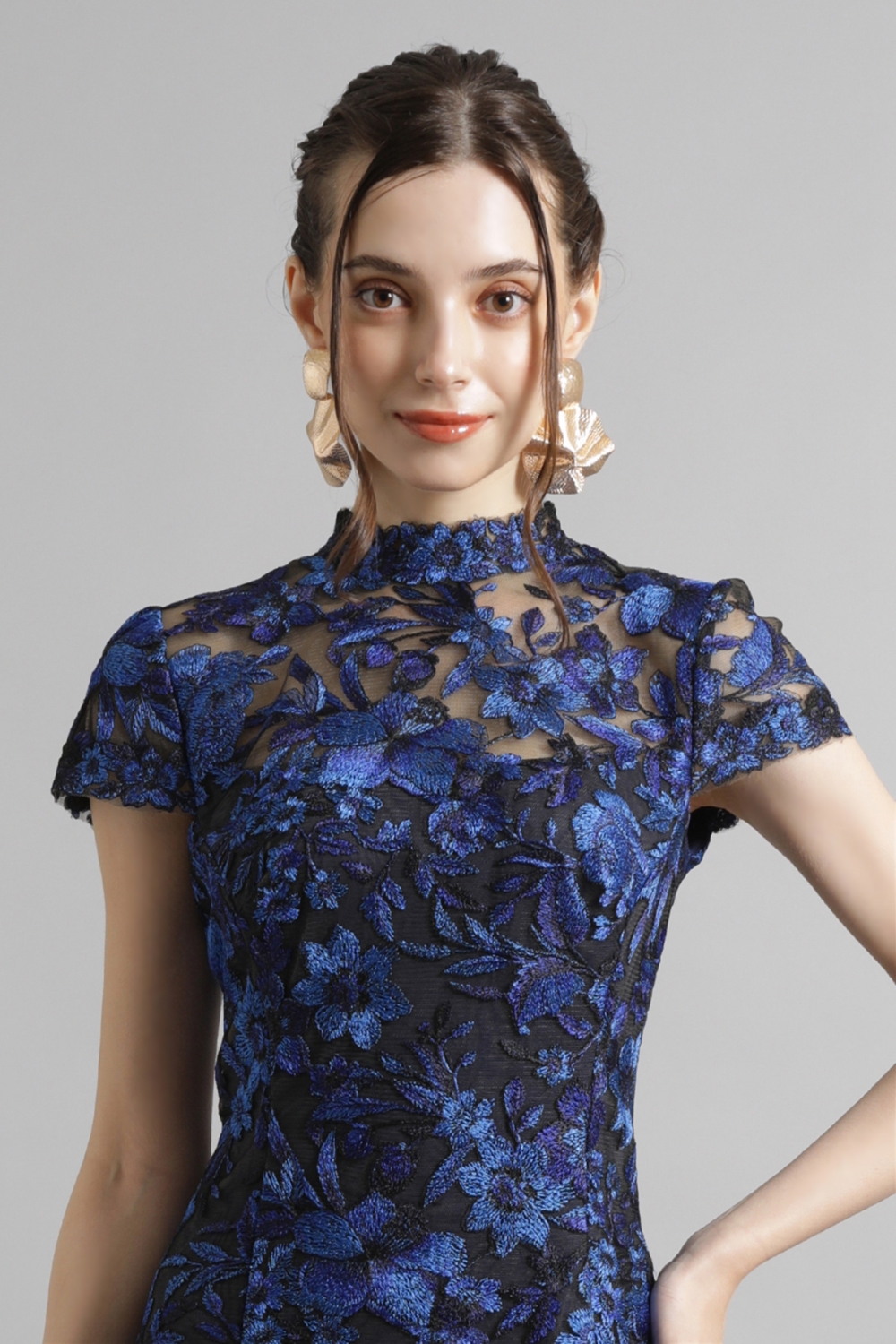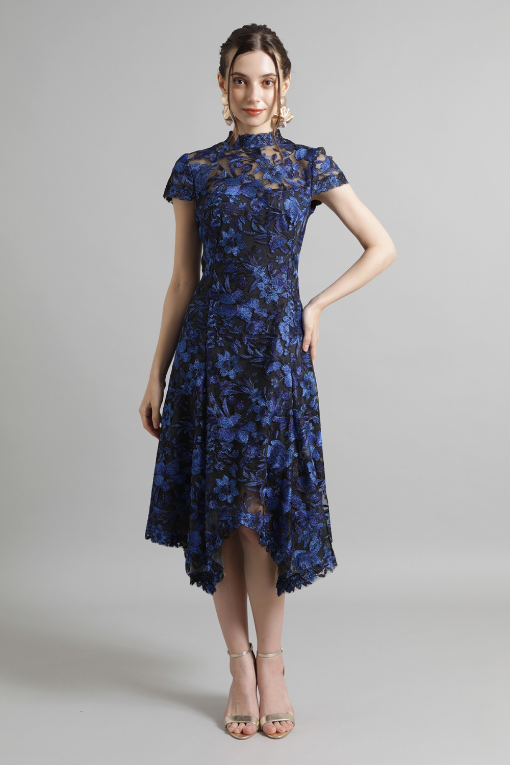 光沢のある美しいフラワーレースが印象的なドレス。ハイネックのデザインが上品な印象を与え、キャップスリーブとハンカチーフヘムが女性らしい華やかさをプラスします。総レース仕立で、エレガントで優美な雰囲気を漂わせます。一目見ただけで心を奪われるような魅力的なドレスは、特別な場に相応しい一着です。