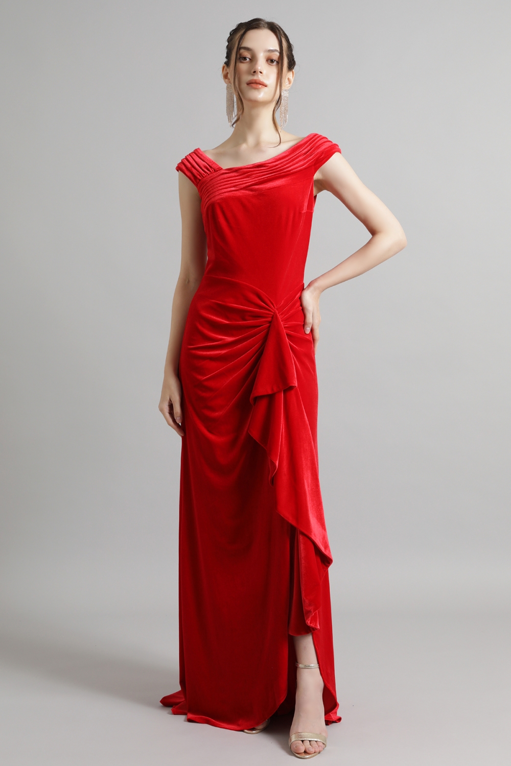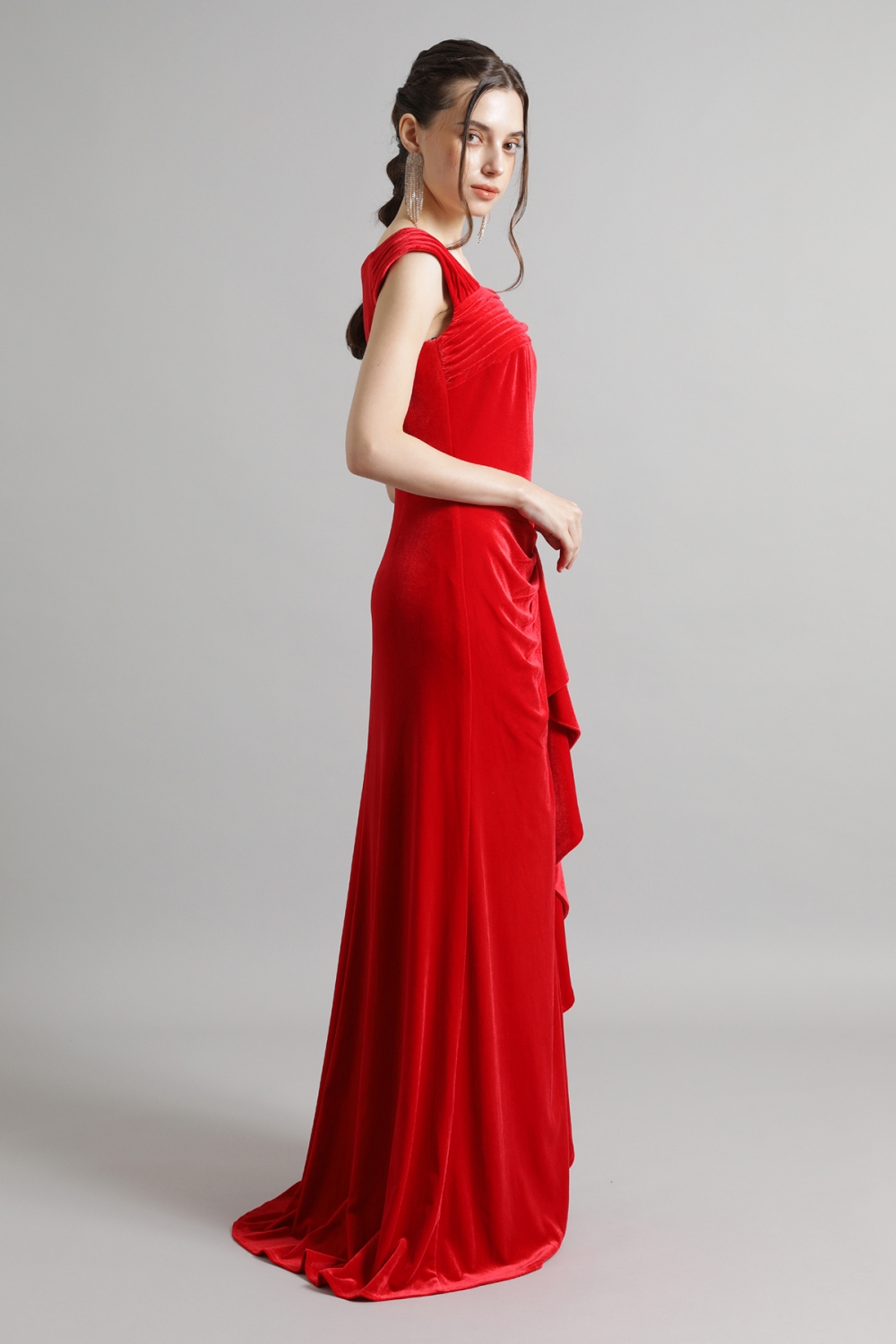 印象的なオフショルダーのアシンメトリーネックラインに、ボディにフィットしたシルエットが特徴的な艶やかなベロアのロングドレス。ベロアの生地はストレッチ性があり、まるでTシャツを着ているかのような着心地です。ヒップ部分に施された繊細なギャザーが美しいラインを強調し、サイドのノットがスタイリッシュなアクセントをプラスします。流れるように広がるスリットが、エレガントな動きを作り出します。