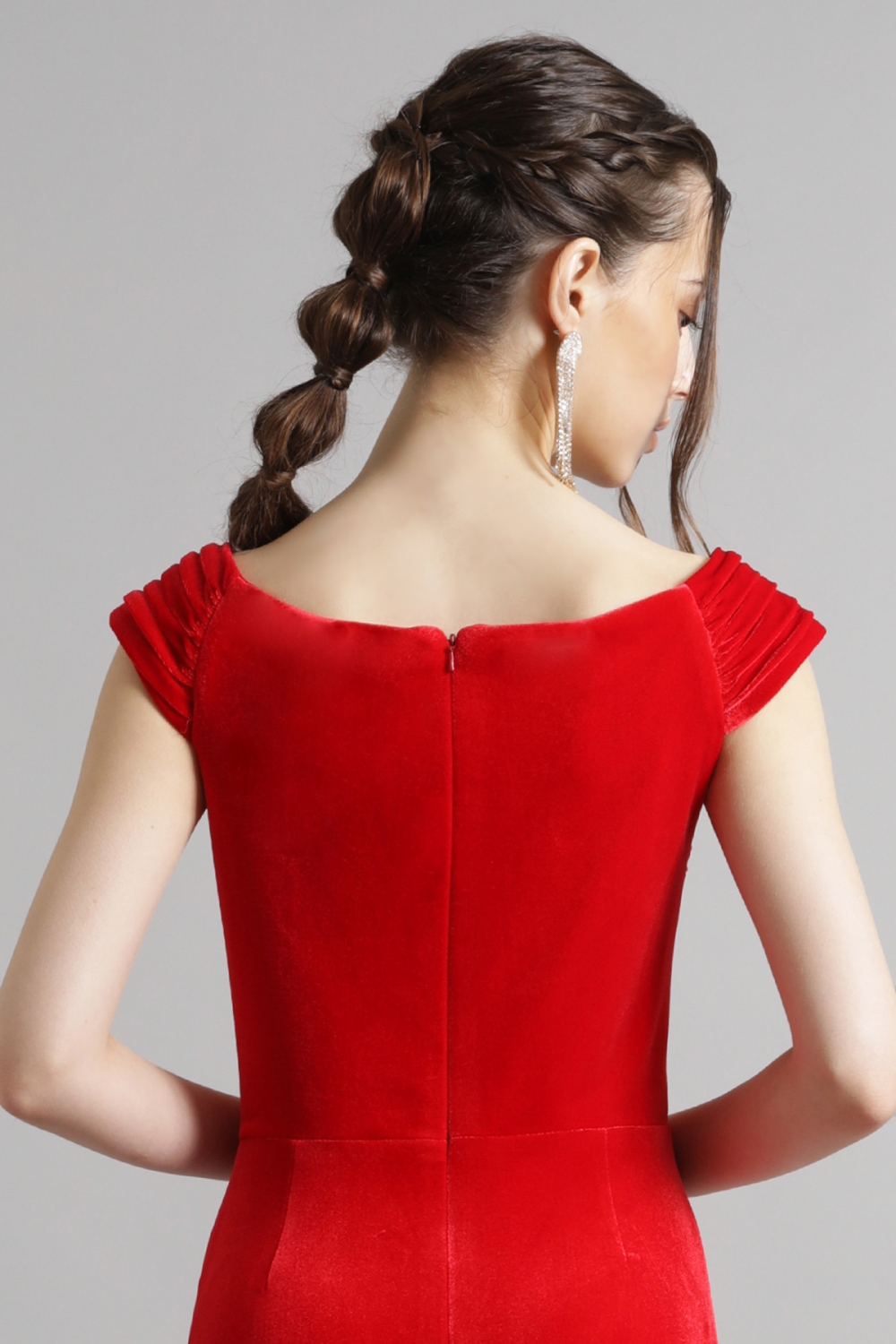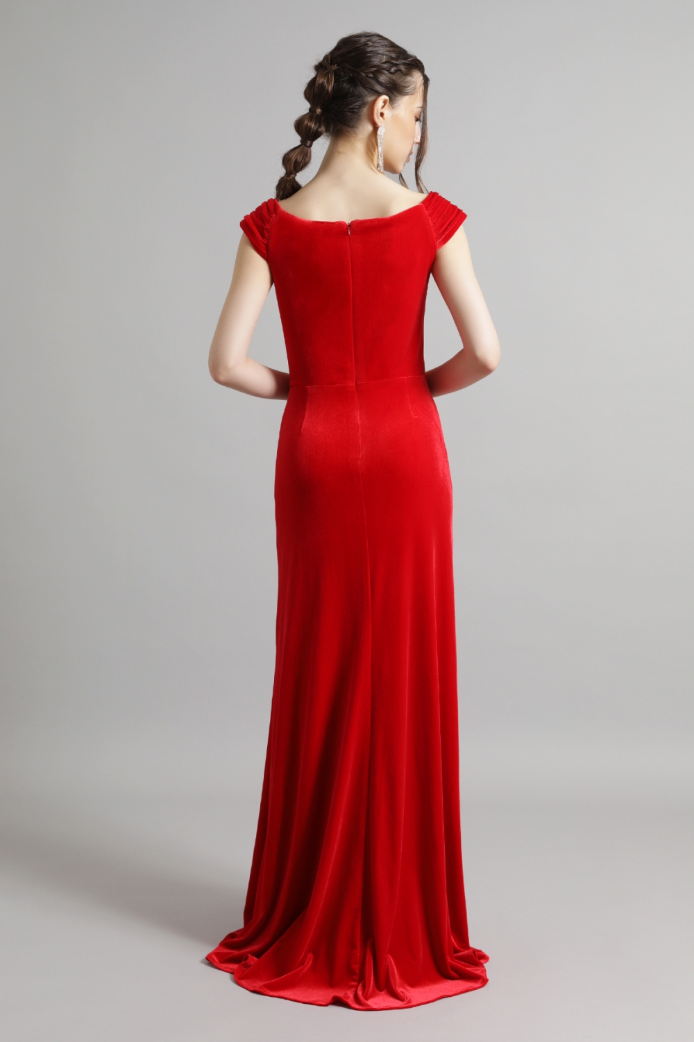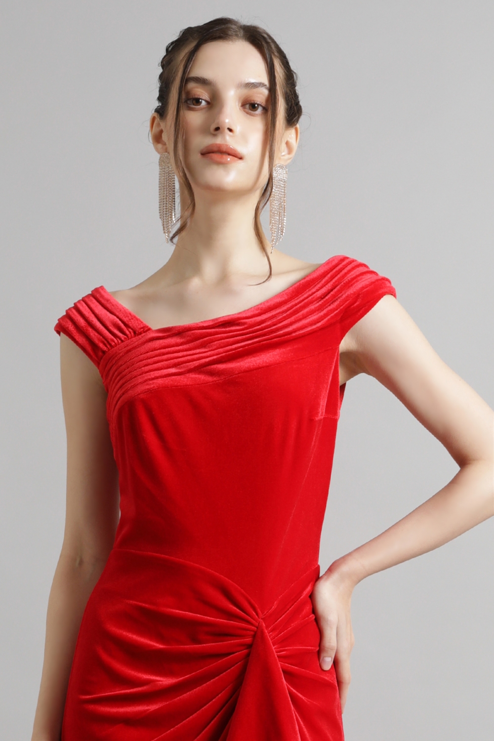 印象的なオフショルダーのアシンメトリーネックラインに、ボディにフィットしたシルエットが特徴的な艶やかなベロアのロングドレス。ベロアの生地はストレッチ性があり、まるでTシャツを着ているかのような着心地です。ヒップ部分に施された繊細なギャザーが美しいラインを強調し、サイドのノットがスタイリッシュなアクセントをプラスします。流れるように広がるスリットが、エレガントな動きを作り出します。 モデルサイズ 身長170cm B:82cm W:58cm H:87cm /サイズ0着用 ■新作商品一覧はこちら■ □ロングドレス一覧はこちら□ ■レッドの商品一覧はこちら■