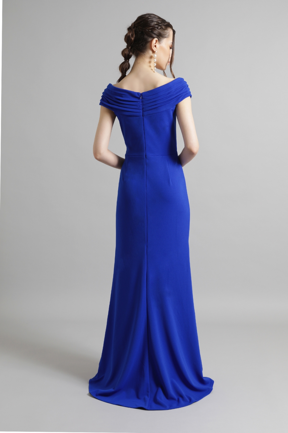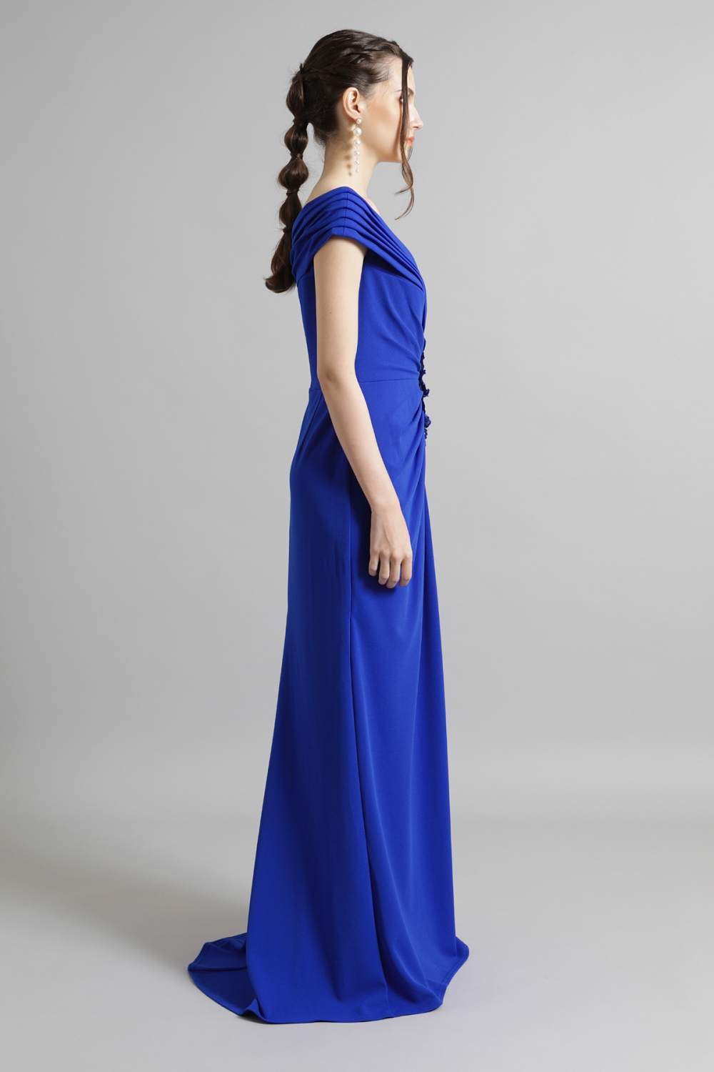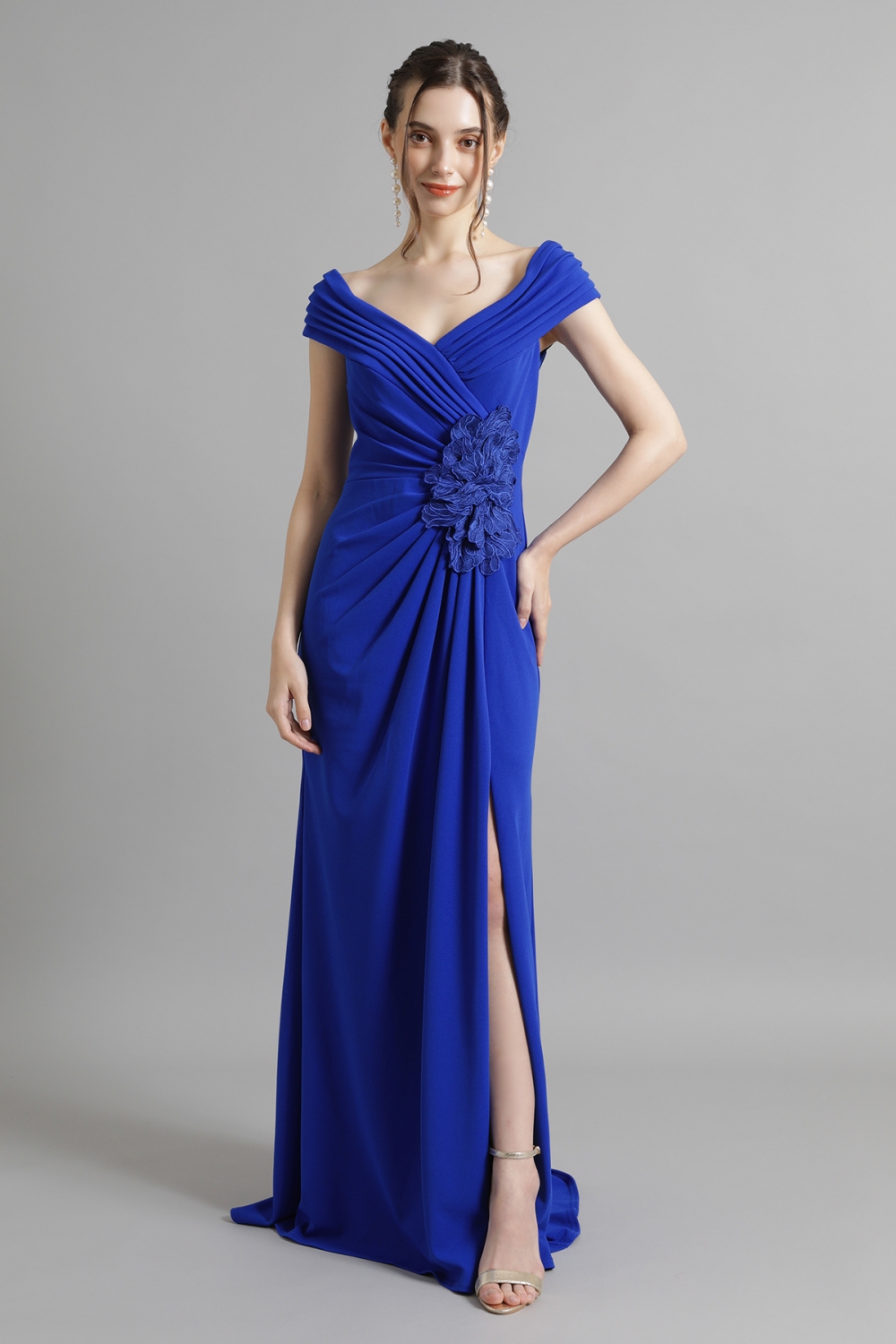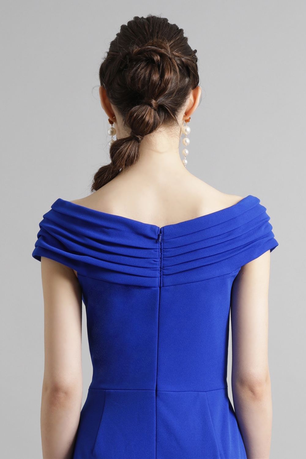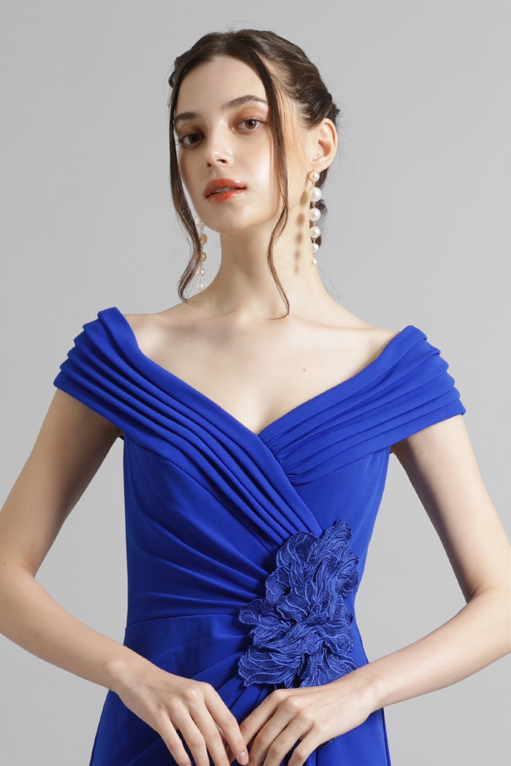 凛としたブルーが美しいロングドレス。オフショルダーのデザインが、デコルテラインを美しく強調し、エレガントです。ウエスト部分には立体的なフラワーモチーフが施され、華やかさを演出すると共に、ウェストラインを引き締めます。ドレープの効いた生地が流れるようなラインを作り、動くたびに美しく揺れるのが印象的です。特別な場にふさわしい気品ある一着です。