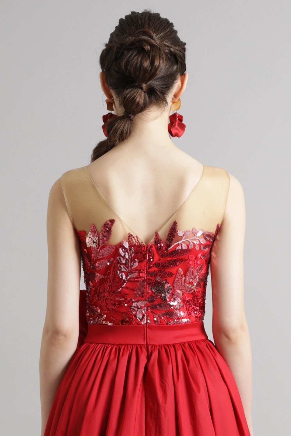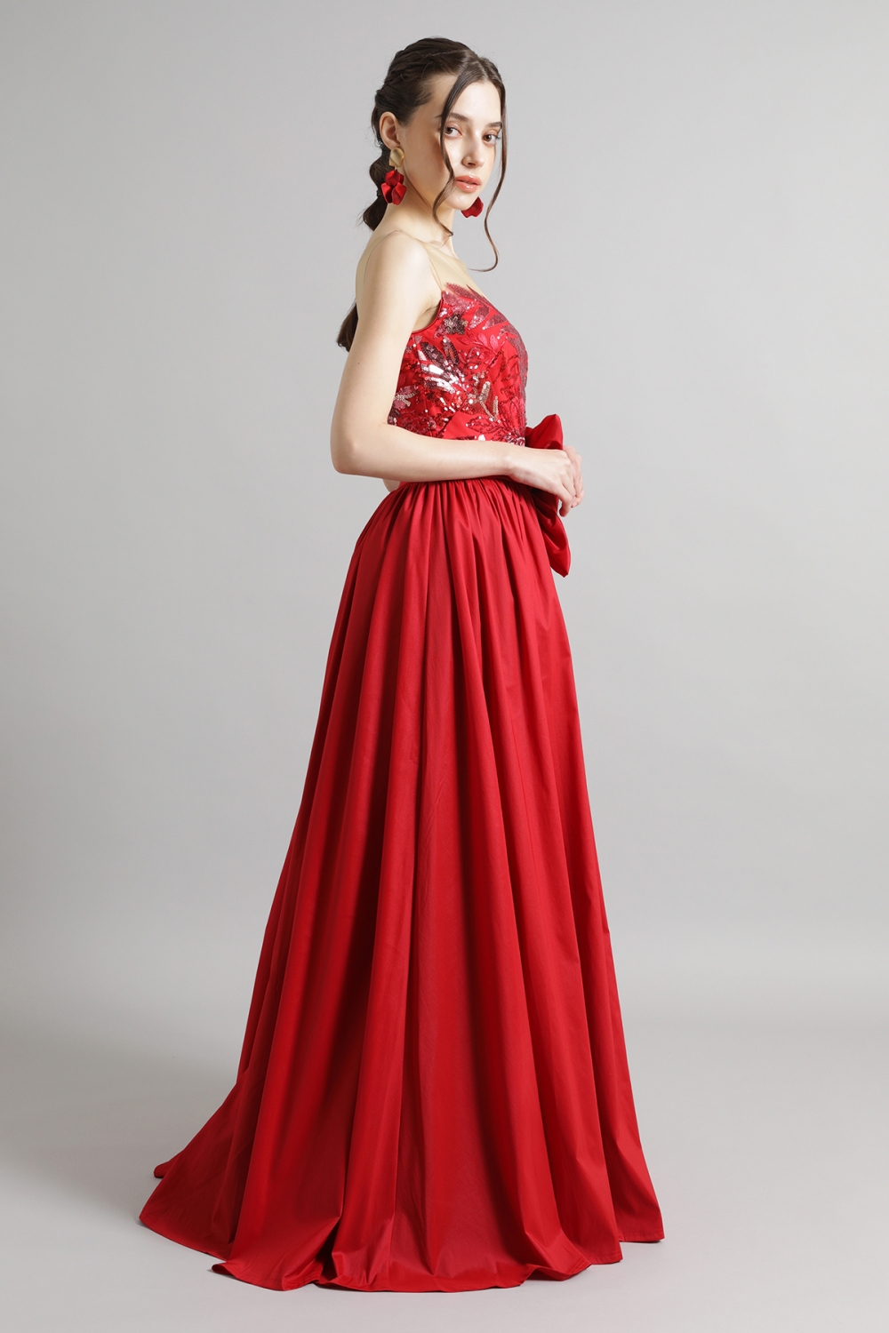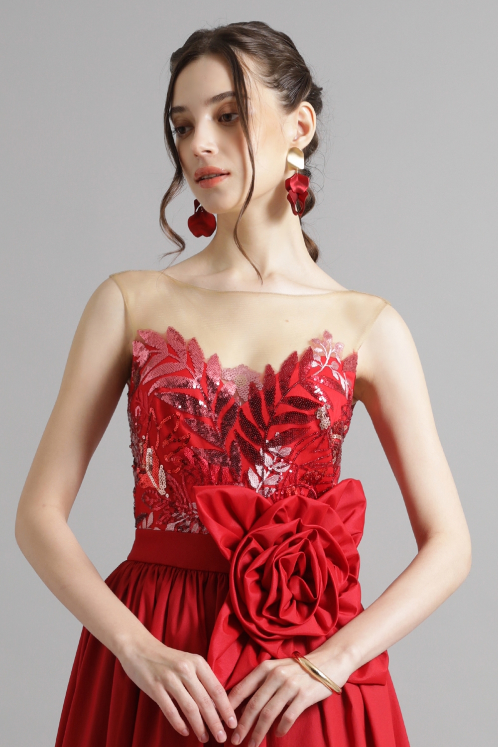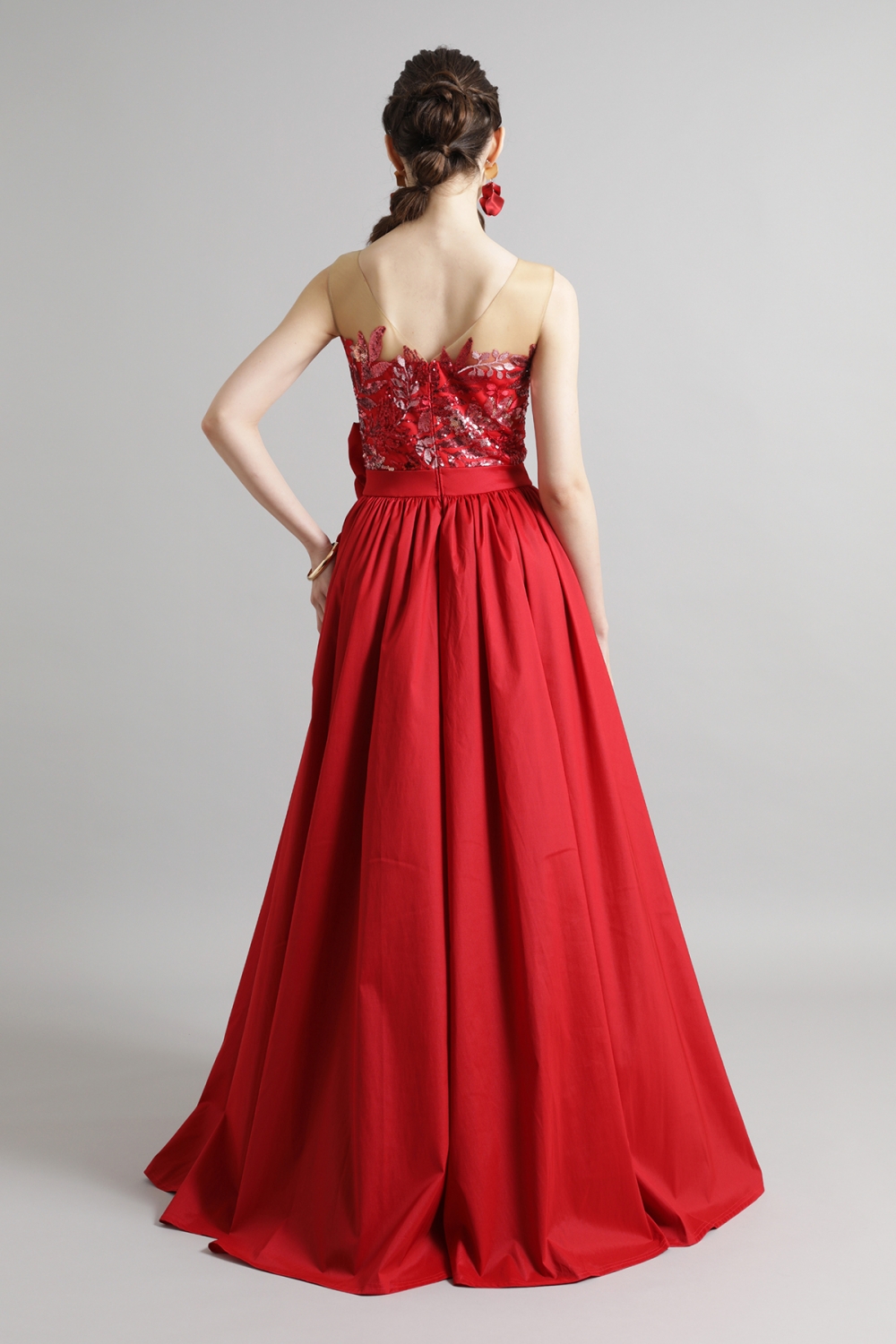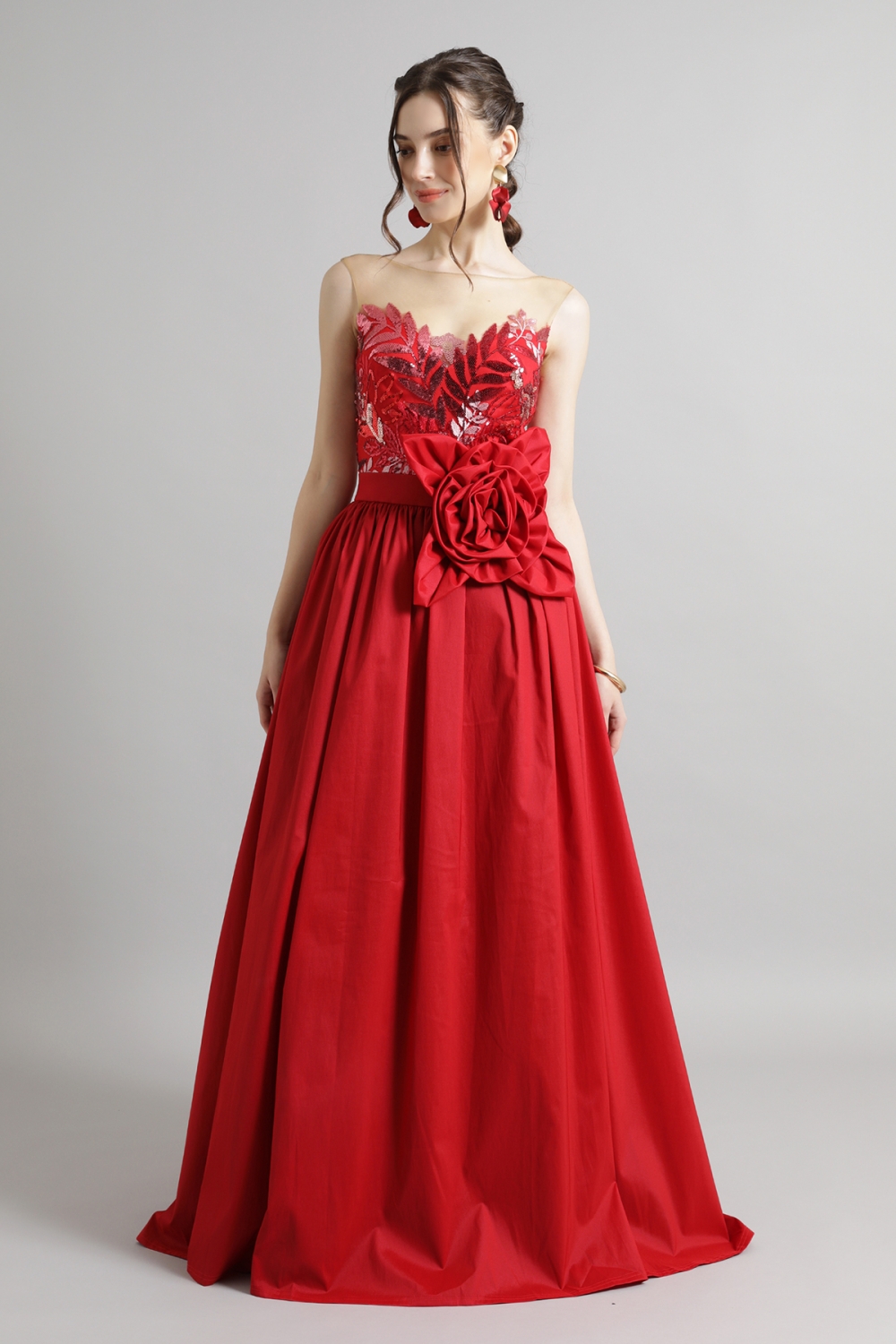 鮮やかな赤が印象的で、圧倒的な存在感を放つ華やかなデザイン。トップ部分はリーフモチーフの繊細なレースが、自然美を表現しています。ウエストには立体的な大きなフラワーモチーフがアクセントとして施され、視線を集めるポイントとなっています。スカートはボリューム感があり、動きに合わせて美しく広がるシルエットが、ドラマチックな雰囲気を演出します。