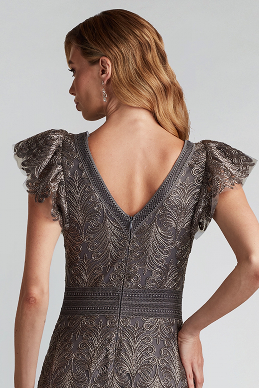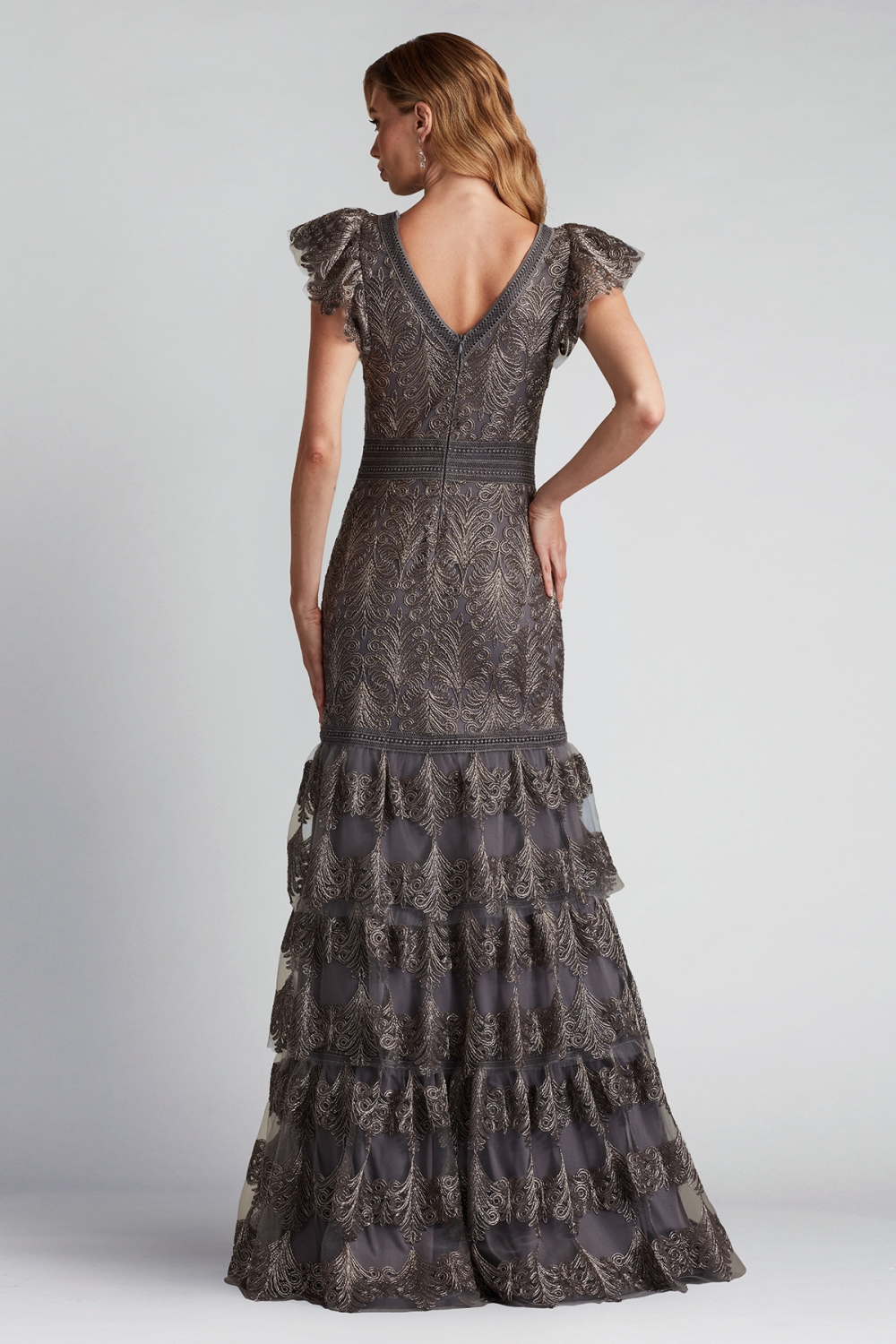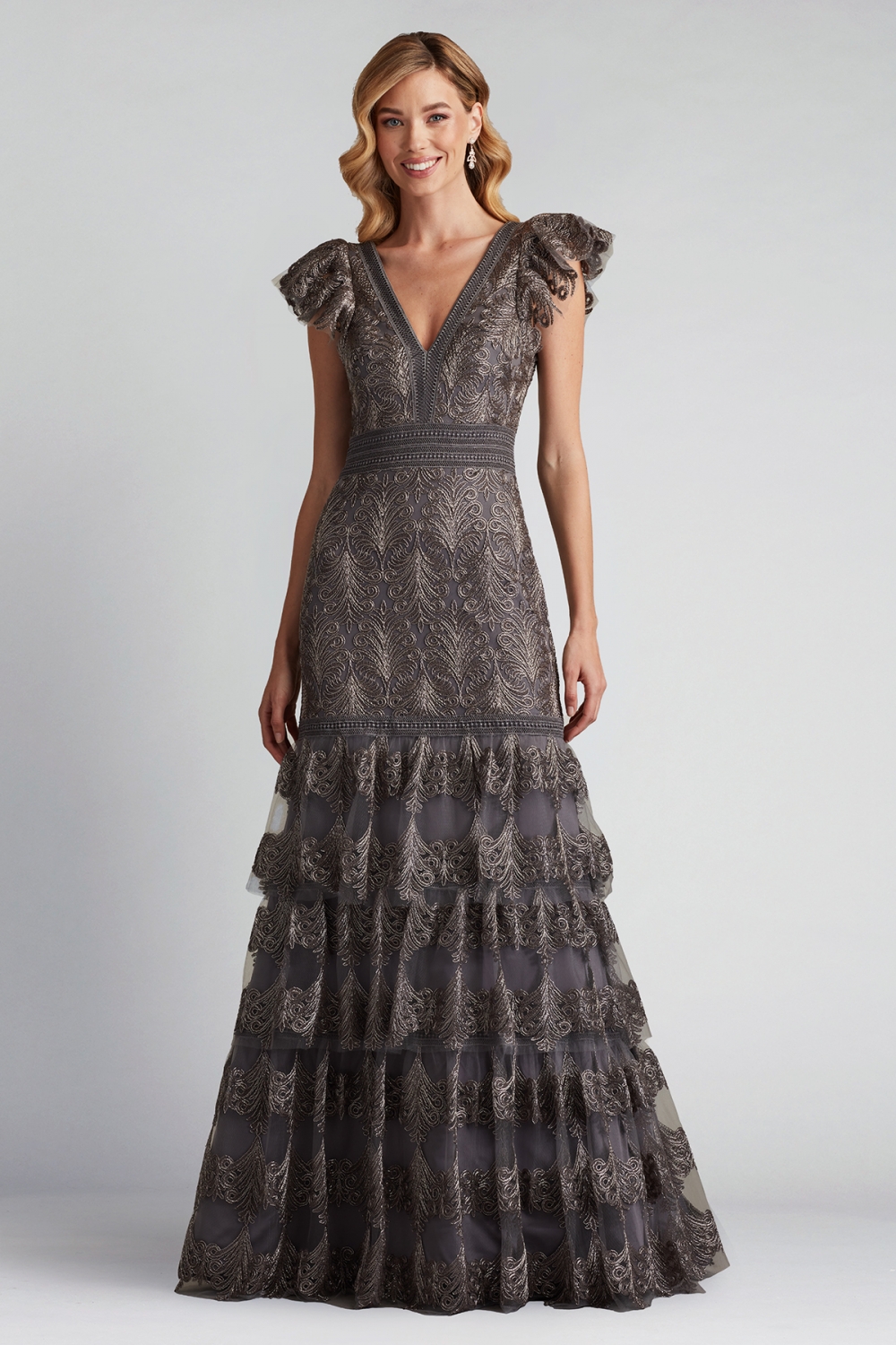 細やかに施された繊細な刺繍レースが、全身を包み込む贅沢なドレス。優美なVネックラインがデコルテを美しく見せ、ふんわりとしたショルダーデザインがさりげなく二の腕を隠し、なおかつ華やかさをプラスします。ティアード仕立てのスカート部分は、歩くたびに軽やかに揺れ、ドラマティックな表情を演出します。特別な日にふさわしい、ラグジュアリーな一着です。