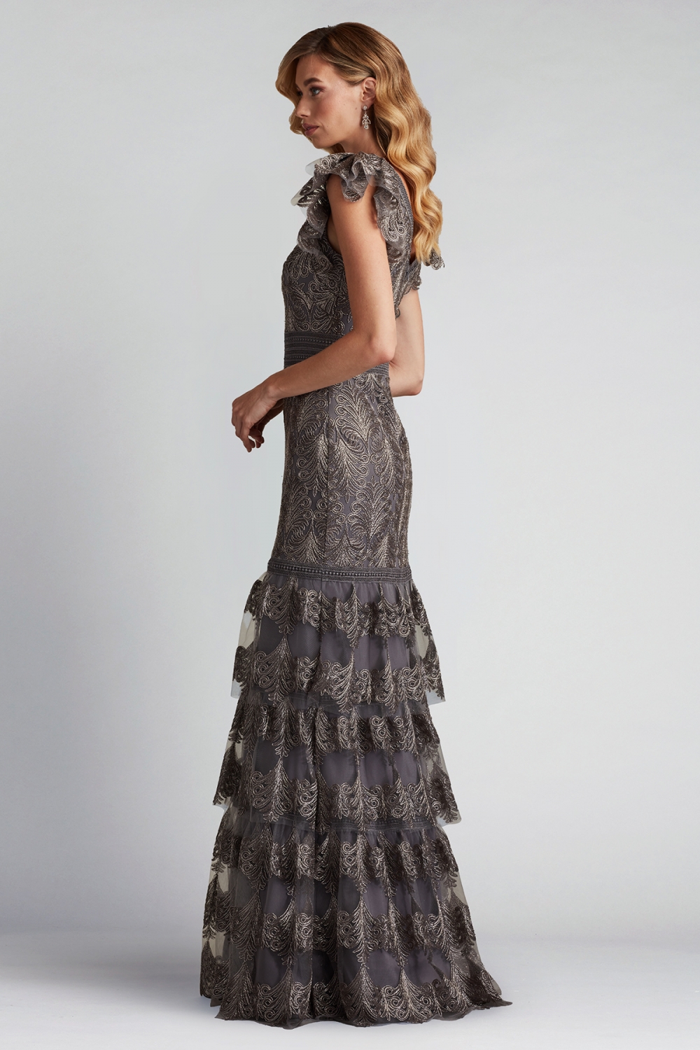 細やかに施された繊細な刺繍レースが、全身を包み込む贅沢なドレス。優美なVネックラインがデコルテを美しく見せ、ふんわりとしたショルダーデザインがさりげなく二の腕を隠し、なおかつ華やかさをプラスします。ティアード仕立てのスカート部分は、歩くたびに軽やかに揺れ、ドラマティックな表情を演出します。特別な日にふさわしい、ラグジュアリーな一着です。 ■新作商品一覧はこちら■ □ロングドレス一覧はこちら□ ■グレーの商品一覧はこちら■