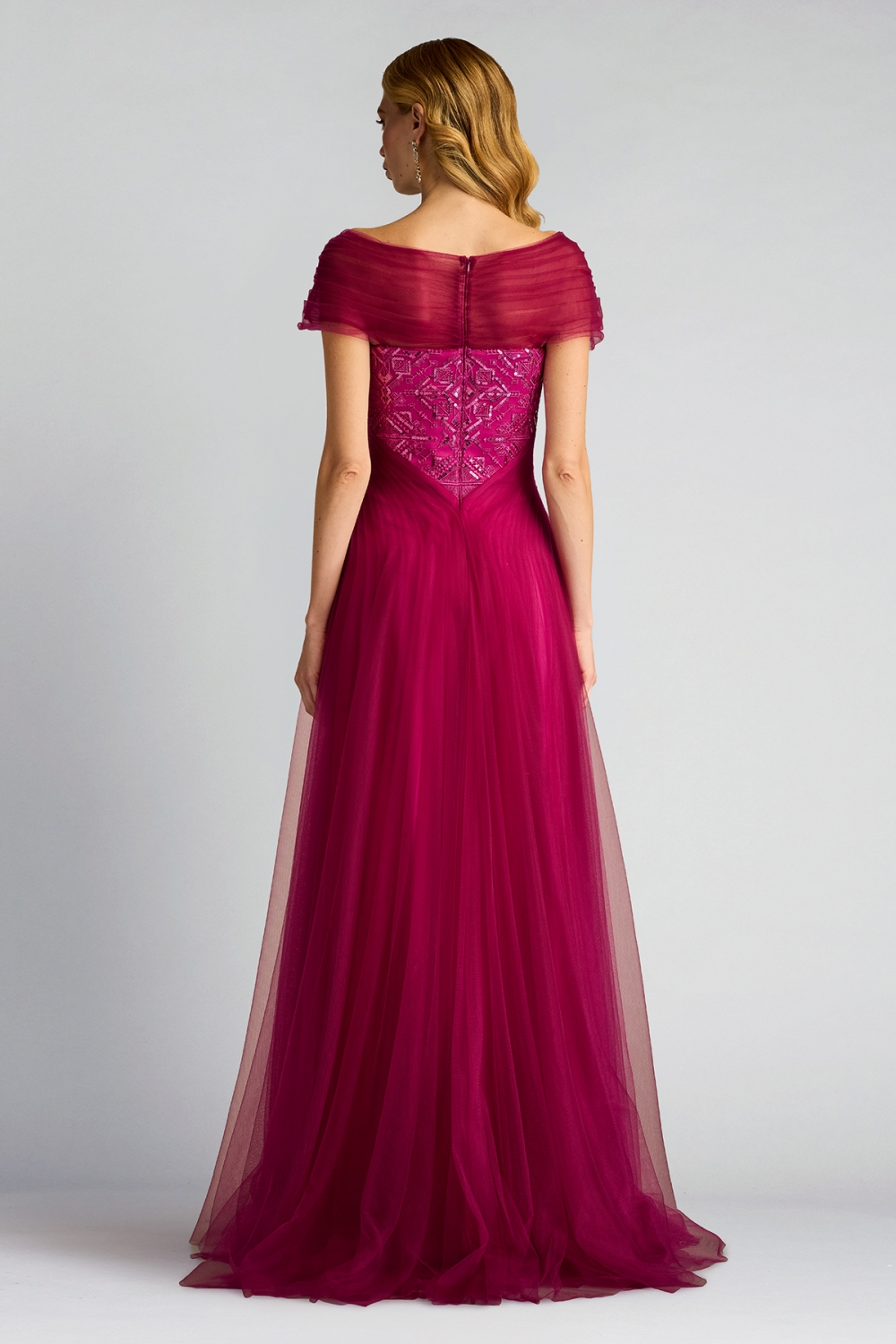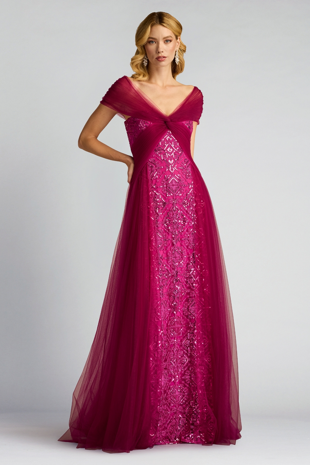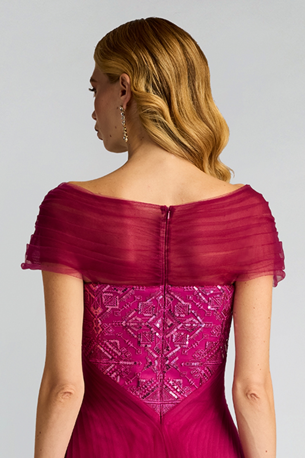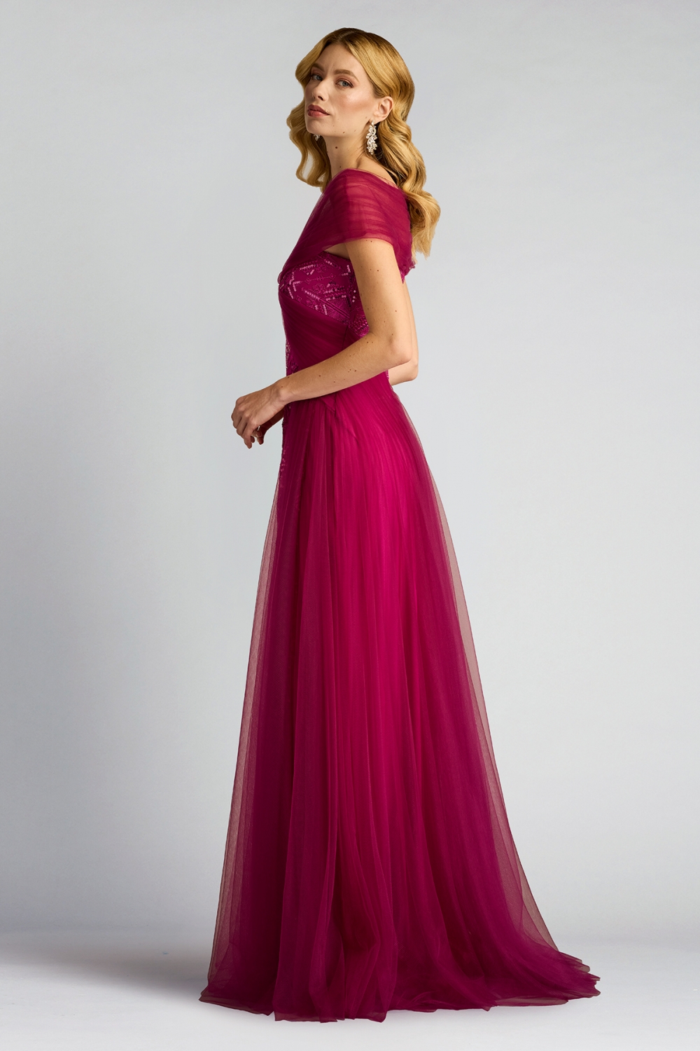 繊細な刺繍と煌めくスパンコールが織りなす華やかなレースと、ふわりと柔らかなチュールを組み合わせた、ロマンチックなデザイン。オフショルダー風のシアーなドレープがデコルテを美しく見せ、二の腕をカバーします。パーティーやステージなど、特別なシーンで皆の視線を集める、まさに主役級のドレスです。赤みを帯びたアメジストカラーが、優雅で上品な雰囲気を演出します。