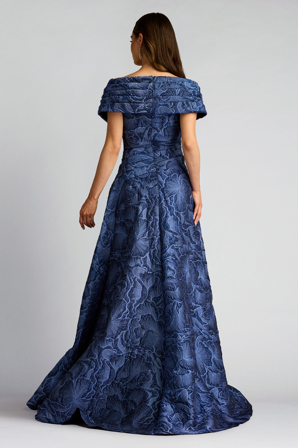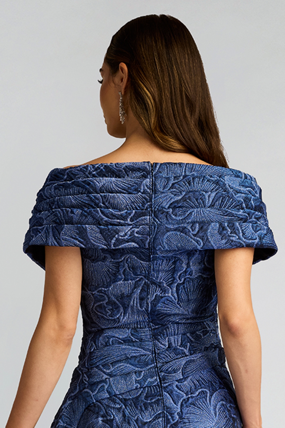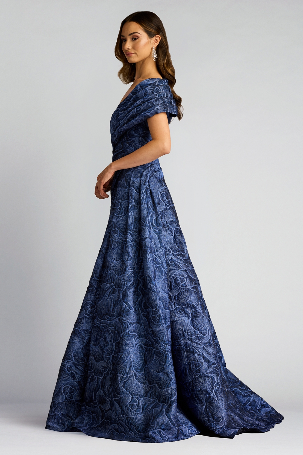 立体的なジャガード地が織りなす、まるでアートのような一着。彫刻のように型取られたドレーピングはオフショルダーラインから流れるようにウエストへとつながり、ボディラインを引き締めつつ、重厚感を演出します。フレアシルエットのスカート部分は、優雅な動きを生み出し、纏う人の美しさを引き立てます。圧倒的な存在感を放つロングドレスです。