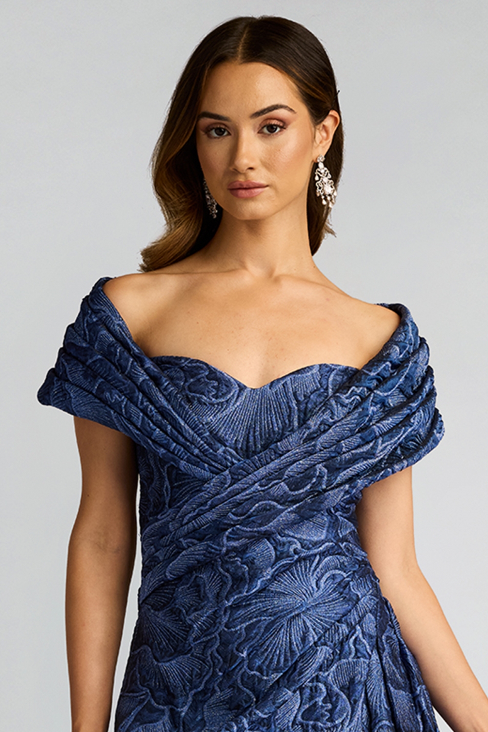 立体的なジャガード地が織りなす、まるでアートのような一着。彫刻のように型取られたドレーピングはオフショルダーラインから流れるようにウエストへとつながり、ボディラインを引き締めつつ、重厚感を演出します。フレアシルエットのスカート部分は、優雅な動きを生み出し、纏う人の美しさを引き立てます。圧倒的な存在感を放つロングドレスです。 ■新作商品一覧はこちら■ □ロングドレス一覧はこちら□ ■ネイビーの商品一覧はこちら■