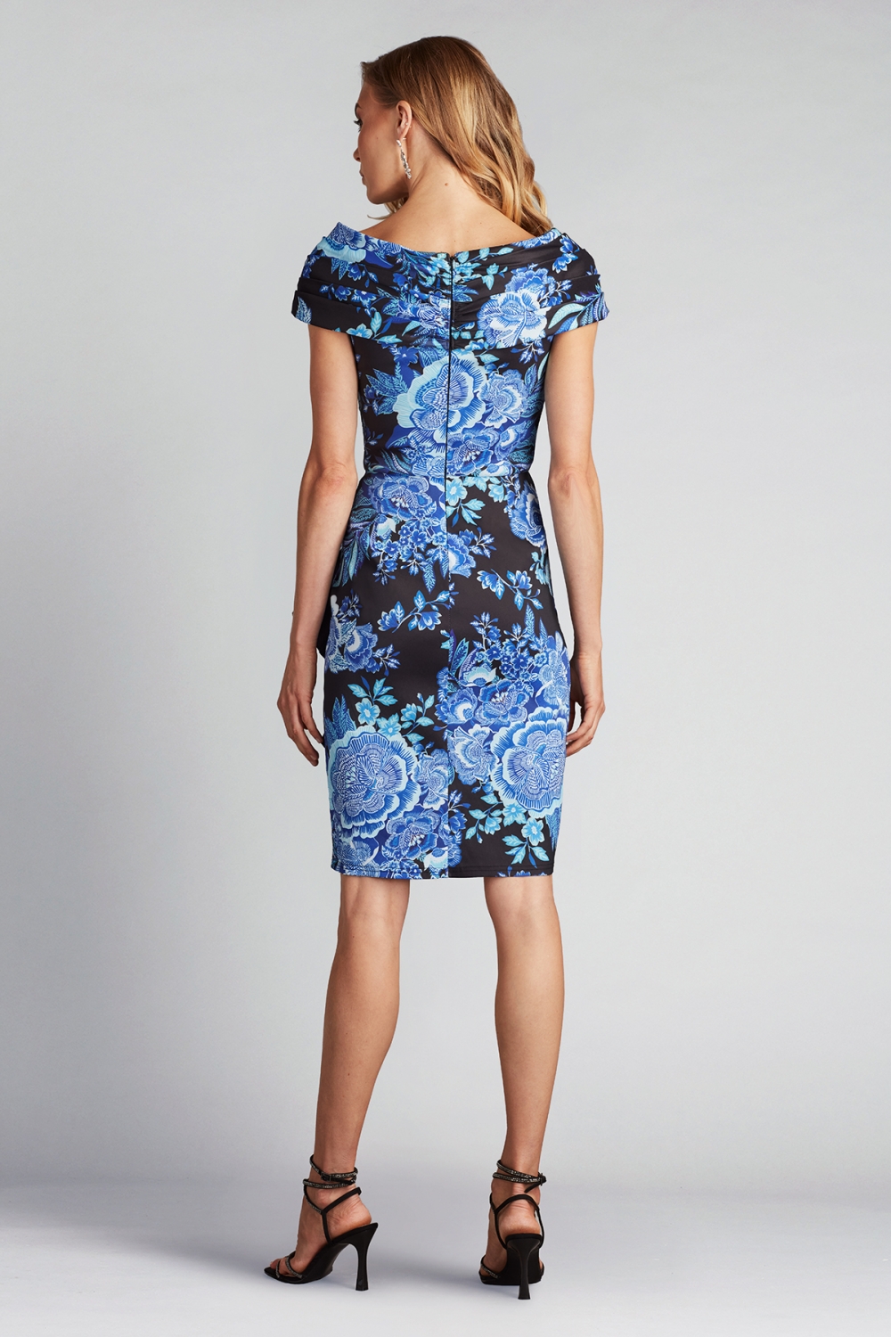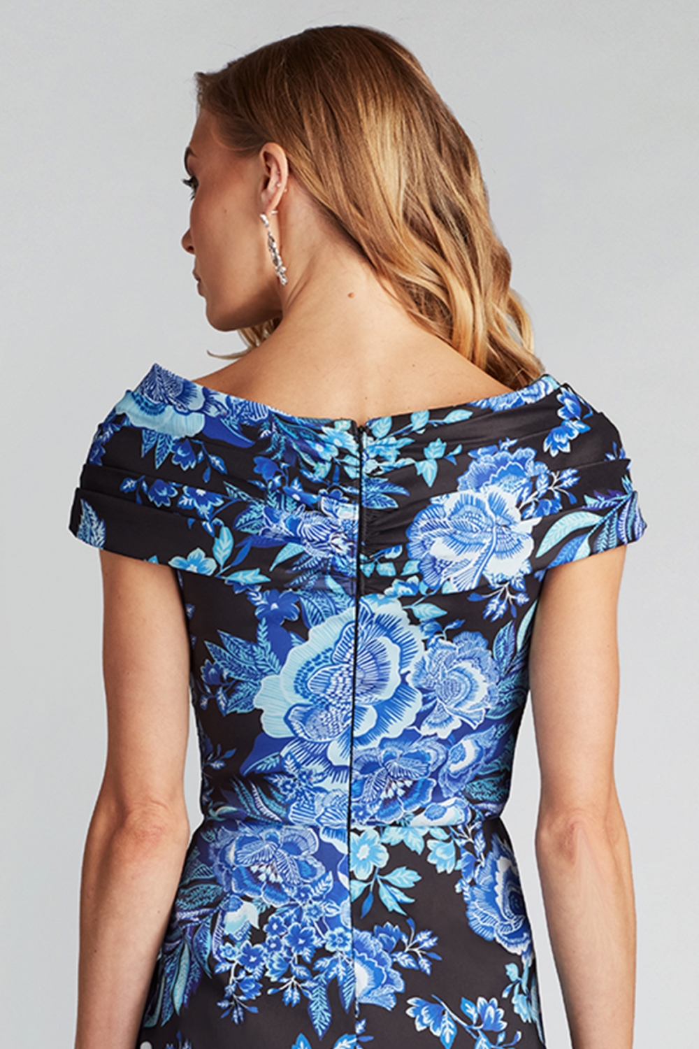 まるで夜空に咲く幻想的な花々をまとったかのようなドレス。深みのあるブラックをキャンバスに、鮮やかなブルーフローラルが美しく映え、洗練された大人のエレガンスを演出します。クロスドレープが立体感を作り出し、ウエストから流れるように落ちるフリルがシルエットに優雅な動きを生み出します。ドラマチックで、特別な日の主役にふさわしい一着です。