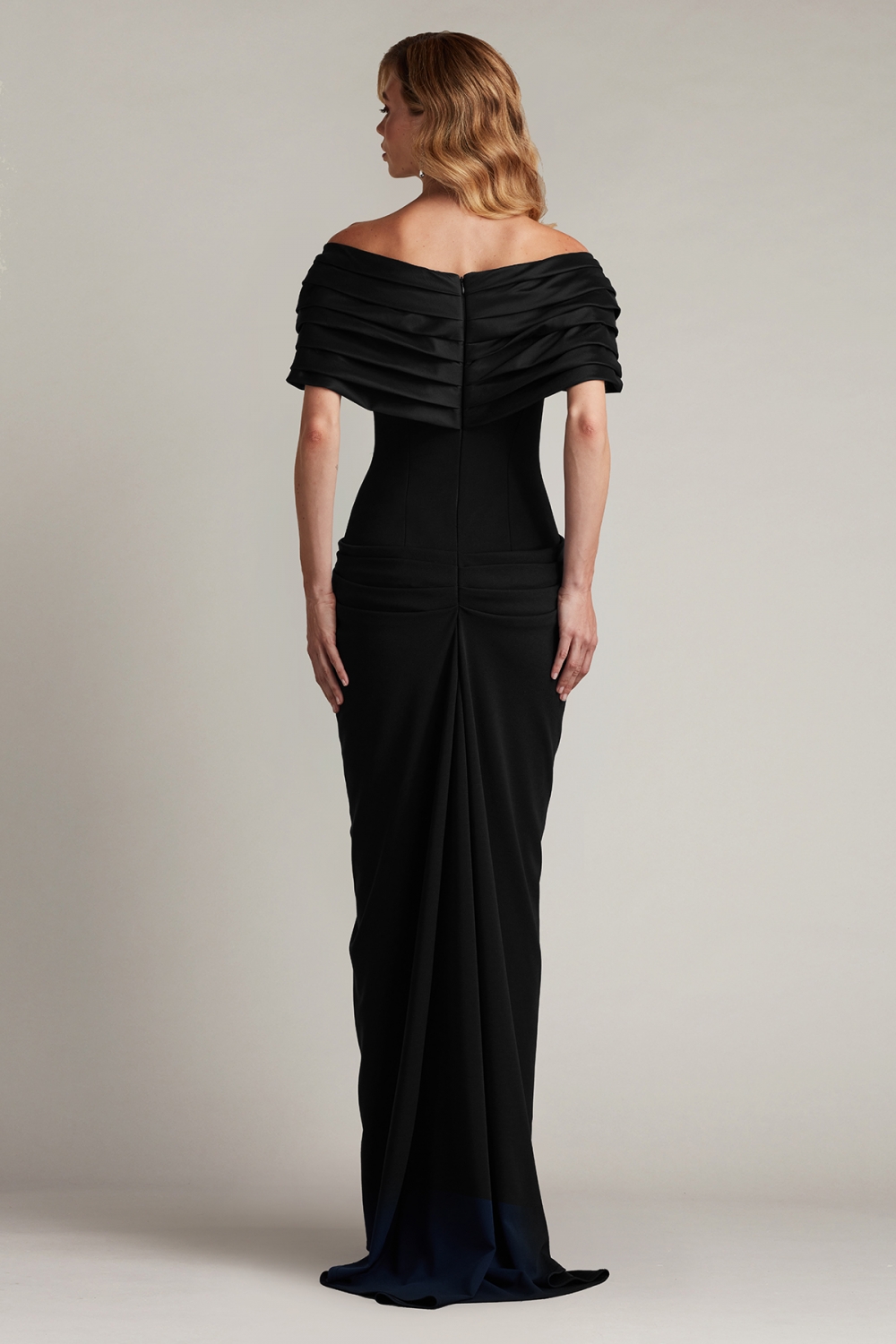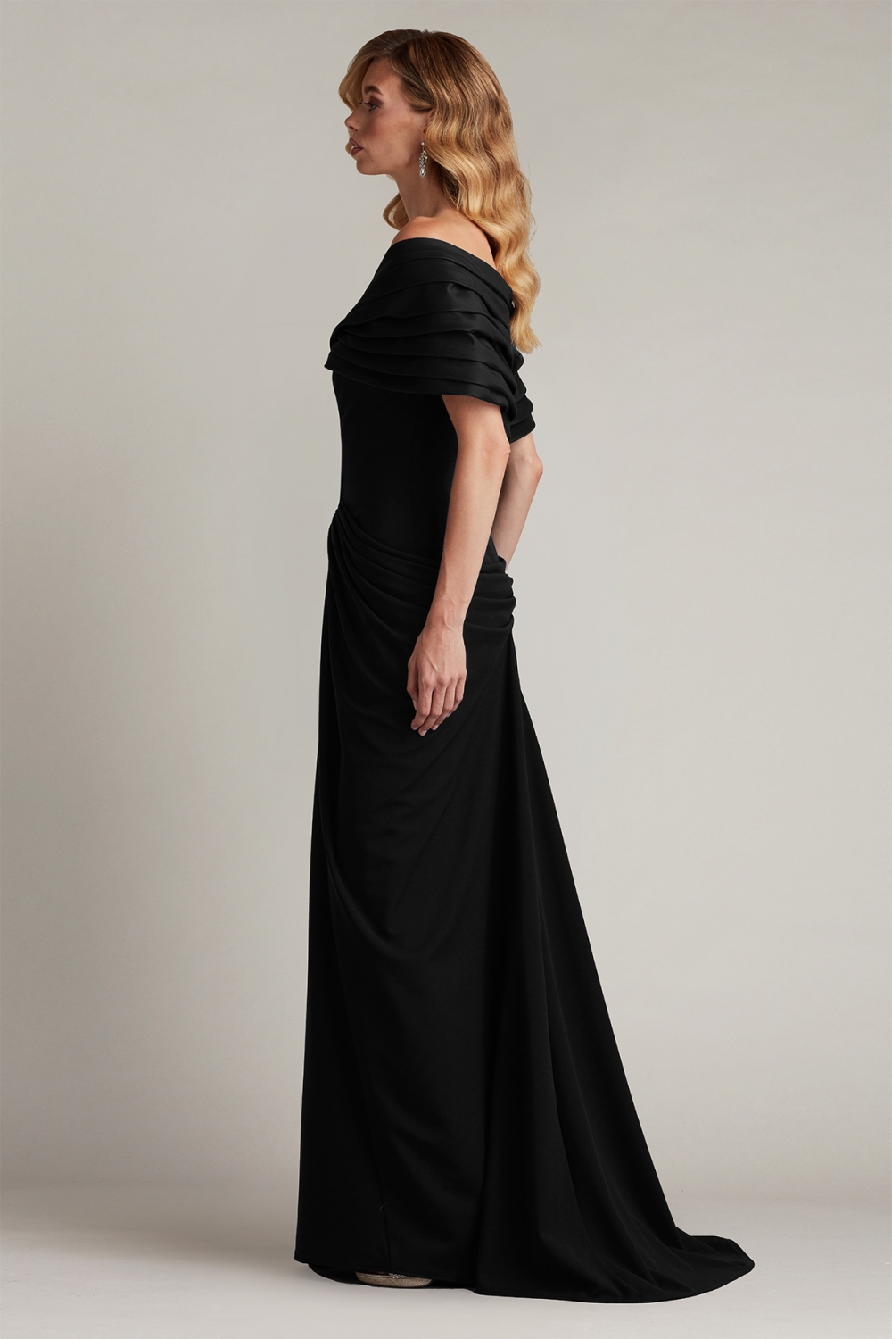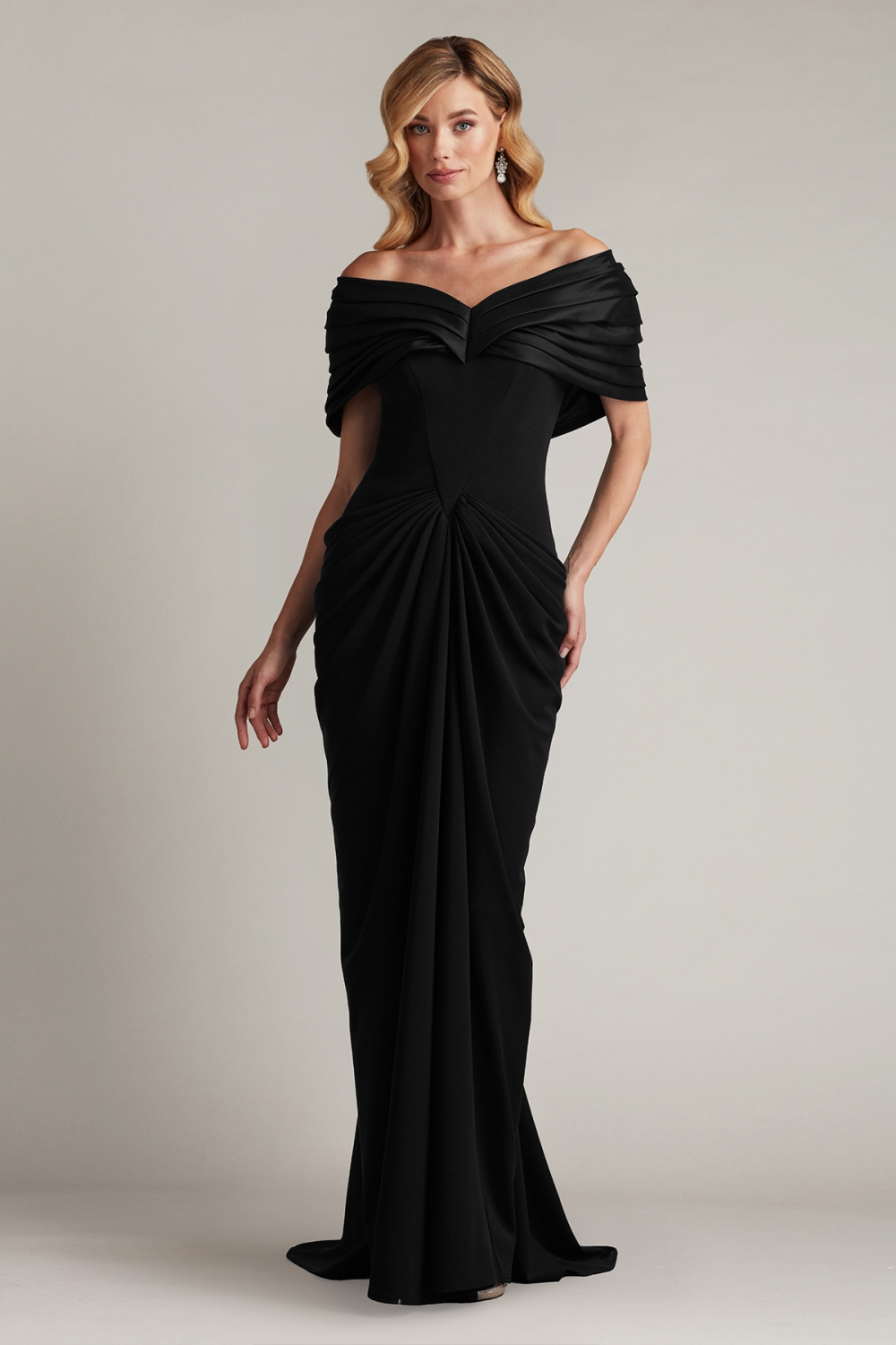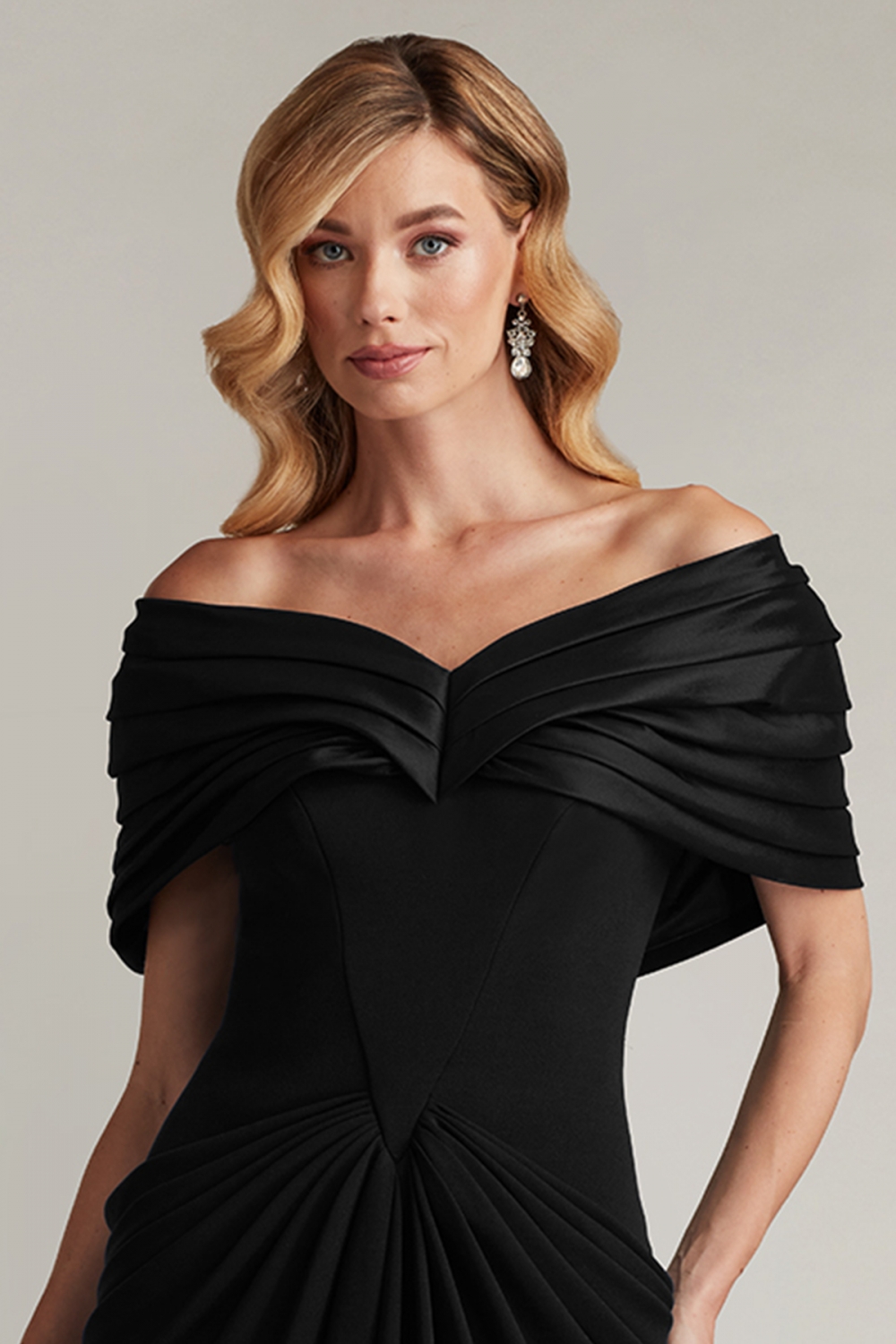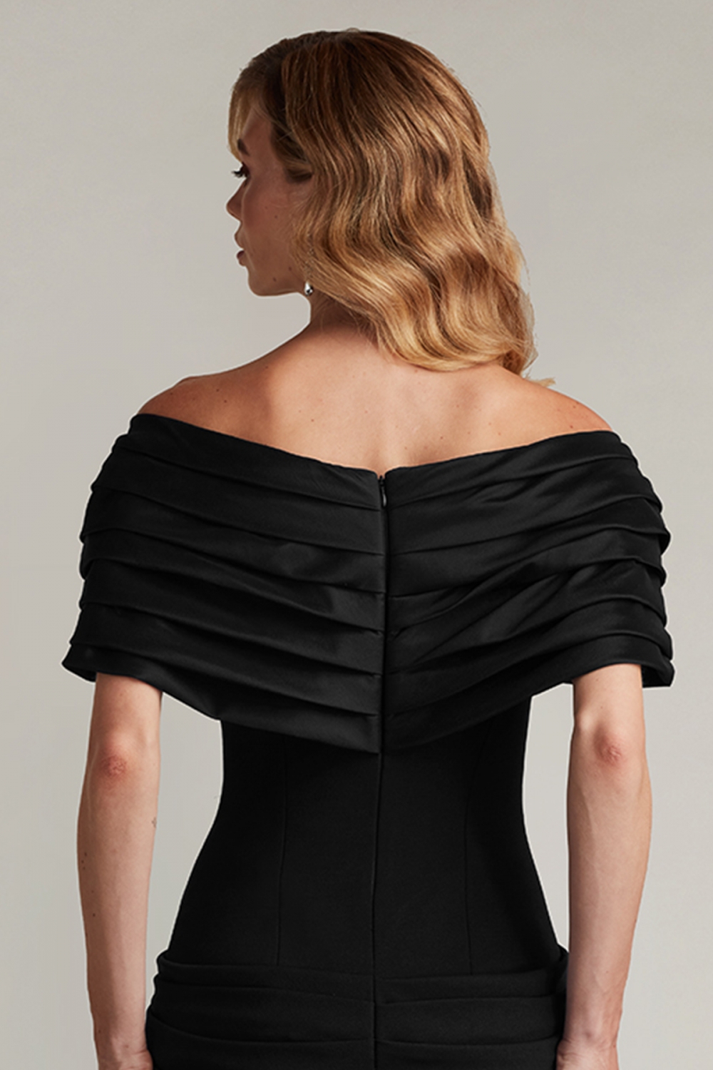 優雅さと洗練を極めたブラックドレス。オフショルダーがデコルテを美しく引き立て、立体的に重ねられたドレープが気品あるシルエットを演出します。ウエストに施されたギャザーが腰元を引き締め、砂時計のような美しいシルエットを描きながら、女性らしい曲線美を際立たせます。