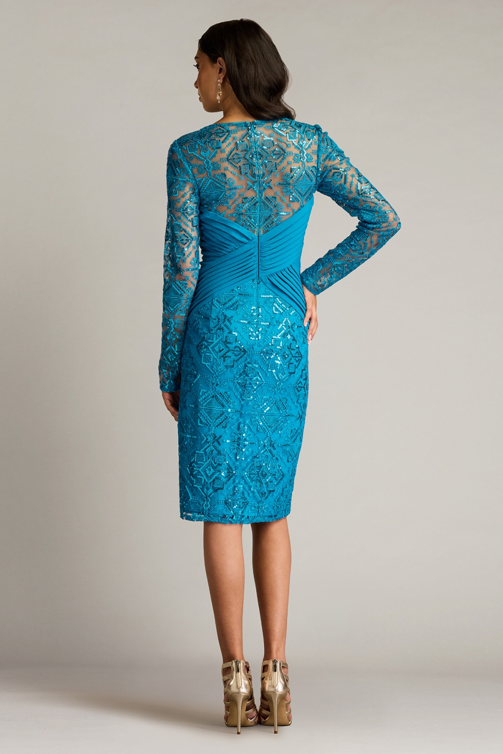 繊細なレースと構築的なウエストデザインが印象的な、マリンブルードレス。全面に施されたジオメトリックなレースは、華やかさの中にモダンな個性を漂わせ、袖やデコルテの透け感が軽やかで女性らしい雰囲気を演出します。ウエストを美しく引き締めるクロスドレープが、スタイルアップとメリハリのあるシルエットを叶え、視線を自然と引き寄せます。ひざ丈の程よいバランスが上品さを保ちながら、華やかなシーンにも映える存在感を放ちます。 ■新作商品一覧はこちら■ □ミディアムドレス一覧はこちら□ ■ブルーの商品一覧はこちら■