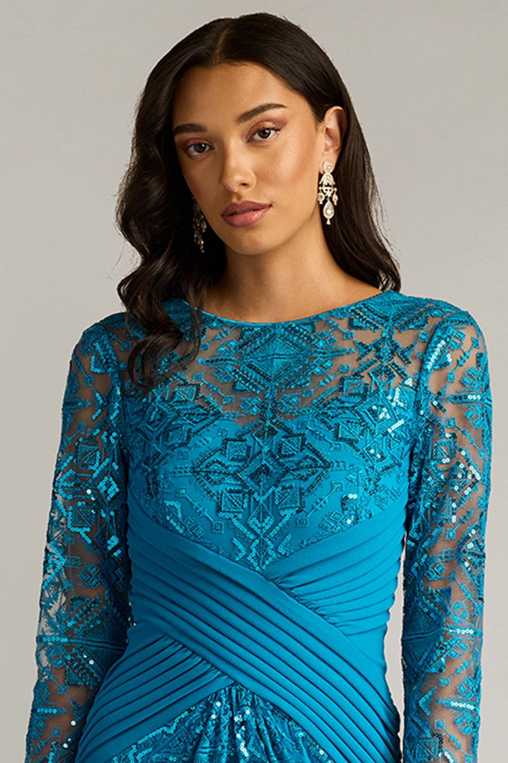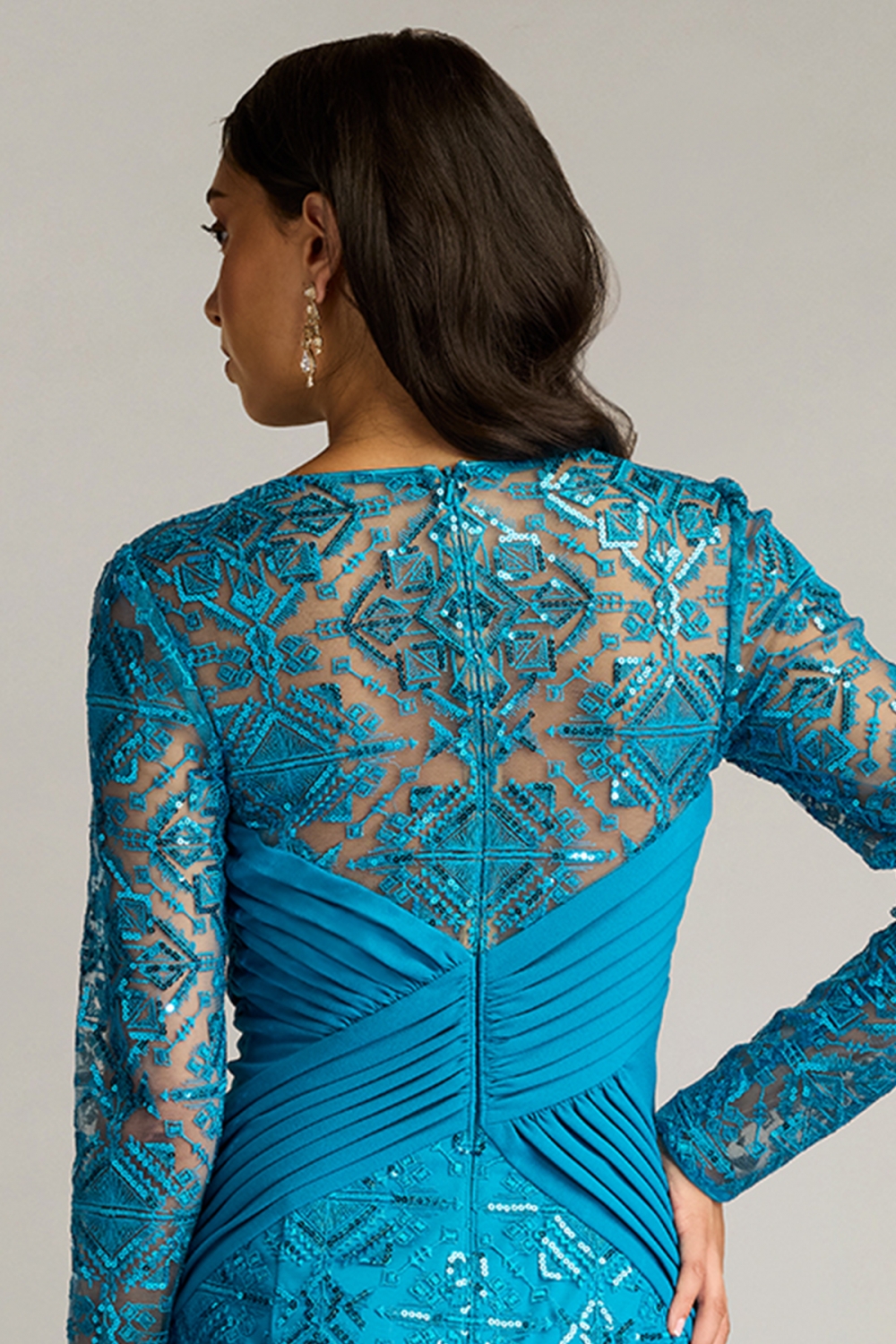 繊細なレースと構築的なウエストデザインが印象的な、マリンブルードレス。全面に施されたジオメトリックなレースは、華やかさの中にモダンな個性を漂わせ、袖やデコルテの透け感が軽やかで女性らしい雰囲気を演出します。ウエストを美しく引き締めるクロスドレープが、スタイルアップとメリハリのあるシルエットを叶え、視線を自然と引き寄せます。ひざ丈の程よいバランスが上品さを保ちながら、華やかなシーンにも映える存在感を放ちます。