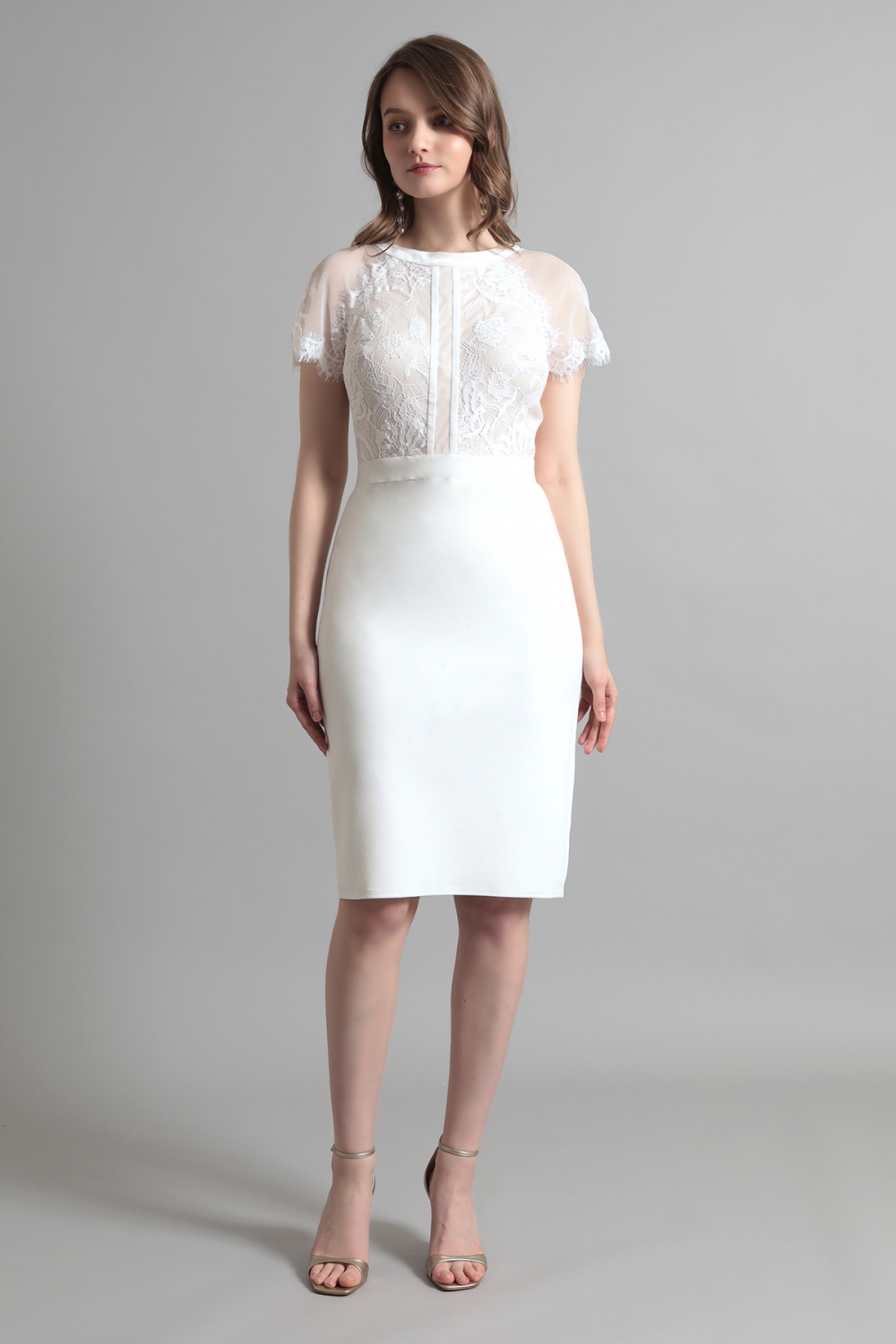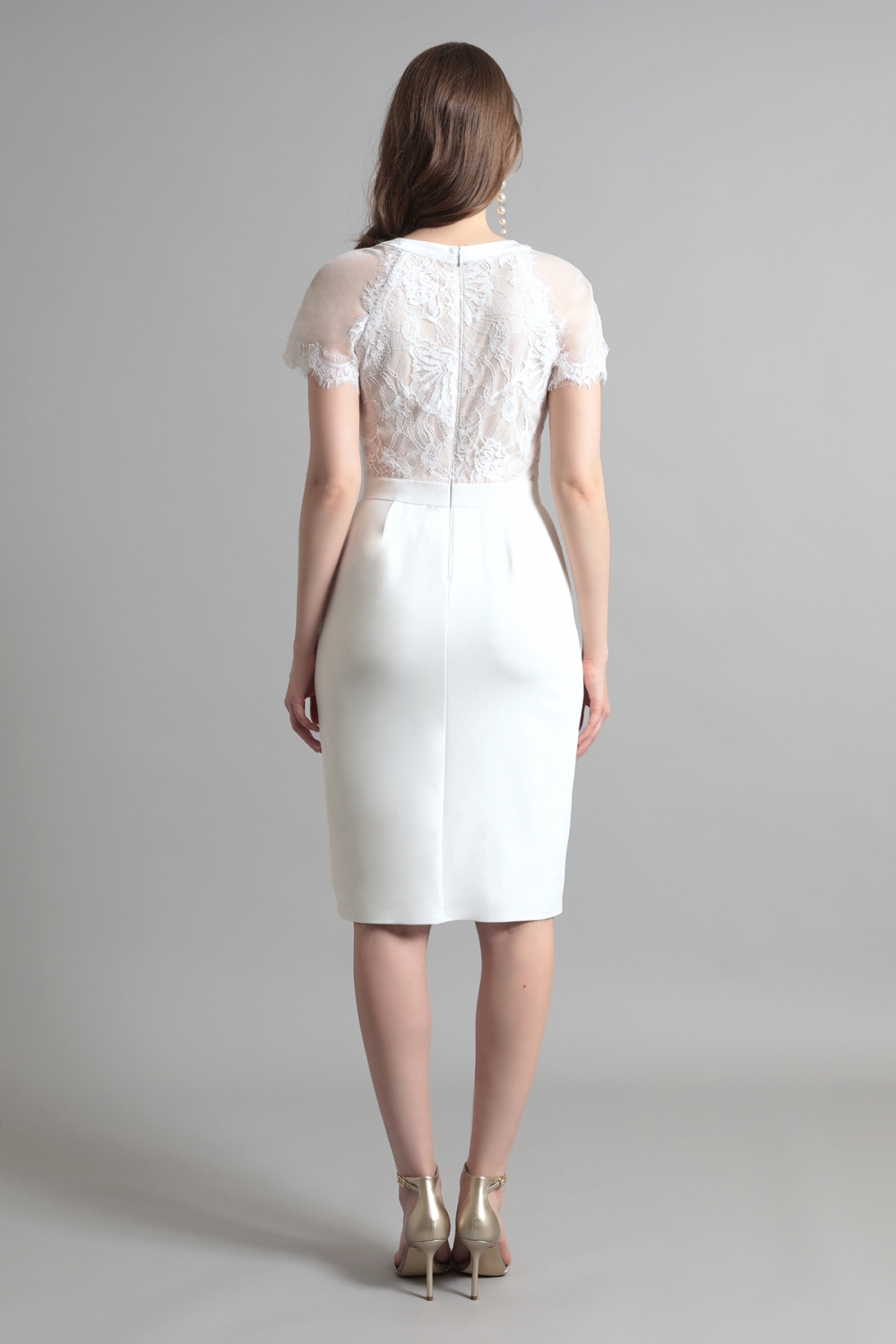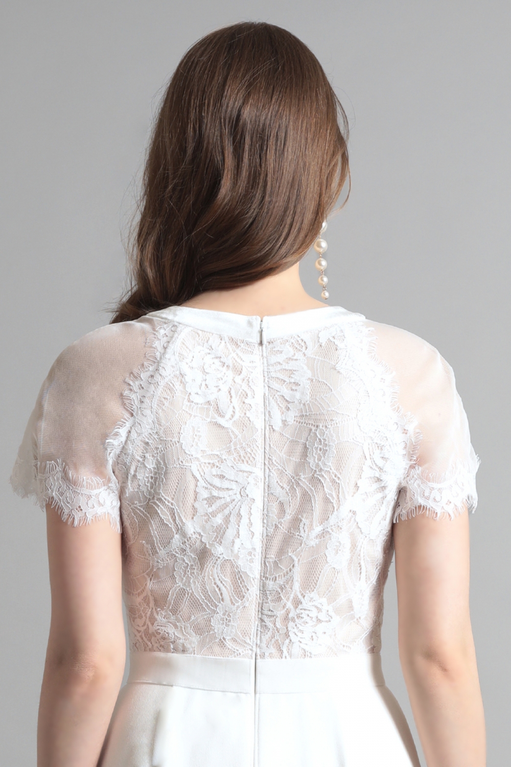 やわらかなアイボリーカラーが清楚な印象を与えます。繊細なレースのトップスはシアー感のあるチュールと組み合わせることで、軽やかで上品な透け感を演出します。ふんわりと広がるフレアスリーブが優美な余韻を残し、ボディに程よくフィットするスカートが美しい縦ラインを際立たせます。パーティーはもちろん、ランチやディナーにも。日常を少し特別に彩る一着です。 モデルサイズ 身長170cm B:81cm W:60cm H:90cm /サイズ0着用 ■新作商品一覧はこちら■ □ミディアムドレス一覧はこちら□ ■デイリードレス一覧はこちら■ □アイボリーの商品一覧はこちら□