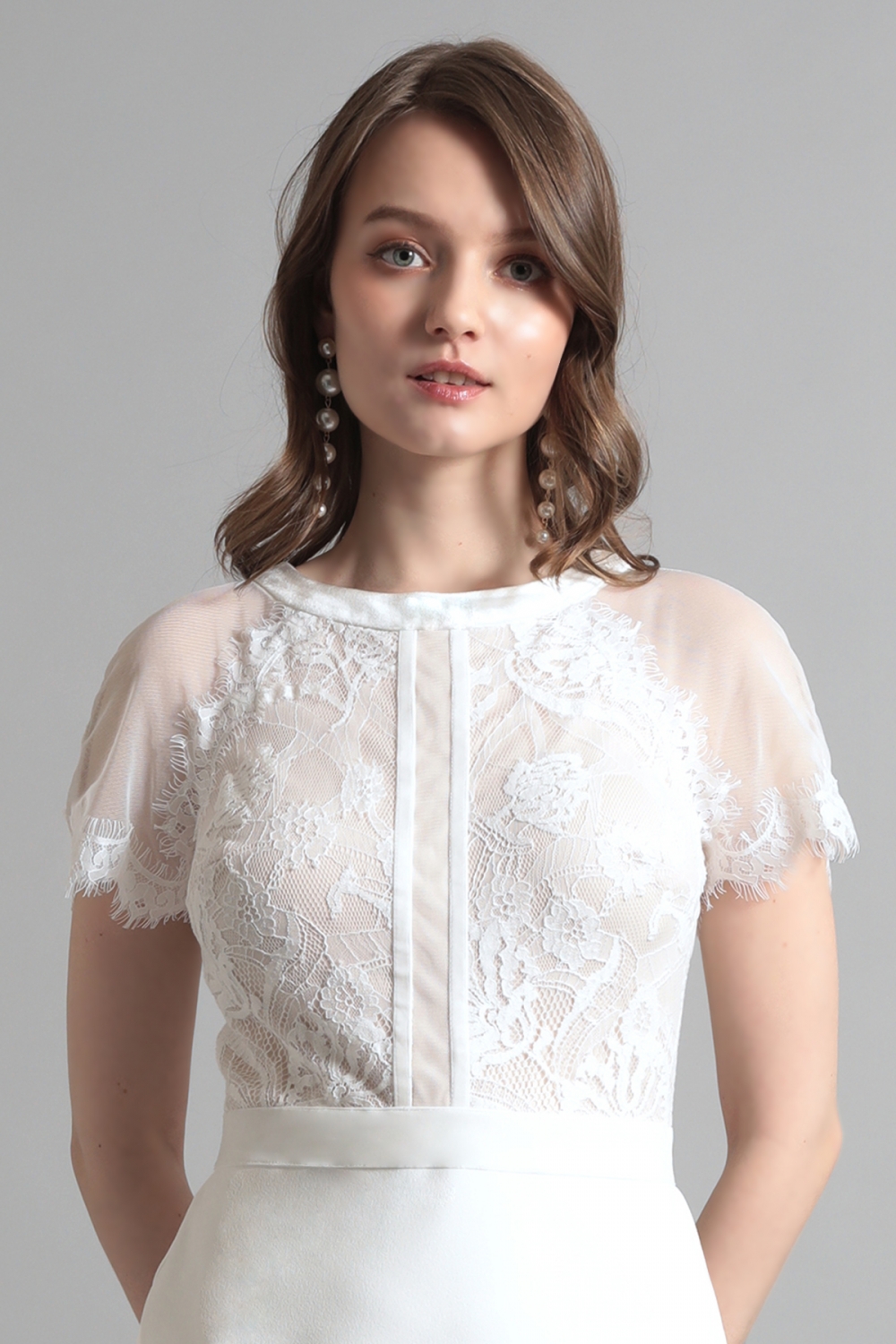 やわらかなアイボリーカラーが清楚な印象を与えます。繊細なレースのトップスはシアー感のあるチュールと組み合わせることで、軽やかで上品な透け感を演出します。ふんわりと広がるフレアスリーブが優美な余韻を残し、ボディに程よくフィットするスカートが美しい縦ラインを際立たせます。パーティーはもちろん、ランチやディナーにも。日常を少し特別に彩る一着です。