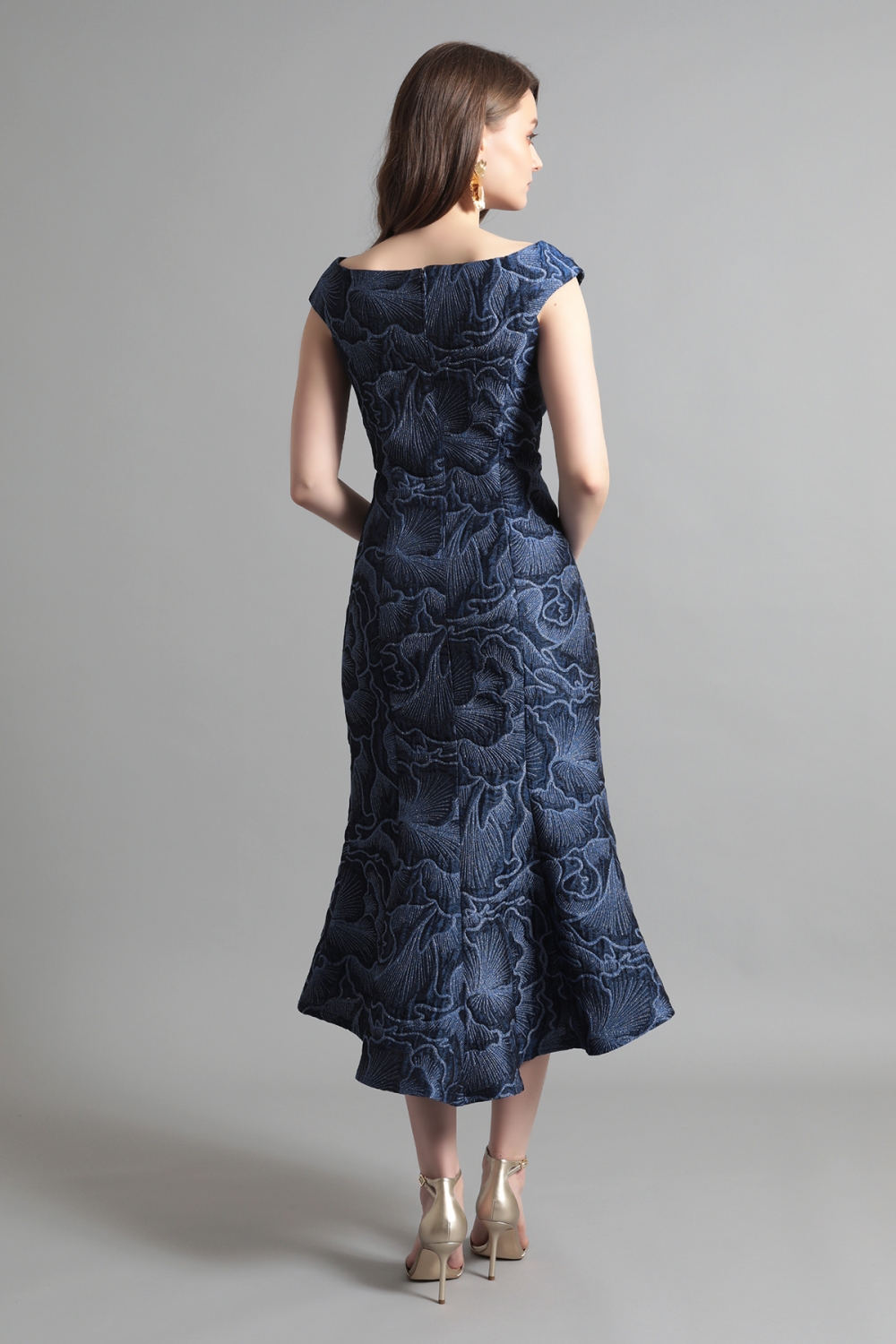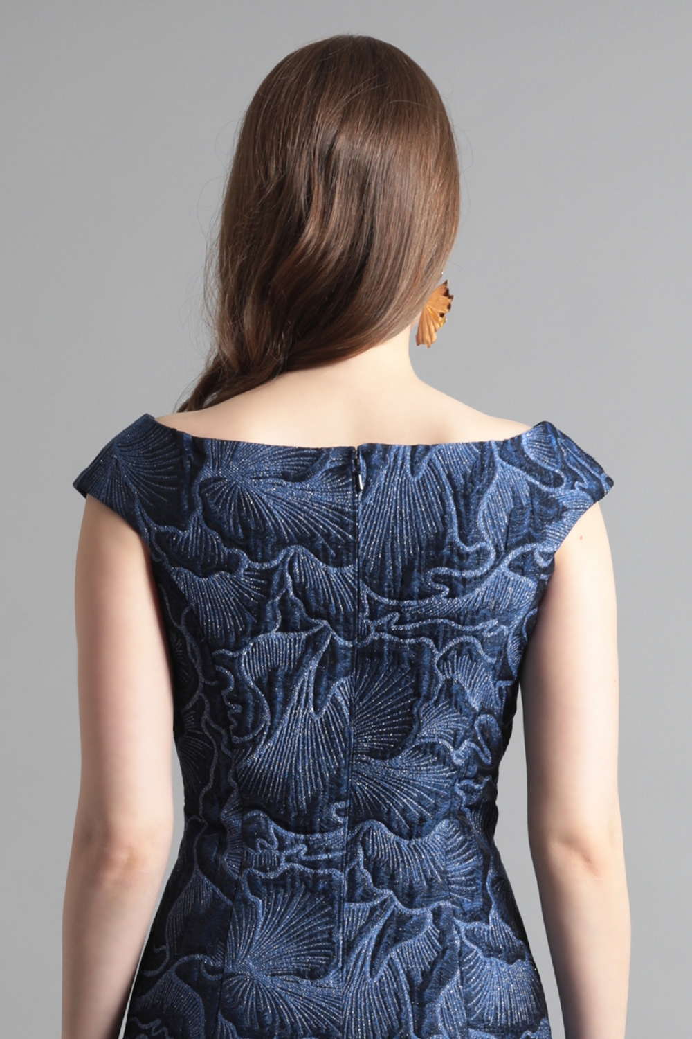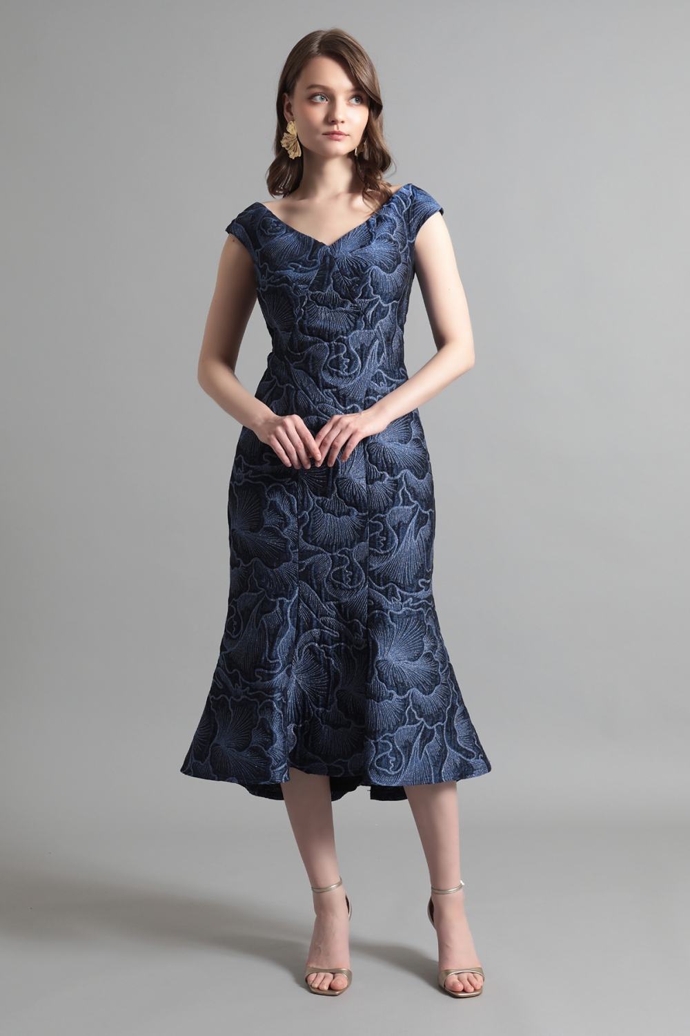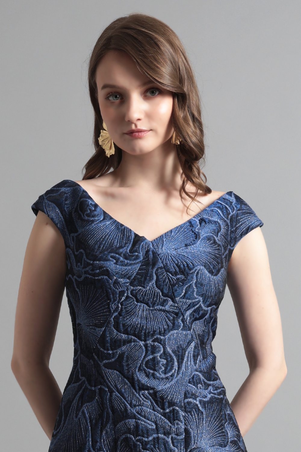 ミッドナイトブルーのジャカードが描き出す陰影が、静かな存在感を放つドレス。立体的に織り上げられたフラワーモチーフが生地に奥行きを与え、見る角度によってさまざまな表情を見せてくれます。胸元を美しく見せるVネックラインと、身体に沿うように設計されたシルエットが、すっきりとした印象を与え洗練されたスタイルを完成させます。