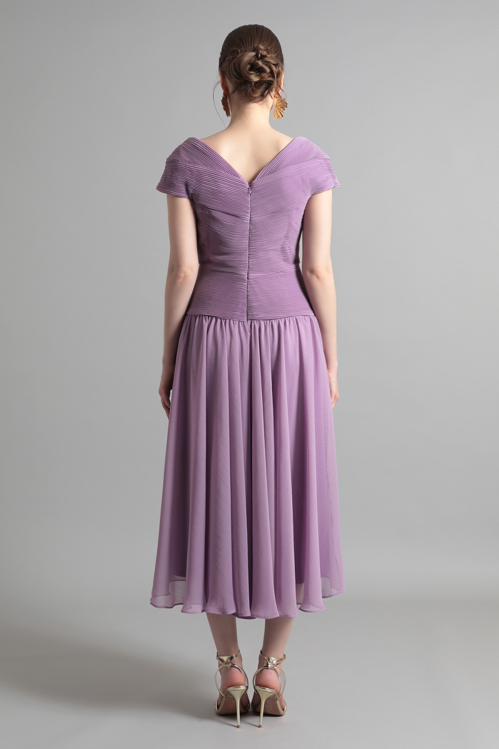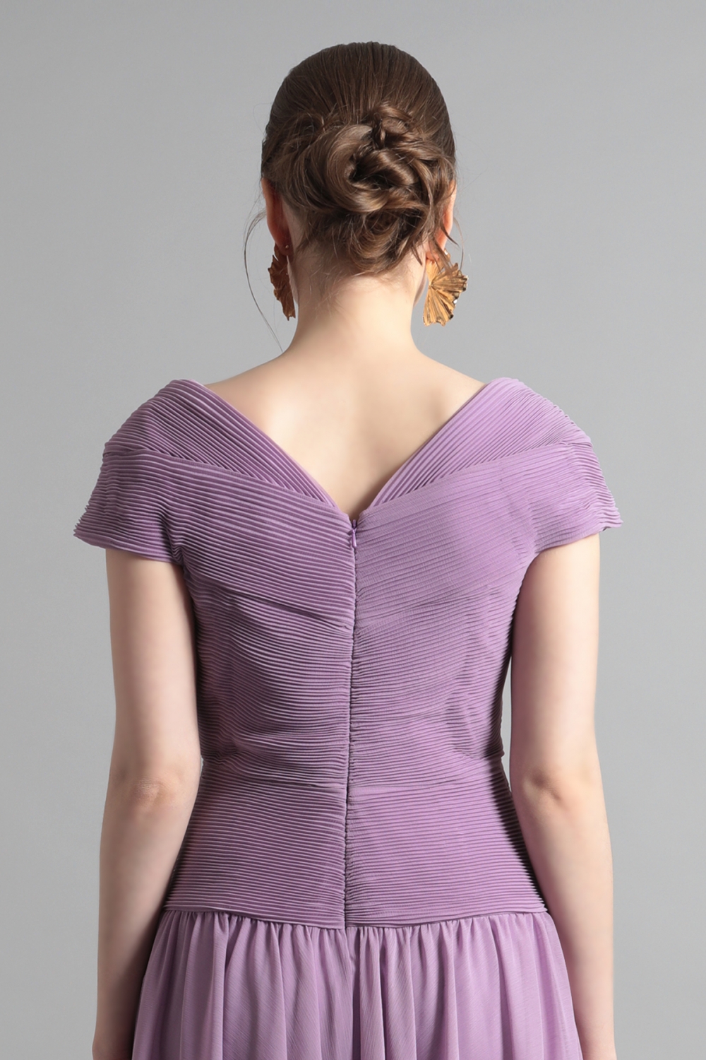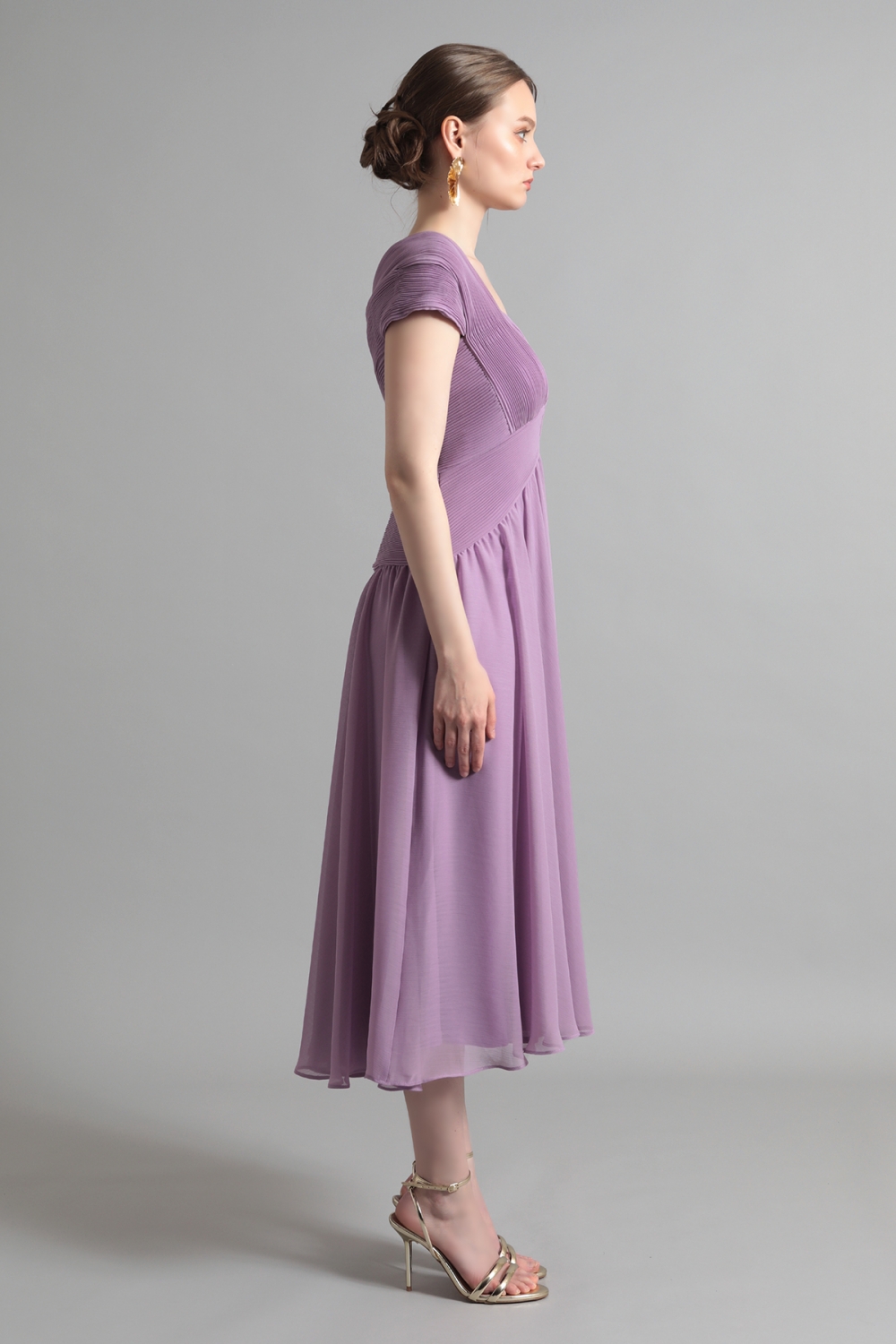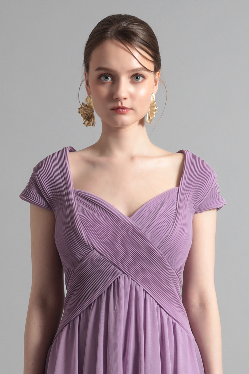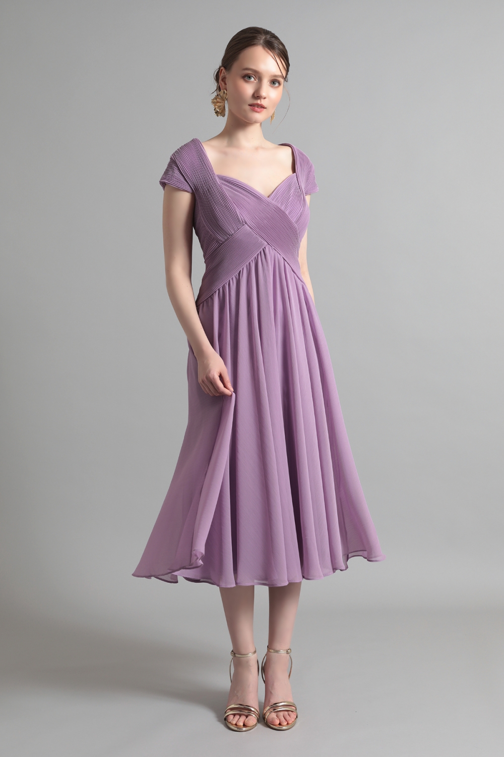 優美なラベンダーカラーが印象的なドレス。上半身は繊細なプリーツが交差するように配され、胸元を立体的に美しく演出します。キャップスリーブへ続くショルダーラインがデコルテを品よく引き立て、程よい肌見せを叶えます。スカート部分は軽やかなシフォンがふんわりと広がり、歩くたびにやさしく揺れてエレガントな余韻を残します。クラシカルでありながら、静かに個性を主張する一着です。