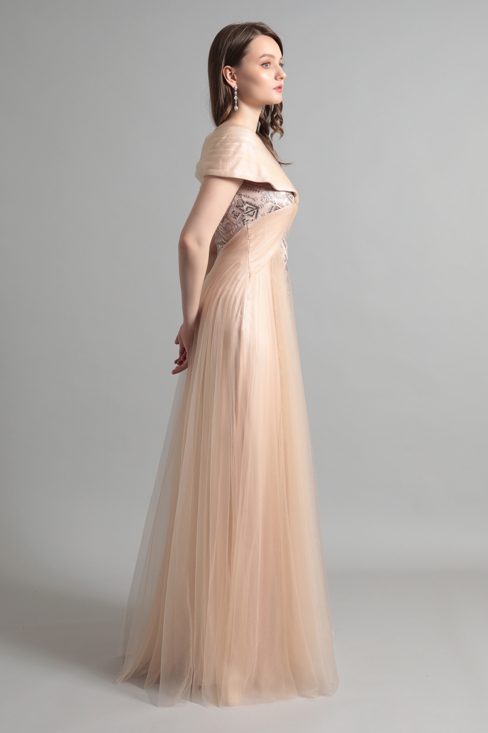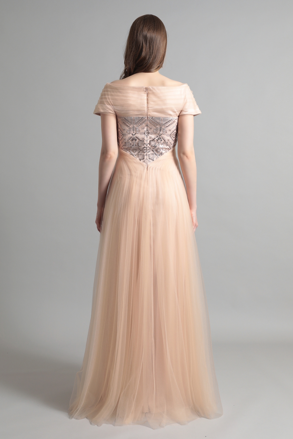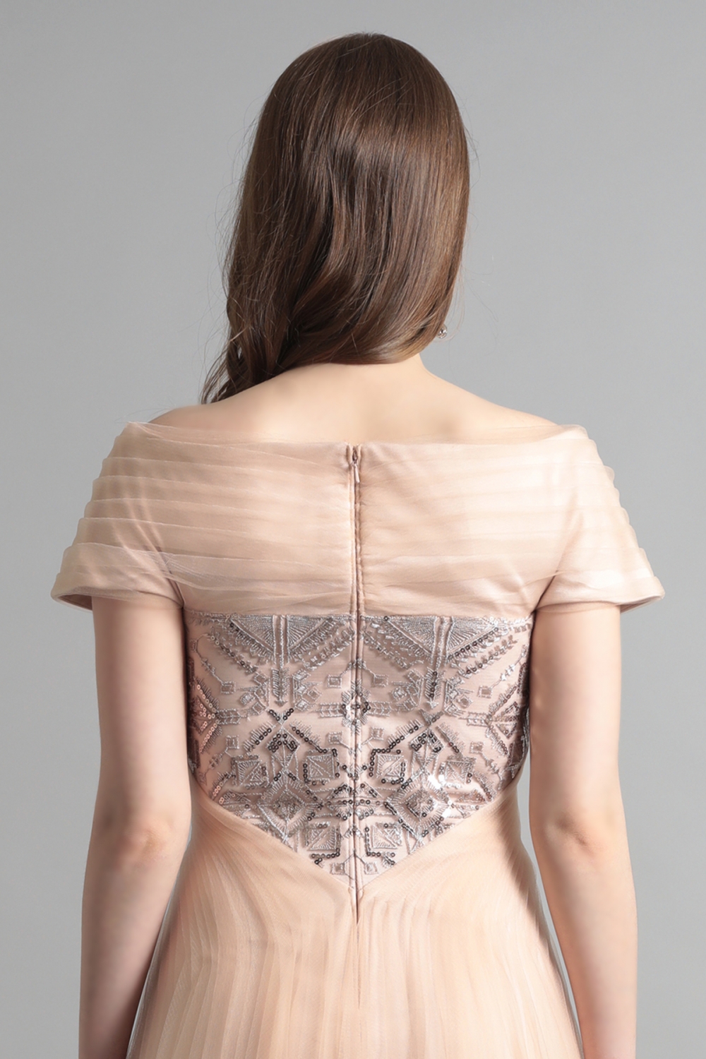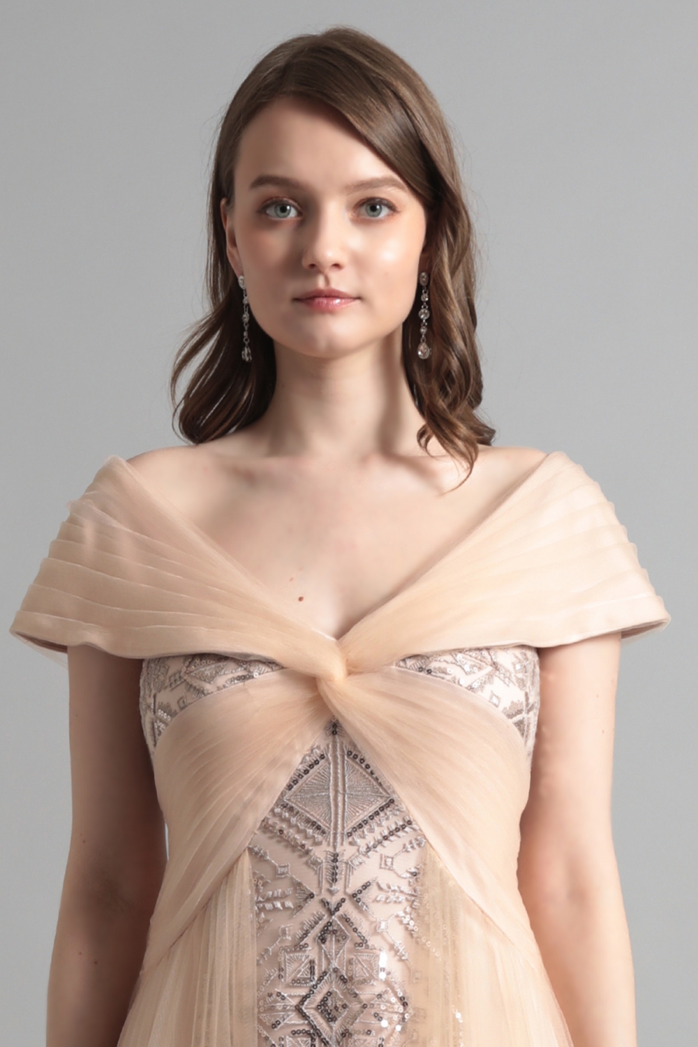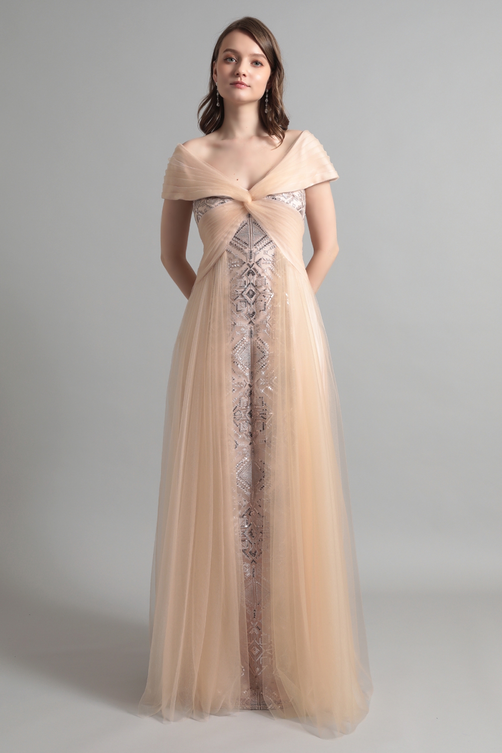 繊細なチュールが優雅に重なり、気品あふれる佇まいを描き出します。デコルテを包み込むように流れる胸元のノットデザインが、柔らかな立体感を生み出し、フロントに覗くジオメトリックなビーズ刺繍が、モダンで洗練されたアクセントを添え、全体に奥行きと輝きをもたらします。幻想的でロマンティックなムードを纏いながら、肌に溶け込むピンクベージュカラーが柔らかな華やかさを演出します。