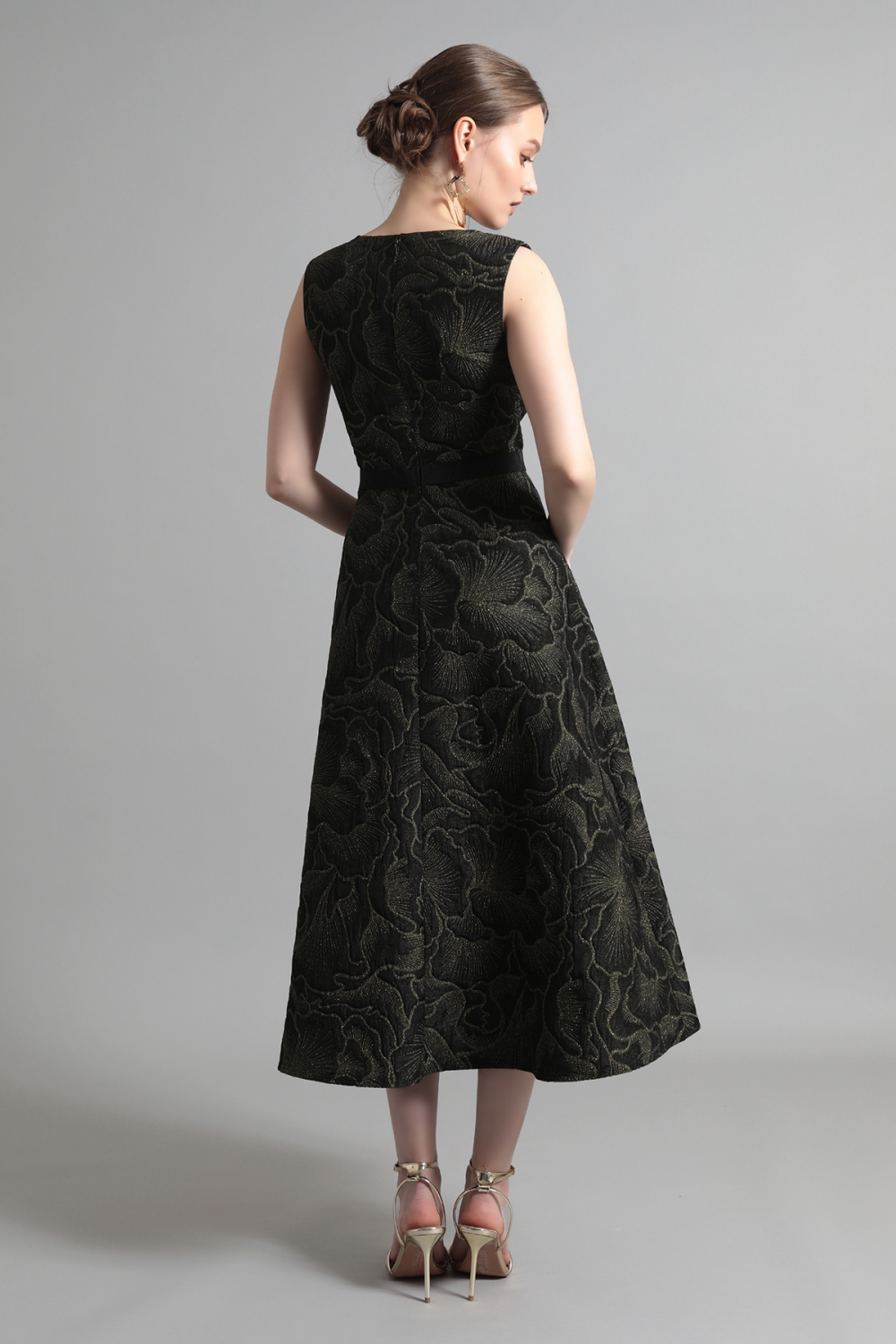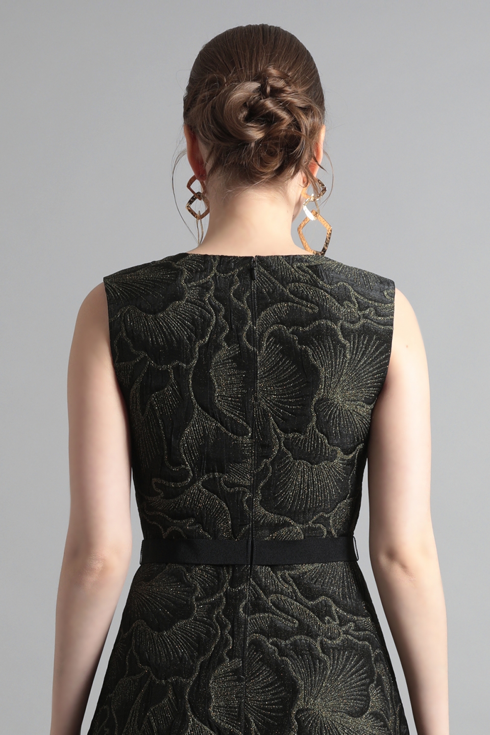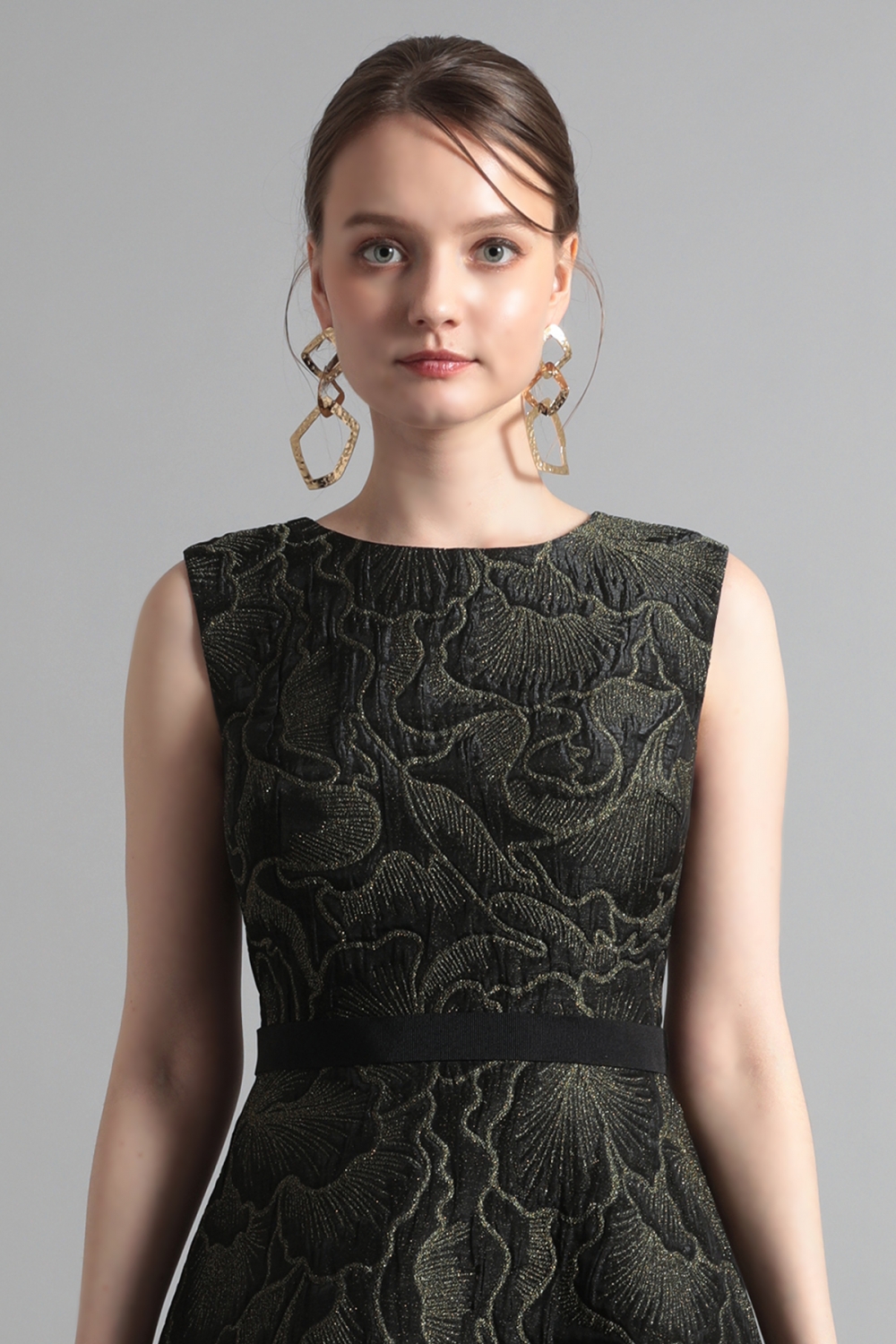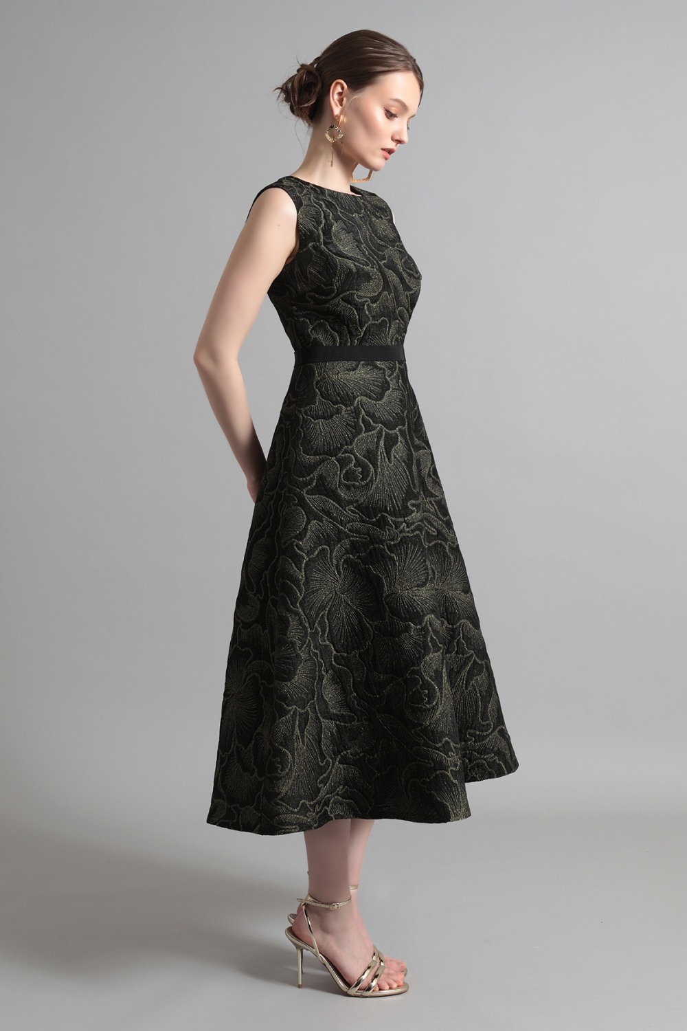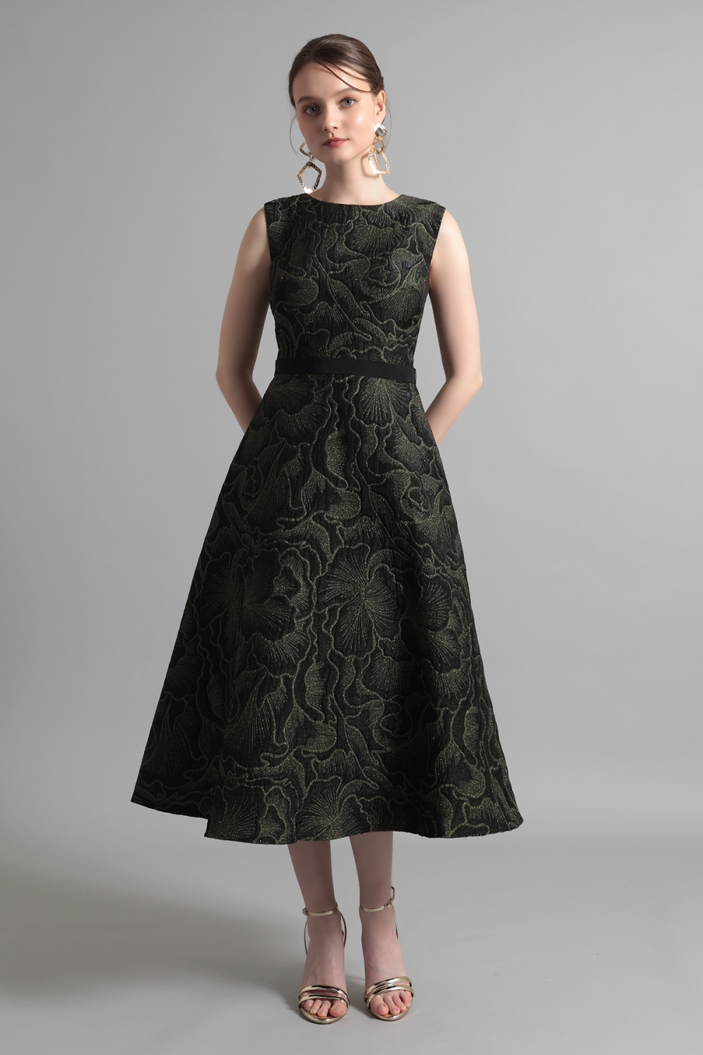 シンプルなフィットアンドフレアーのシルエットに、存在感のあるジャカード生地が際立つミモレ丈ドレス。ブラックにゴールドで織り込まれたボタニカルモチーフが、立体的な陰影を生み、ドレス全体に奥行きと高級感をもたらします。素材の美しさを引き立てる構築的なデザインが魅力です。パーティーはもちろん、シンプルなジャケットと共にデイウェアーとしても活躍する一着です。
