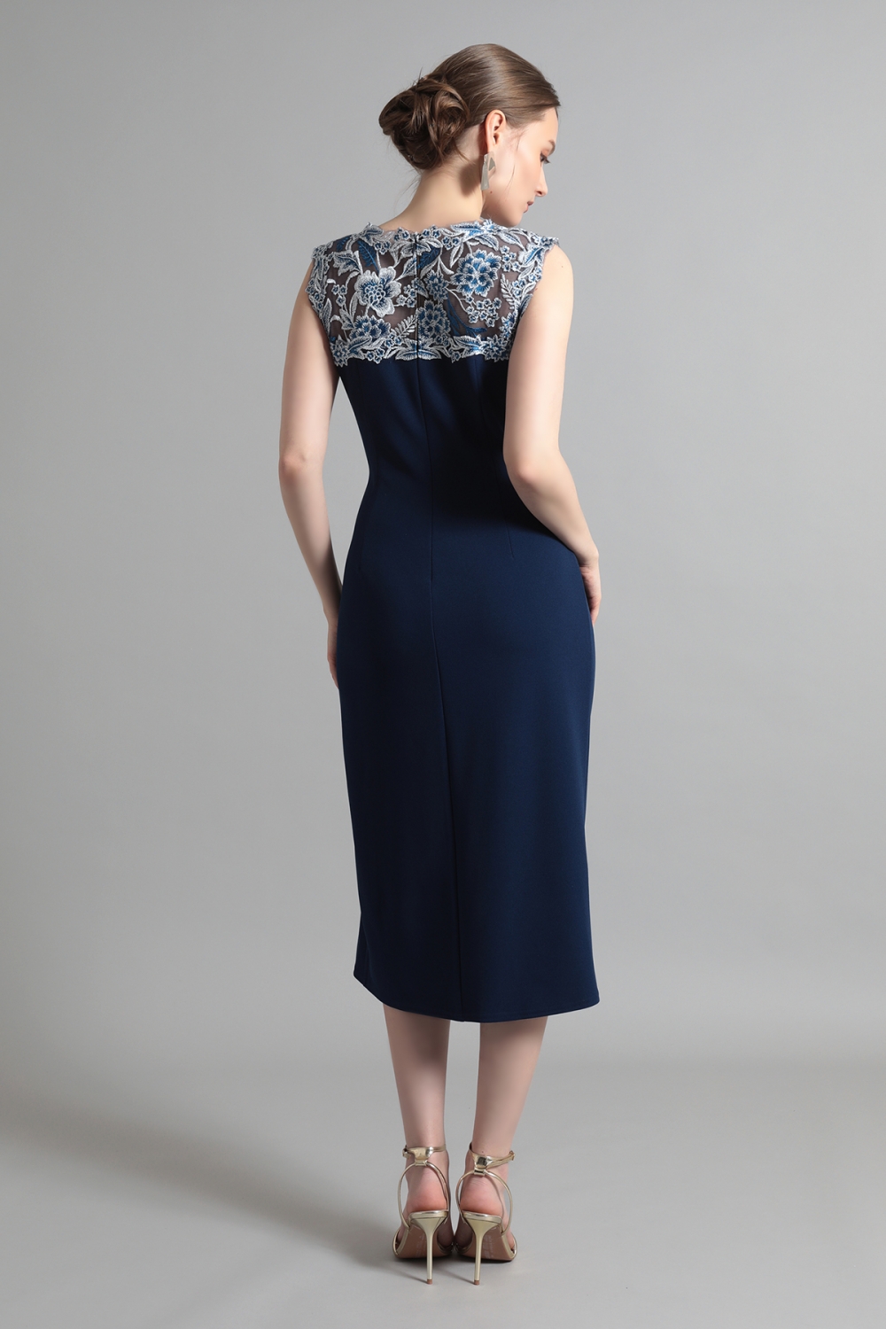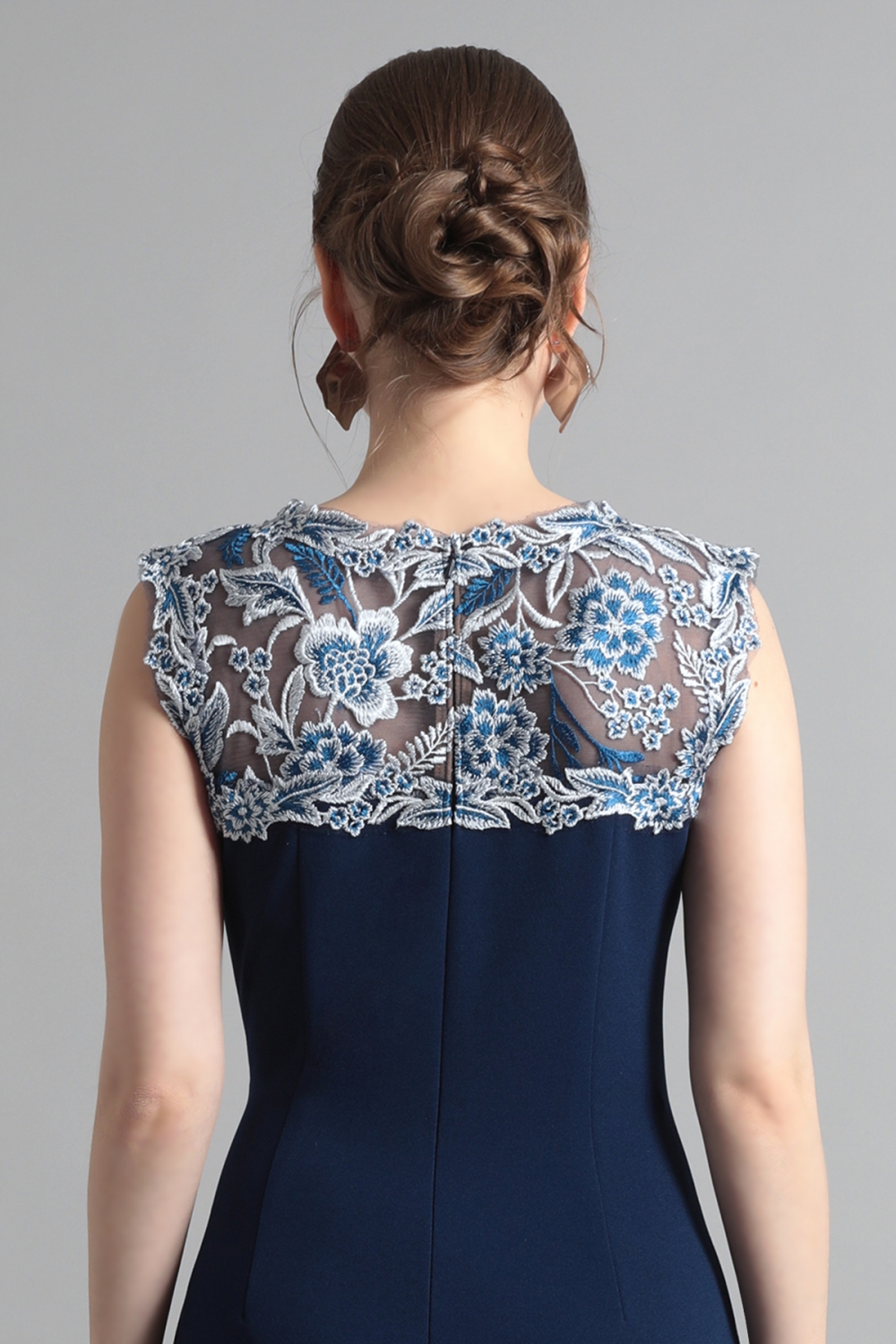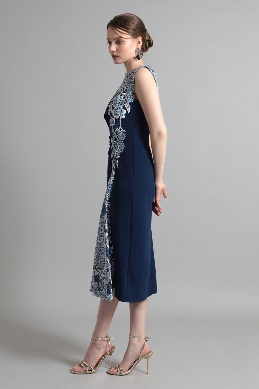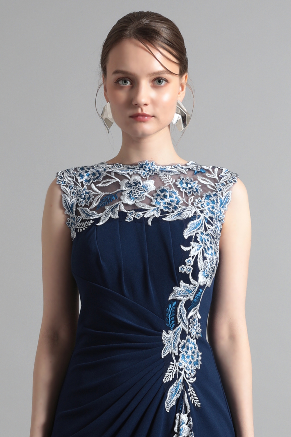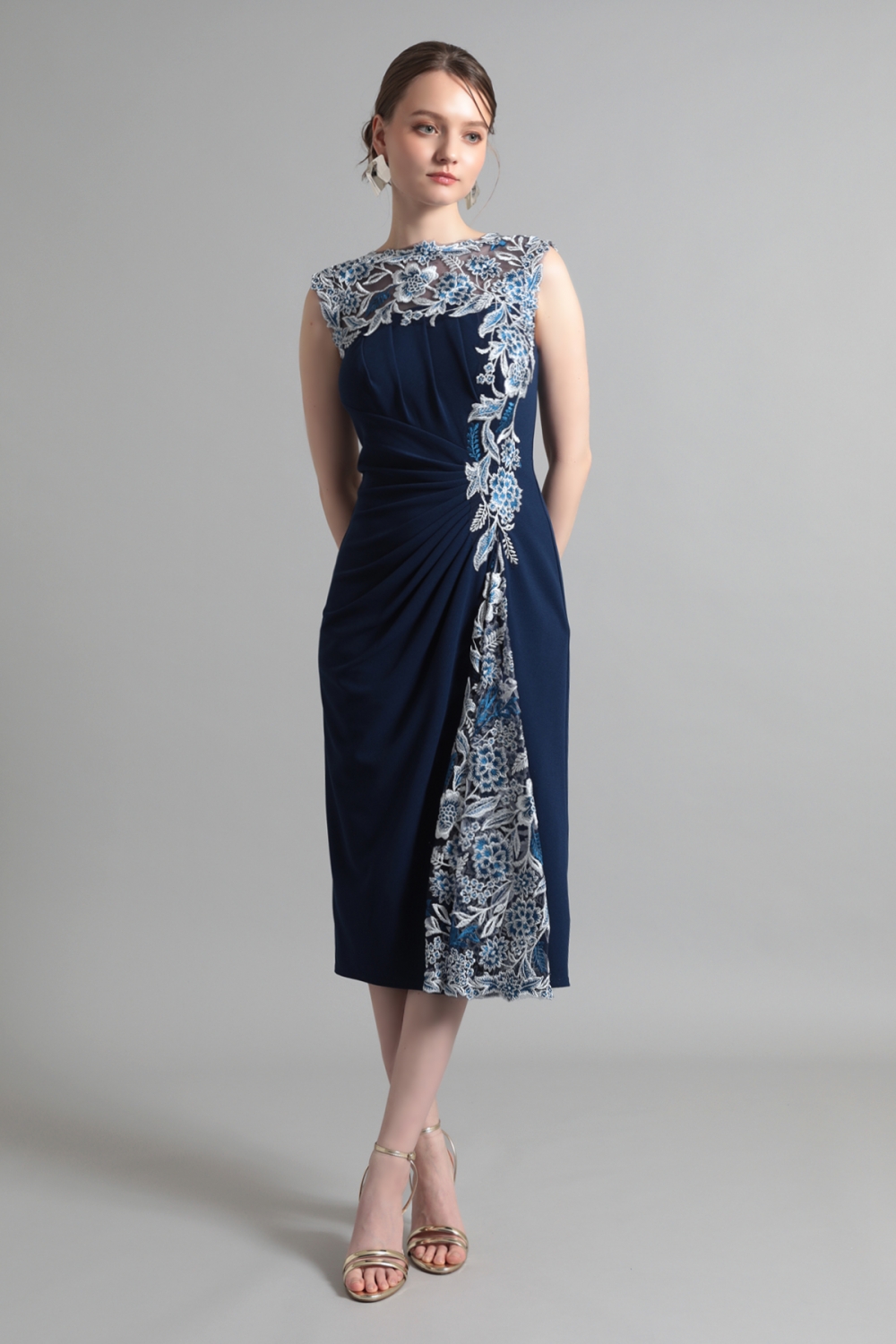 落ち着いたネイビーカラーと繊細なレース刺繍が調和したミディドレス。ネックラインから流れるように施されたフローラルモチーフが視線を引き寄せ、サイドに寄せたドレープが立体感のある美しいシルエットを描きます。涼やかでクリーンな印象の中に、気品を漂わせる一着です。