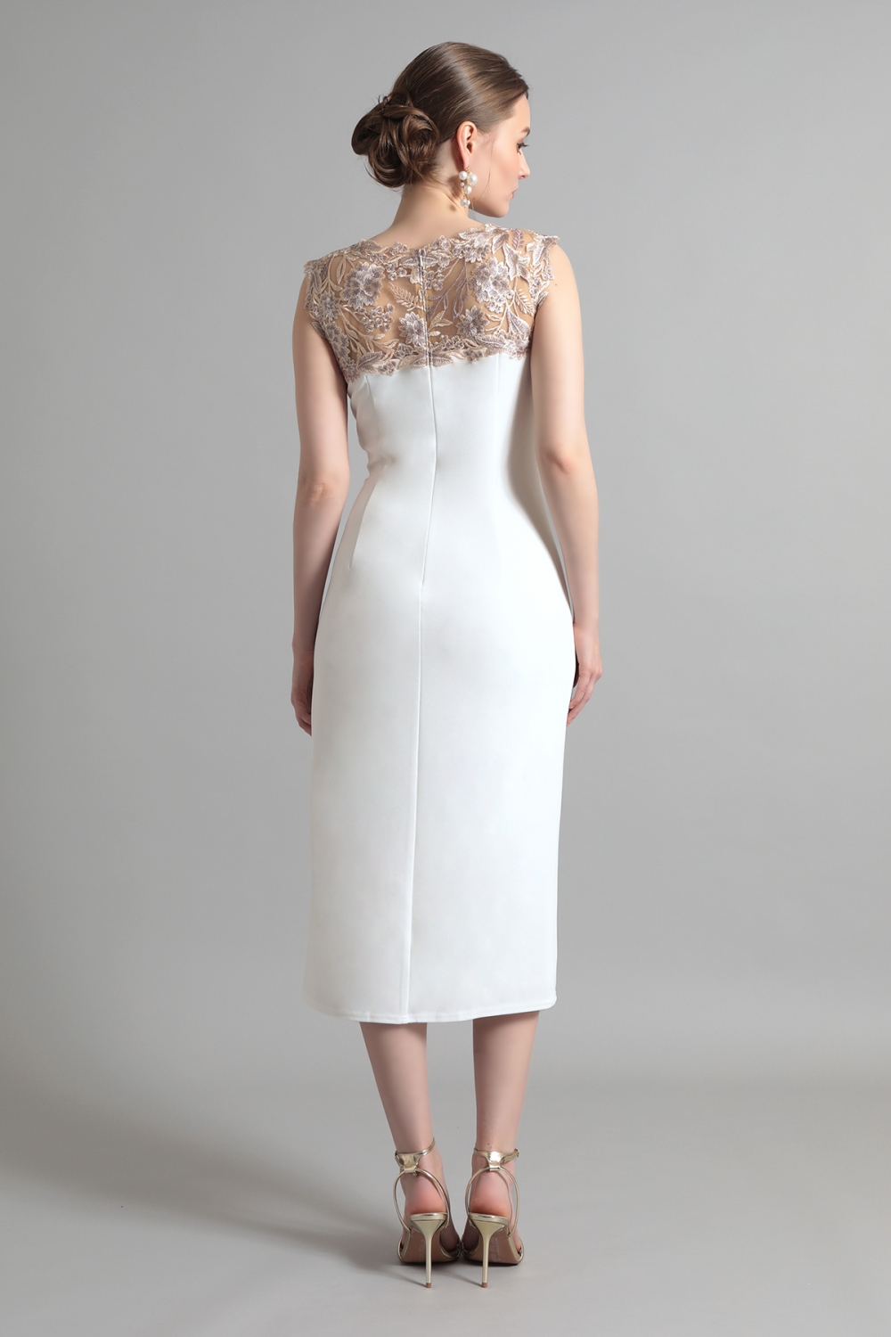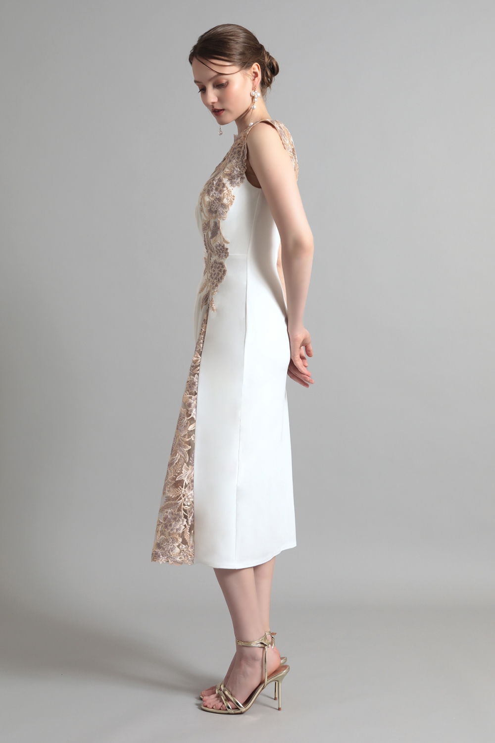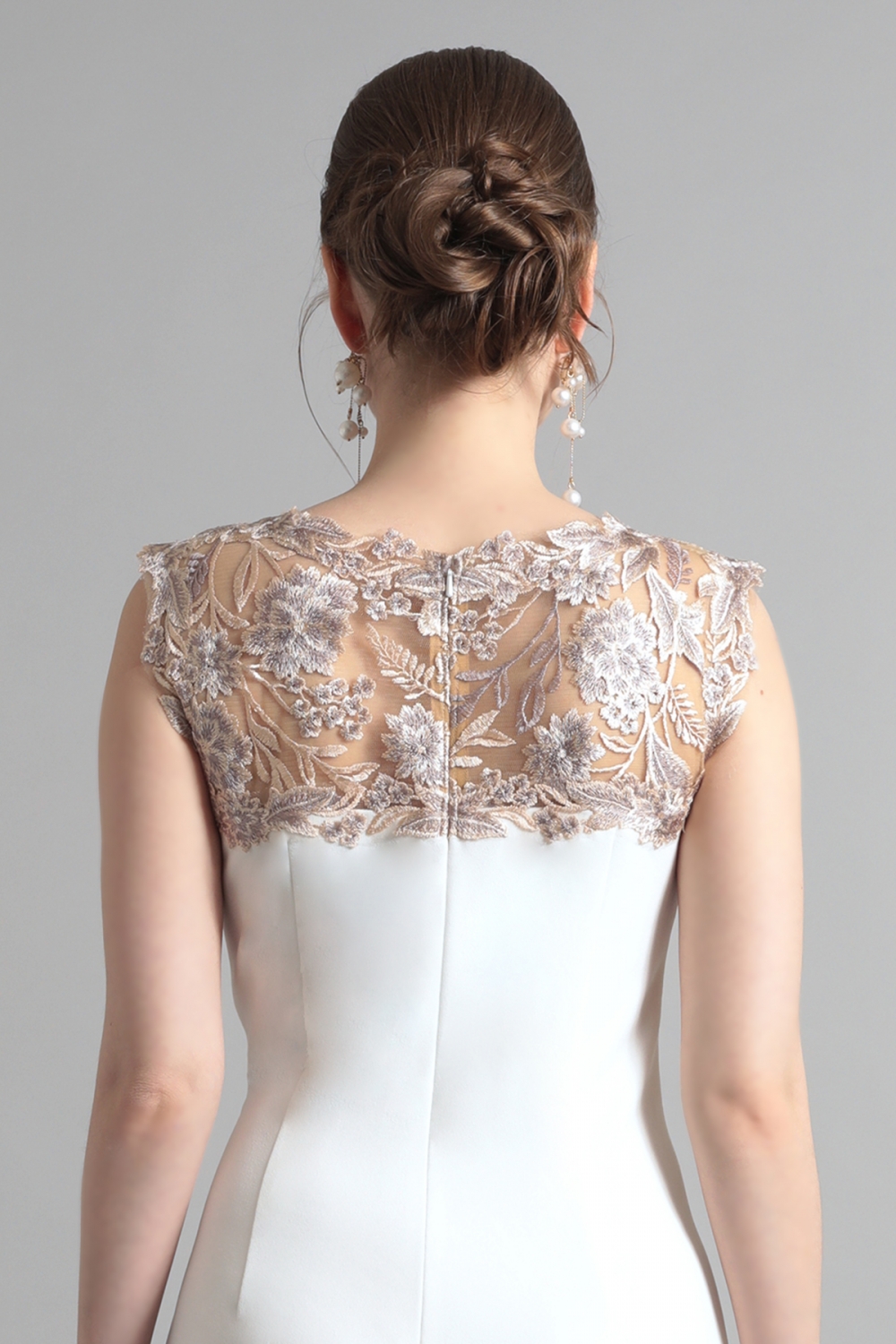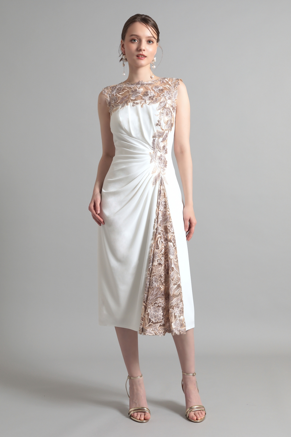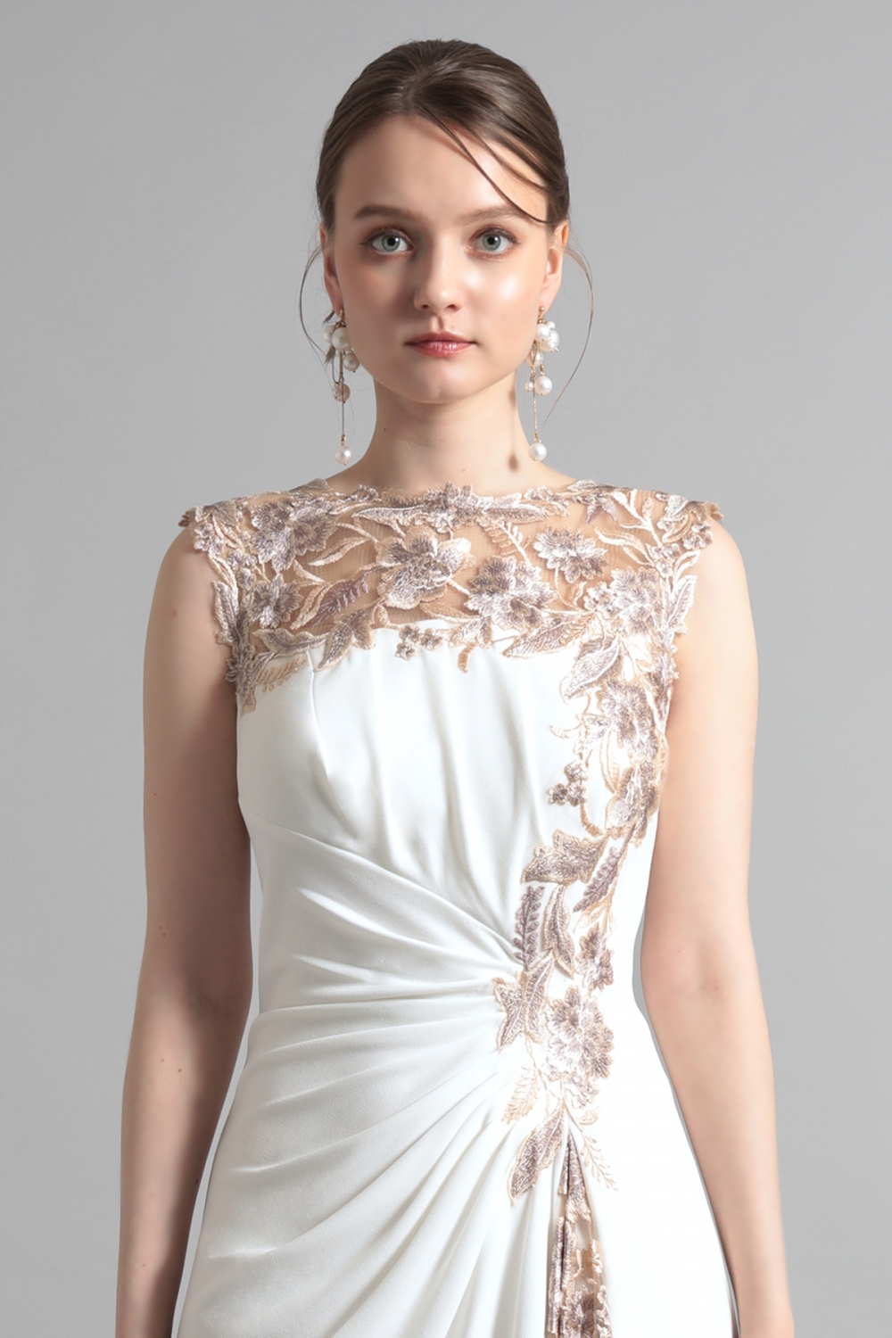やわらかなアイボリートーンに、繊細なゴールドベージュの刺繍が映えるエレガントなドレス。透け感のあるヨーク部分から流れるようにあしらわれたフローラルモチーフが、顔まわりに華やぎを添えます。サイドに寄せたドレープが立体感のある美しいシルエットを描き、スカートに施された刺繍パネルが動きに表情を与えます。柔らかな気品をまとった、端正なスタイルが完成します