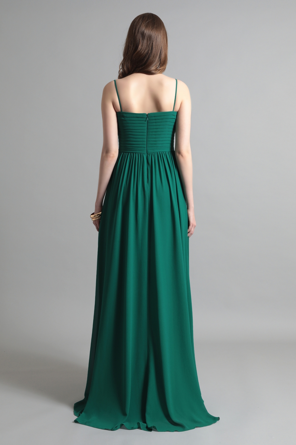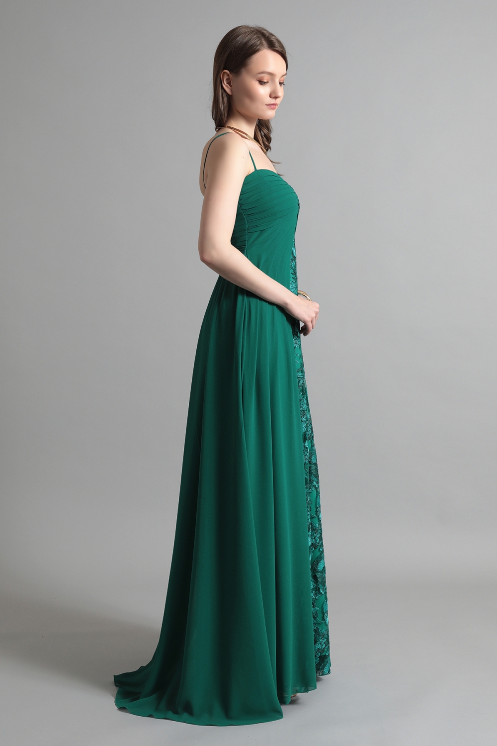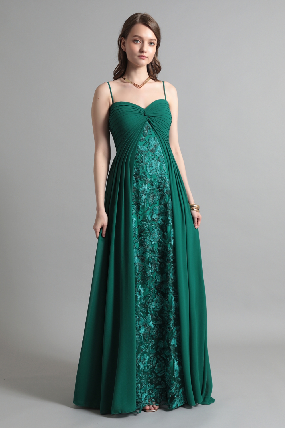 センターにあしらわれた繊細なレースが印象的な、エメラルドグリーンのロングドレス。胸元から放射状に広がるタックが、立体的な美しさと動きを生み出し、優雅なシルエットを描きます。シンプルなストラップと緻密なレースのコントラストが、洗練された印象を引き立て、柔らかく流れる生地が歩くたびに揺れる姿は、纏う人に気品と華やぎを添えます。