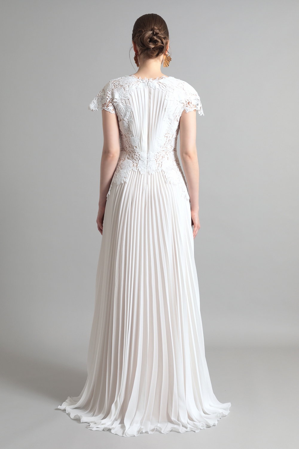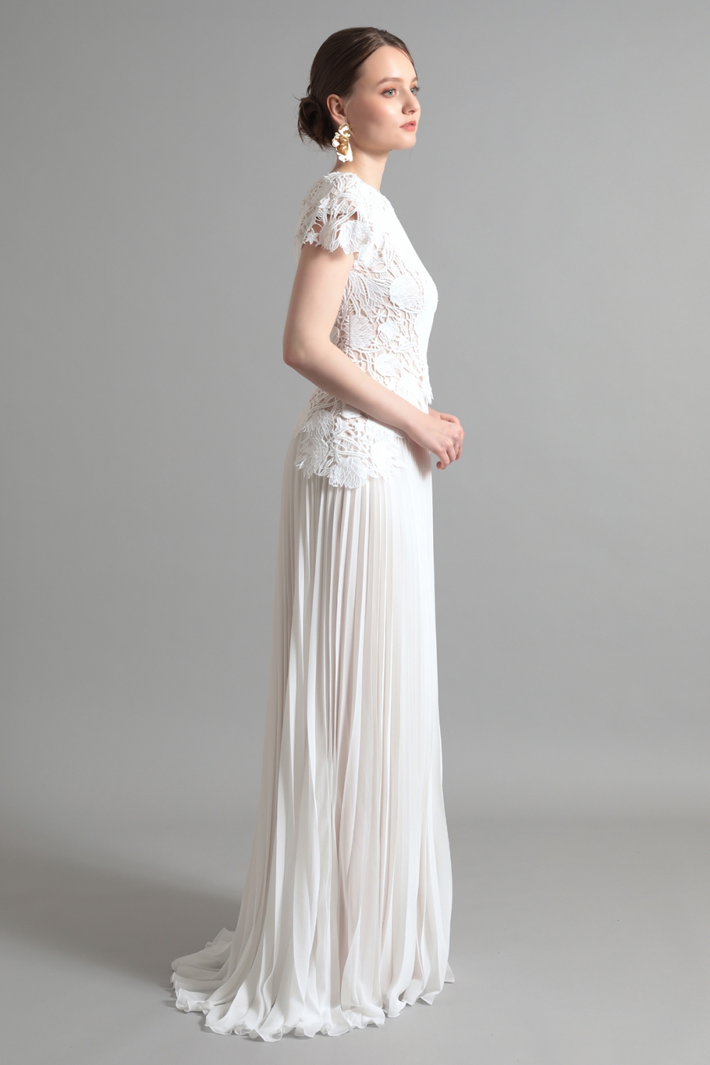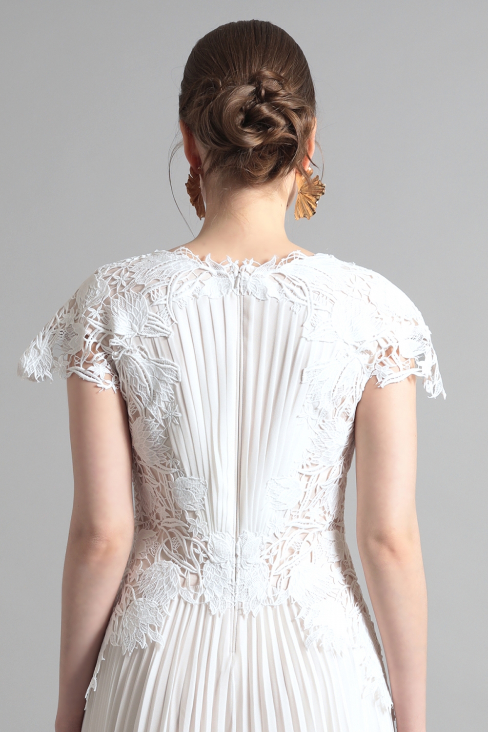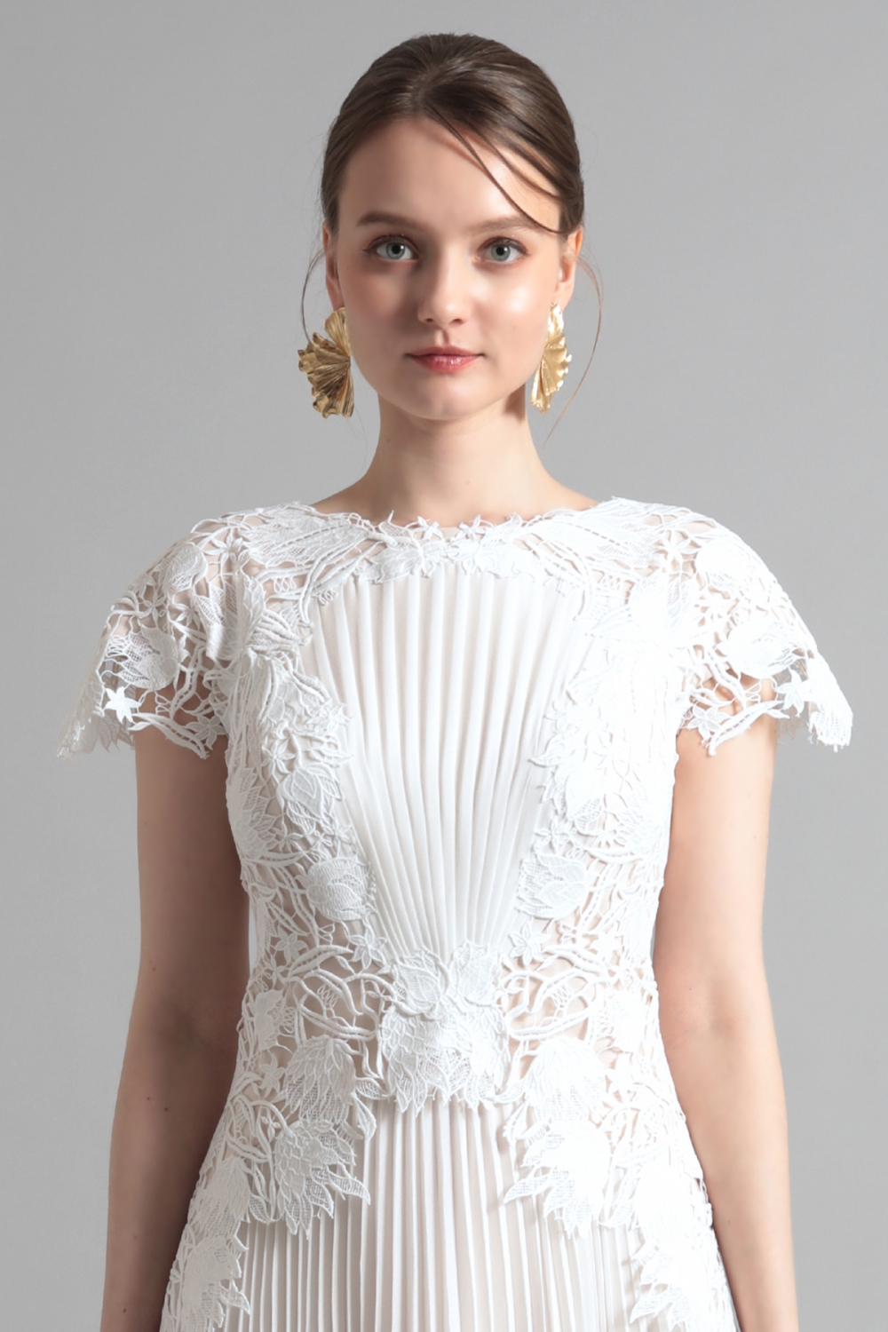 繊細なレースと優雅なプリーツが美しく調和、洗練されたロングドレス。トップにはフラワーモチーフのレースを贅沢にあしらい、品格を感じさせる仕上がりに。縦のラインを強調するプリーツは、動きに合わせてしなやかに揺れ、軽やかで優雅な印象を演出します。高めのウエスト位置と程よいフィット感がスタイルアップも叶え、特別なシーンを格調高く彩る一着です。