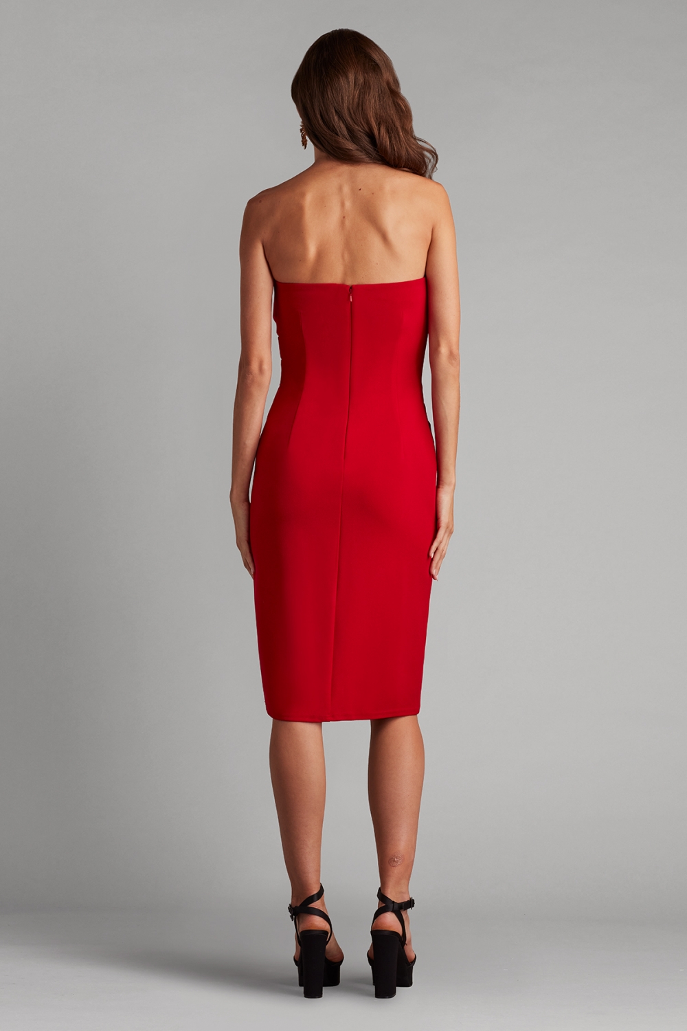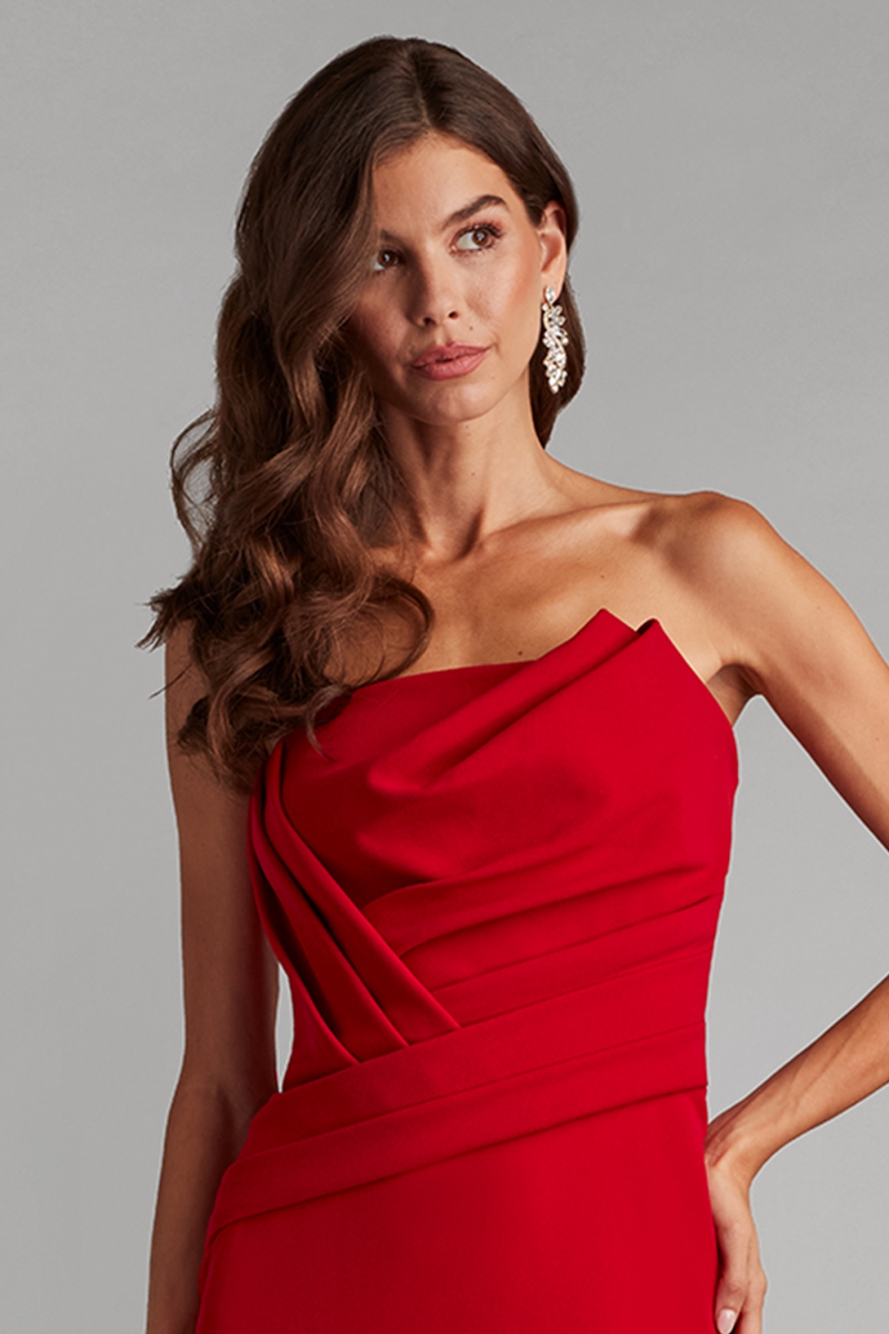 デコルテを美しく際立たせる大胆なカッティングのベアトップドレスは、鮮やかな赤が印象的です。ボディラインに沿って流れる立体的なドレープが陰影を生み、洗練された存在感を演出します。サイドにはボーンを内蔵し、しっかりとしたフィット感と安定感を実現。ウエストからヒップにかけて斜めに走るタックがシルエットを引き締め、シンプルながらも印象的な華やぎを添えます。