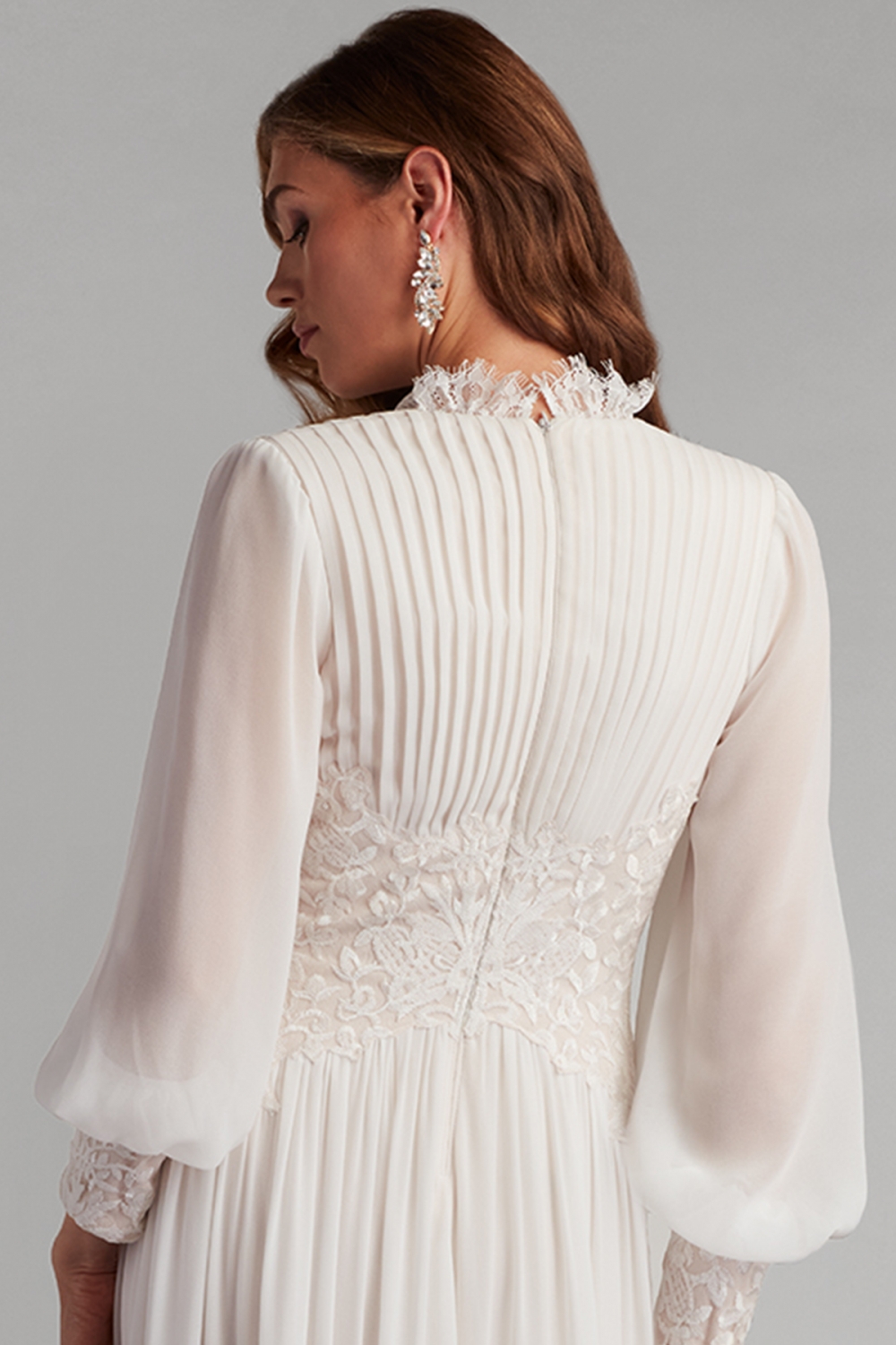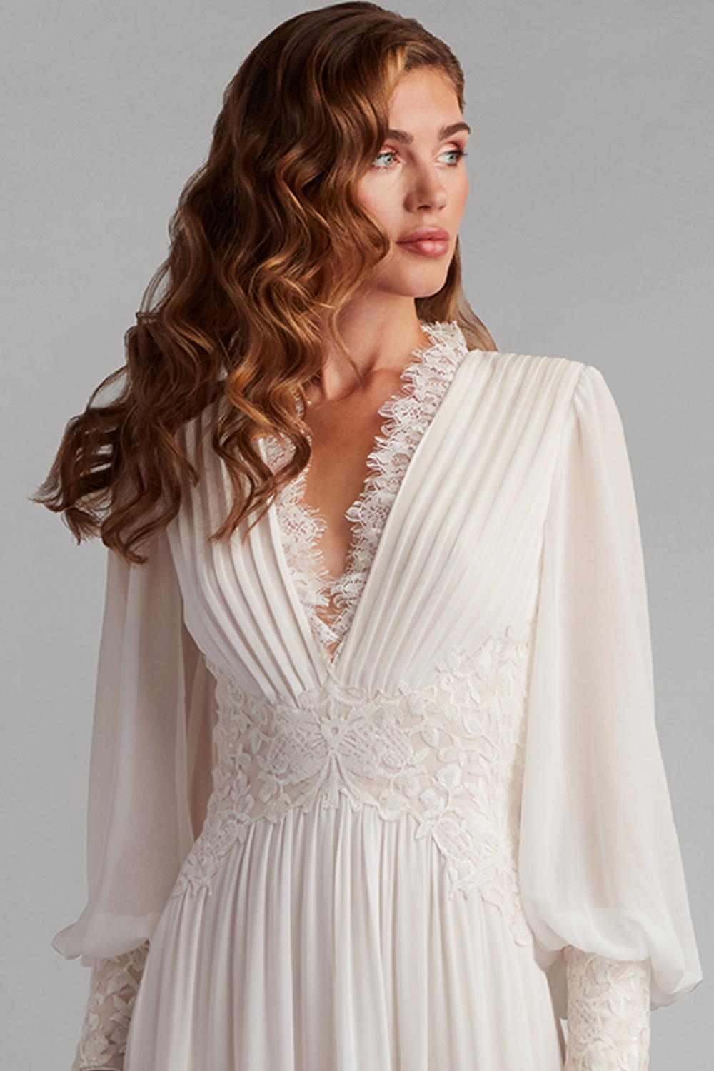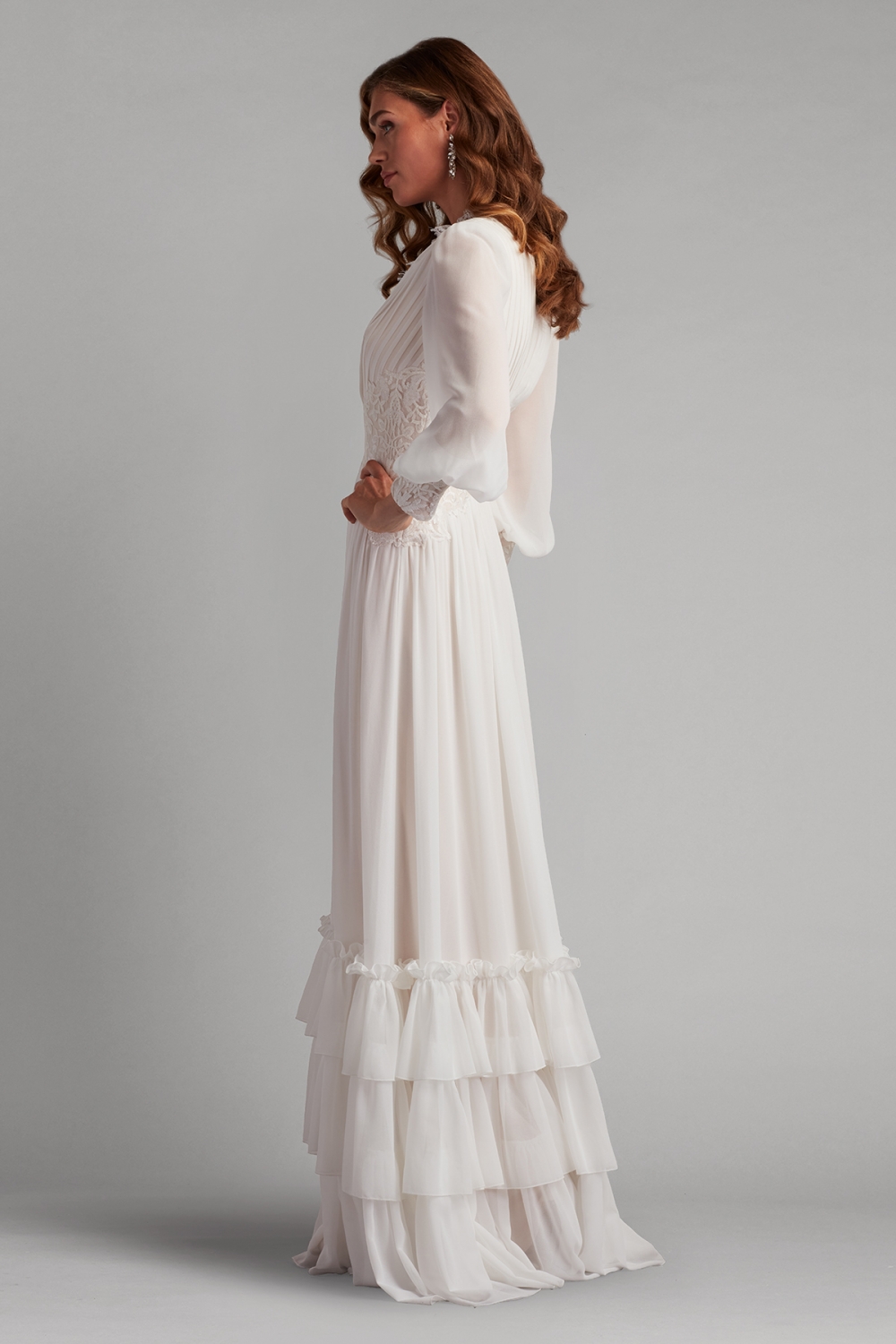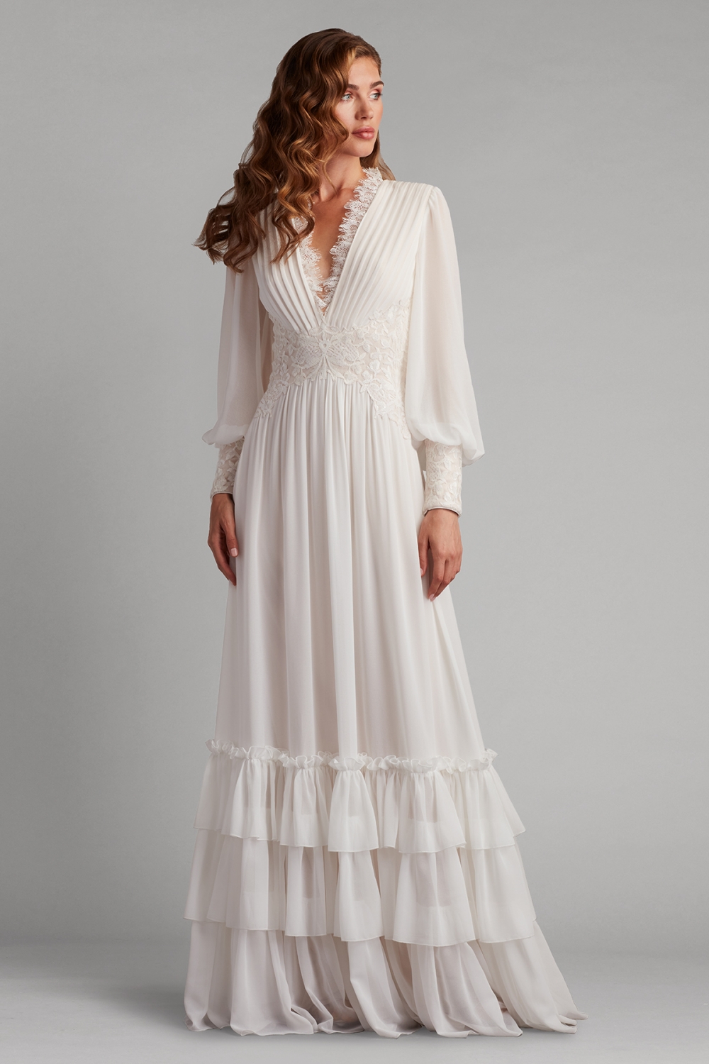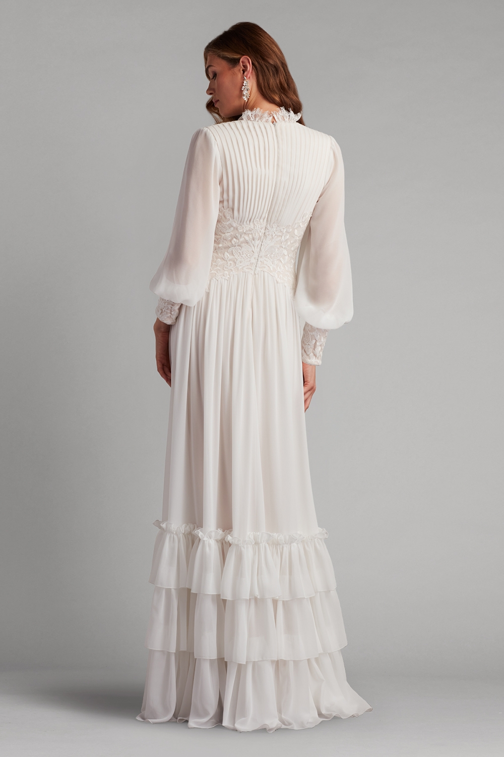 ロマンティックな気品を纏う、エフォートレスなドレス。繊細なプリーツが美しいVネックラインを形作り、スカラップレースの縁取りがデコルテを優雅に引き立てます。ウエストは立体感のあるフローラル刺繍で彩られ、女性らしいシルエットを演出。ふんわりと膨らむシフォンのスリーブが軽やかな動きを添えます。スカートはティアードフリルが重なり合い、歩くたびに優雅に揺れる印象的な仕上がりです。