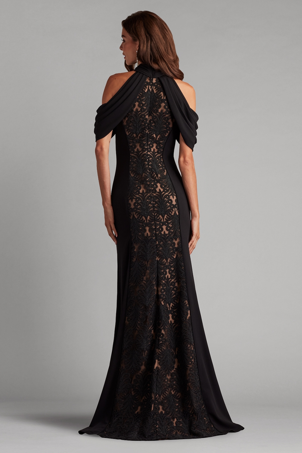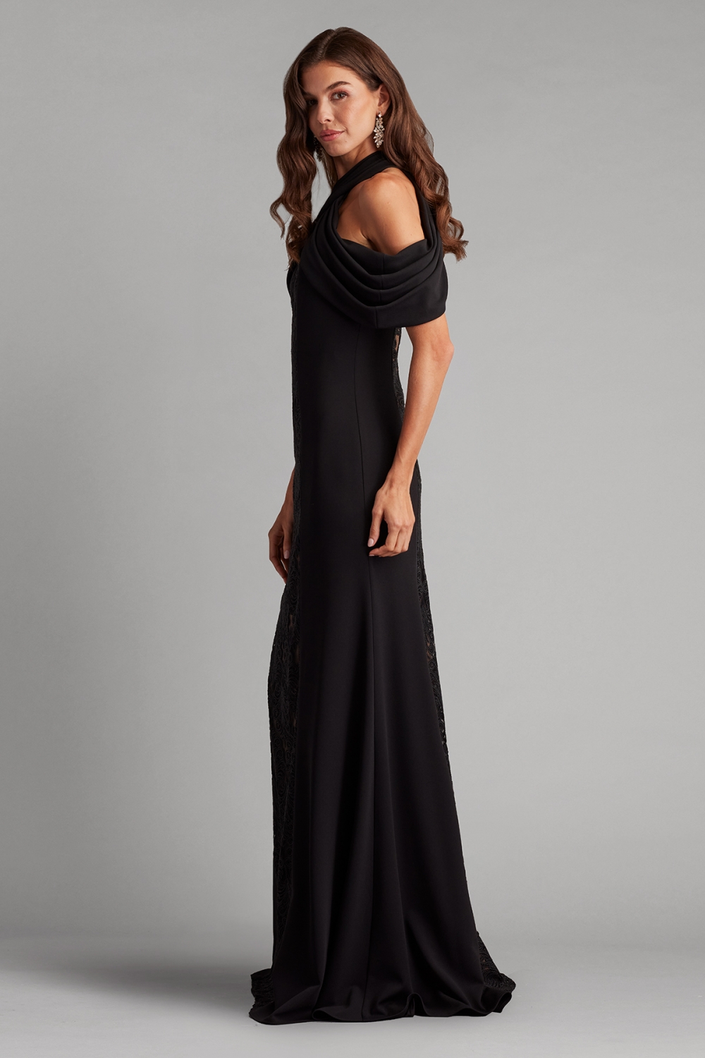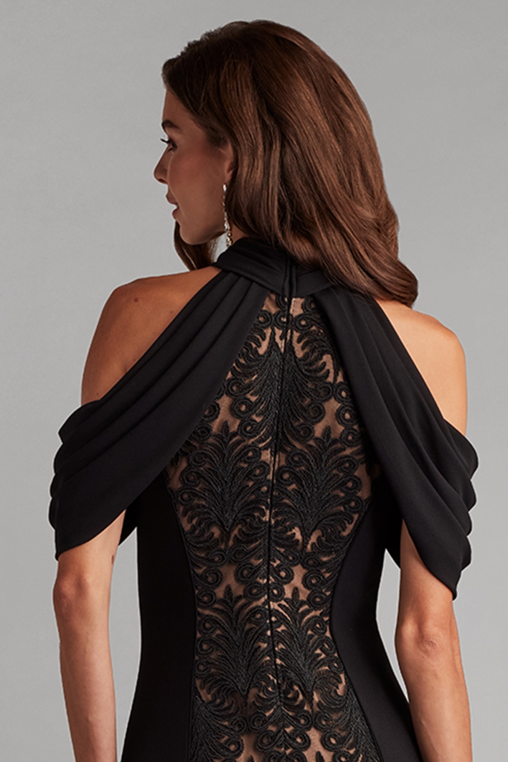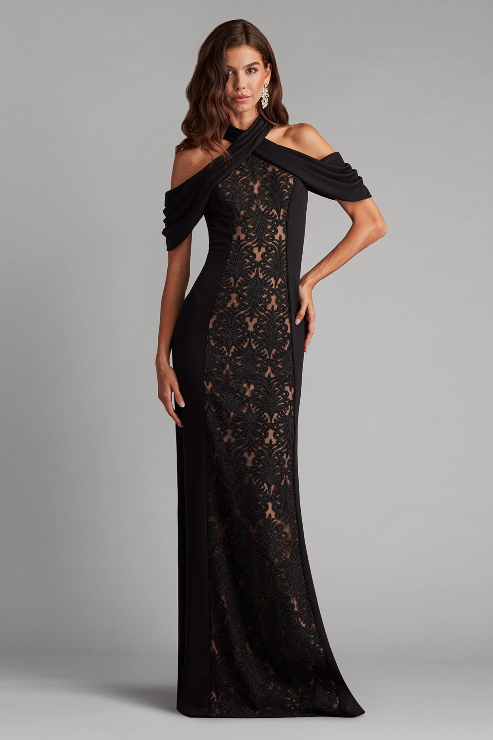 エレガンスとセンシュアリティを融合させ、洗練されたロングドレス。フロントに施された繊細なレースパネルは、透け感のあるベースに刺繍を重ね、優美な存在感を放ちます。肩元はクロスオフショルダーデザインで、デコルテを美しく引き立てながら、袖のドレープが柔らかな動きを添えます。ボディラインを流れるように沿うシルエットがスタイルアップを叶え、特別な夜にふさわしいドラマティックな一着です。