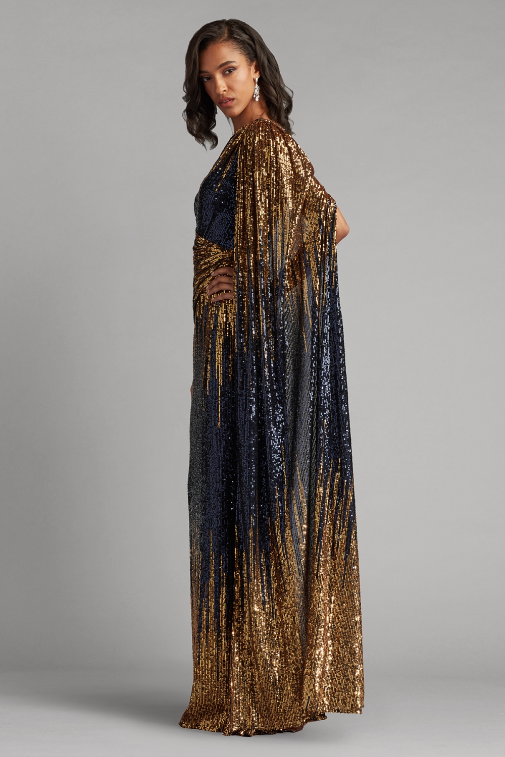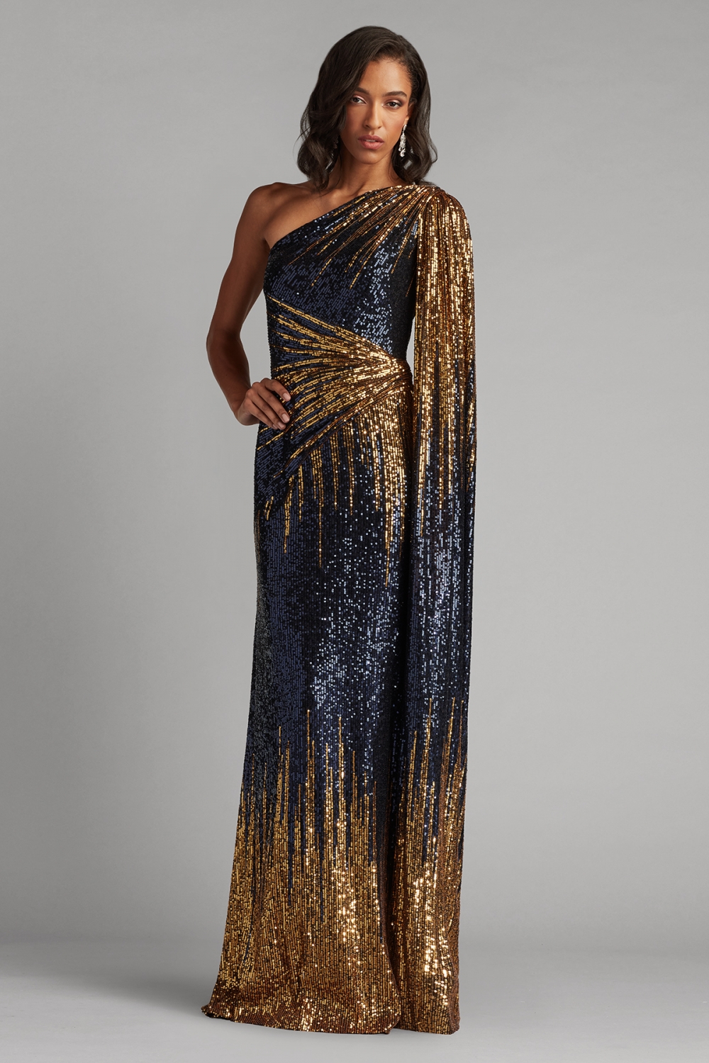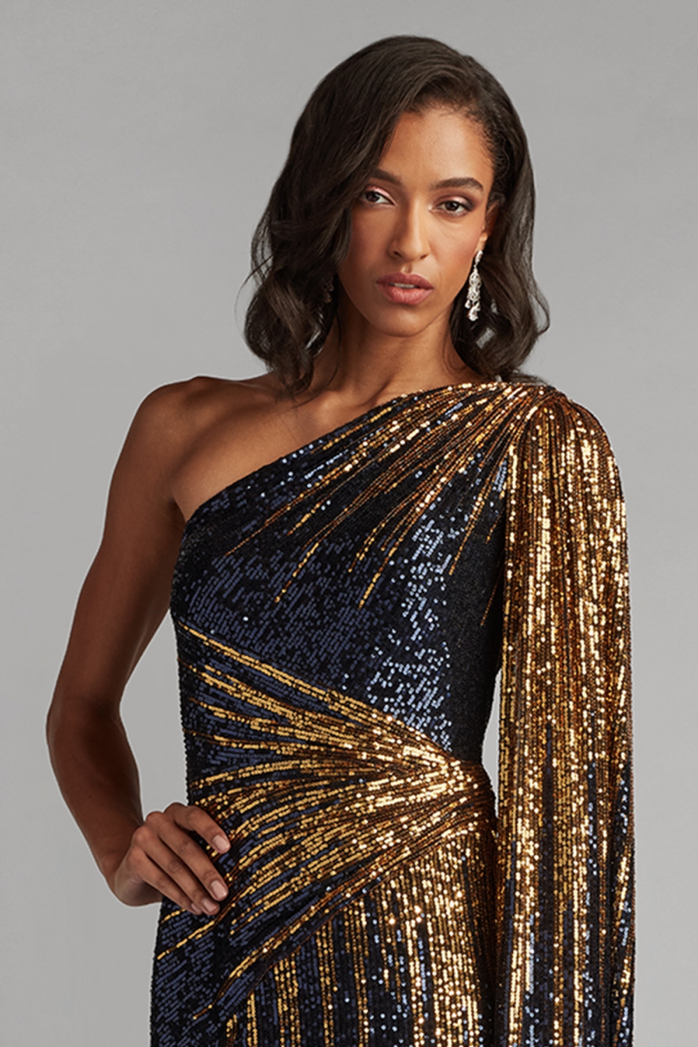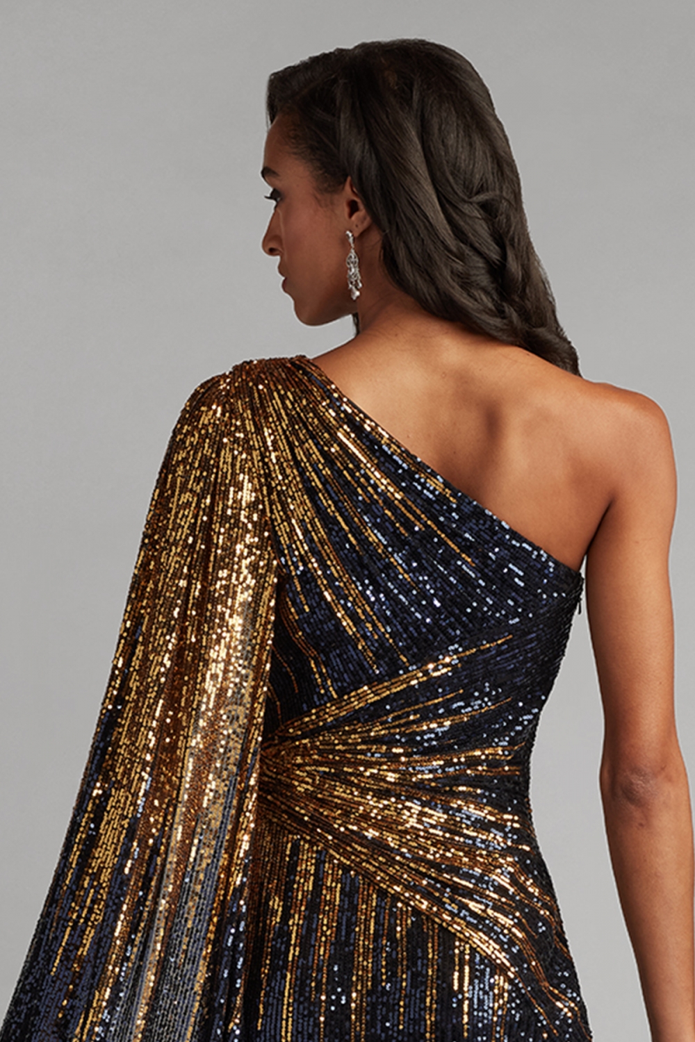 深く澄んだネイビーに、ゴールドの光が流れるように配置されたスパンコールが、洗練とドラマを同時に纏わせます。アシンメトリーなワンショルダーラインは、女性の強さとしなやかさを象徴しているかのよう。ボディラインに沿って計算されたドレープが、まるで光を操るように動きのたびに表情を変えます。 大胆でありながら気品を失わないデザインは、自信を持って自分を表現したい女性にふさわしく、あなたという存在を、最も美しく照らす一着です。