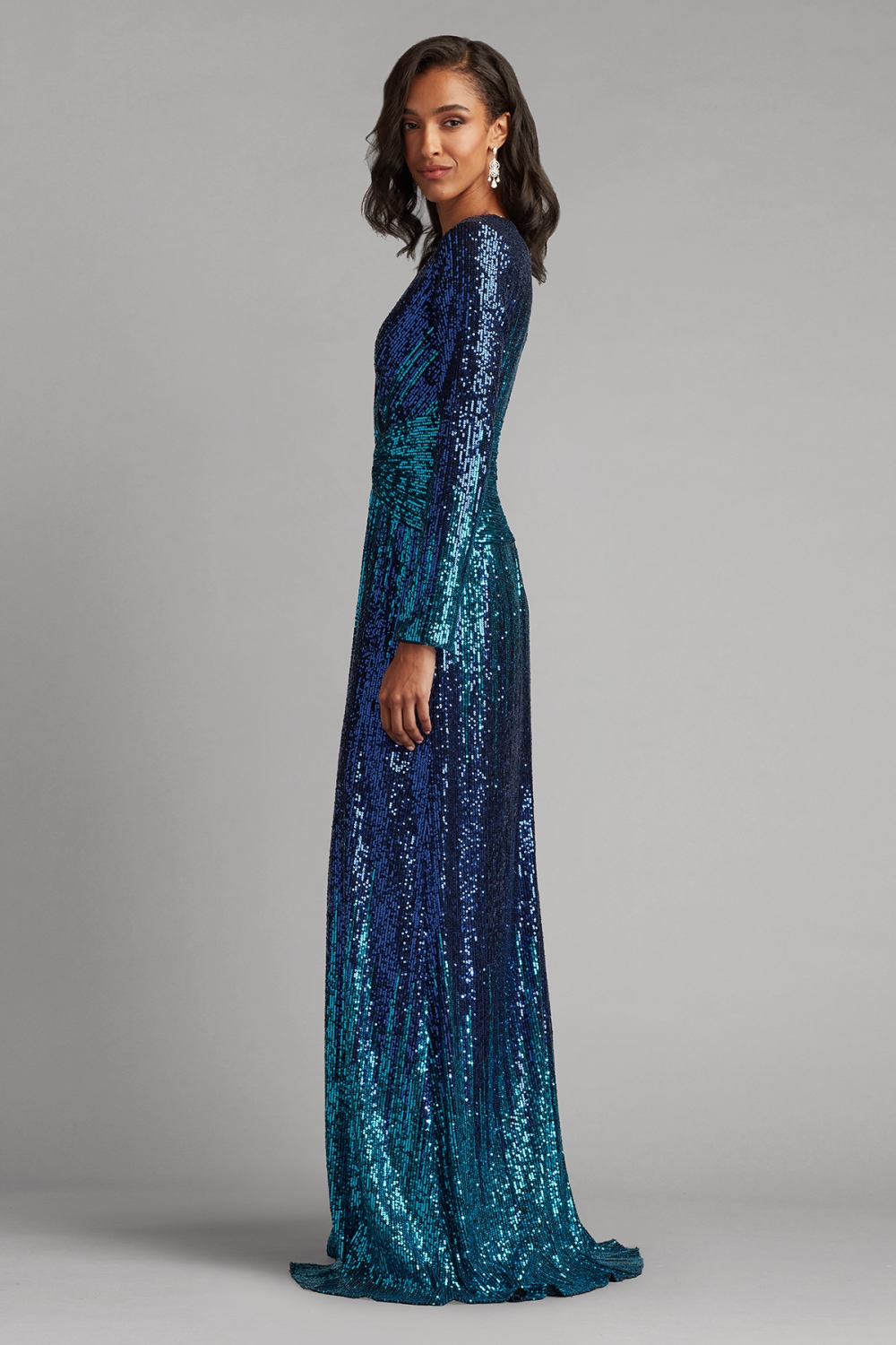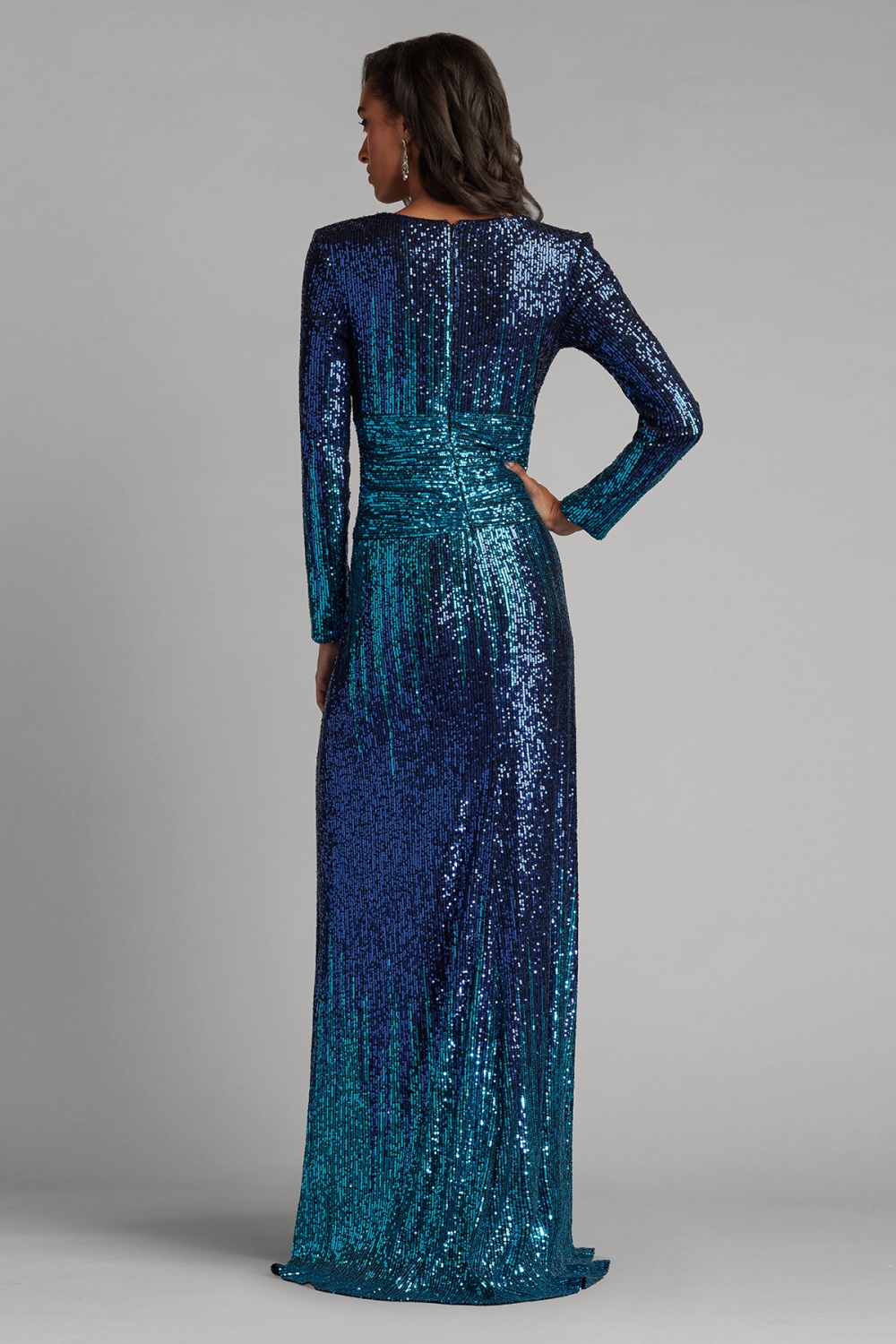 幻想的なブルーのグラデーションが魅力のロングドレス。見る角度や光の当たり方で表情を変えるスパンコールが、まるで波間に揺らめく月光のように繊細な輝きを放ちます。胸元はVネックのクロスデザインでデコルテを美しく見せ、ウエストのドレープが自然にボディラインを引き締める計算されたシルエット。さらにロングスリーブがエレガントな印象を添え、華やかさの中に上品さを感じさせます。まさにステージやパーティーの主役にふさわしい、ラグジュアリーな輝きを纏う一着です。