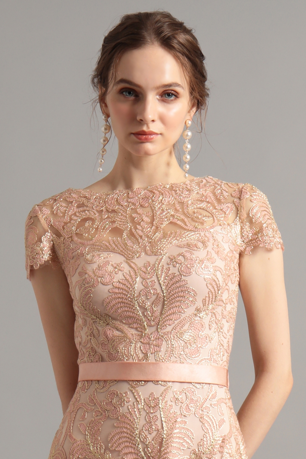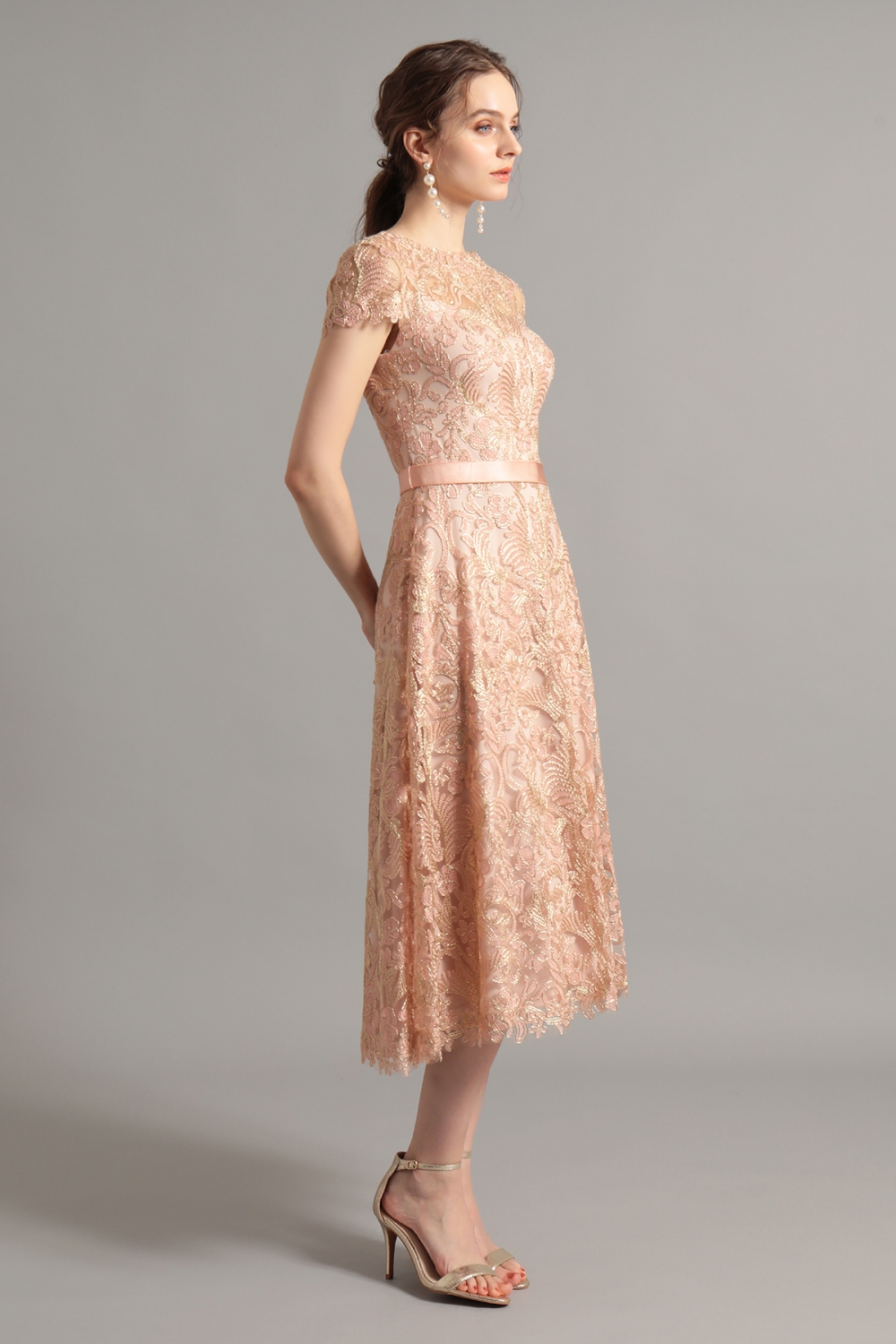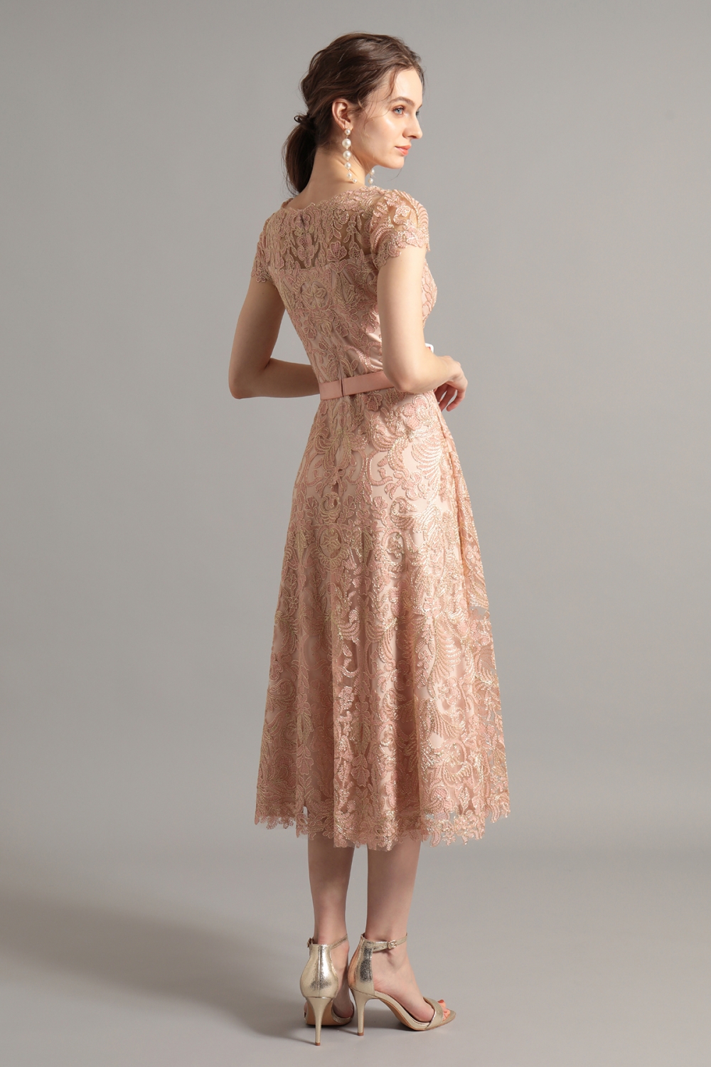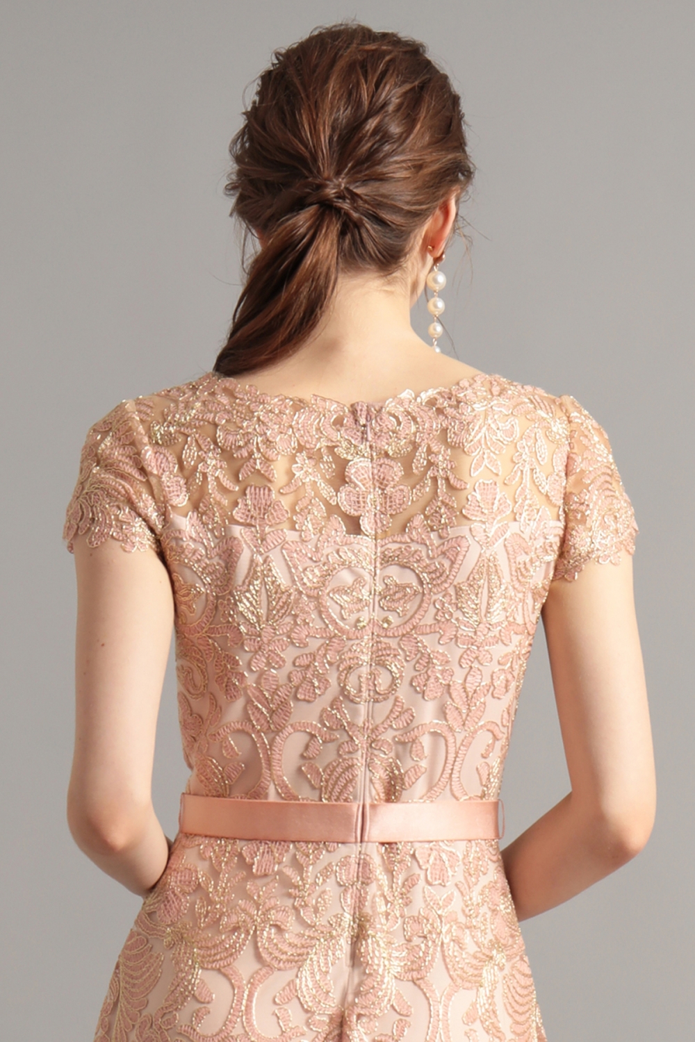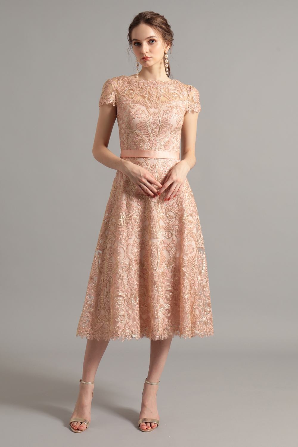 繊細な刺繍レースが全身を包み込む、華やかで気品あふれるフィット&フレアドレス。柔らかなピンクベージュのトーンが肌になじみ、上品な印象を引き立てます。ハイウエスト位置のサテンリボンがアクセントで、脚長効果とスタイルアップを叶え、袖とデコルテ部分の透け感が軽やかさを演出します。パールアクセサリーとの相性も良く、ブライダルゲストやパーディなどのフォーマルシーンに最適です。